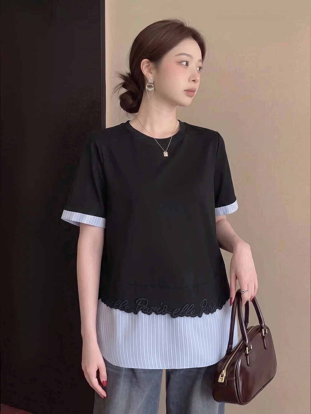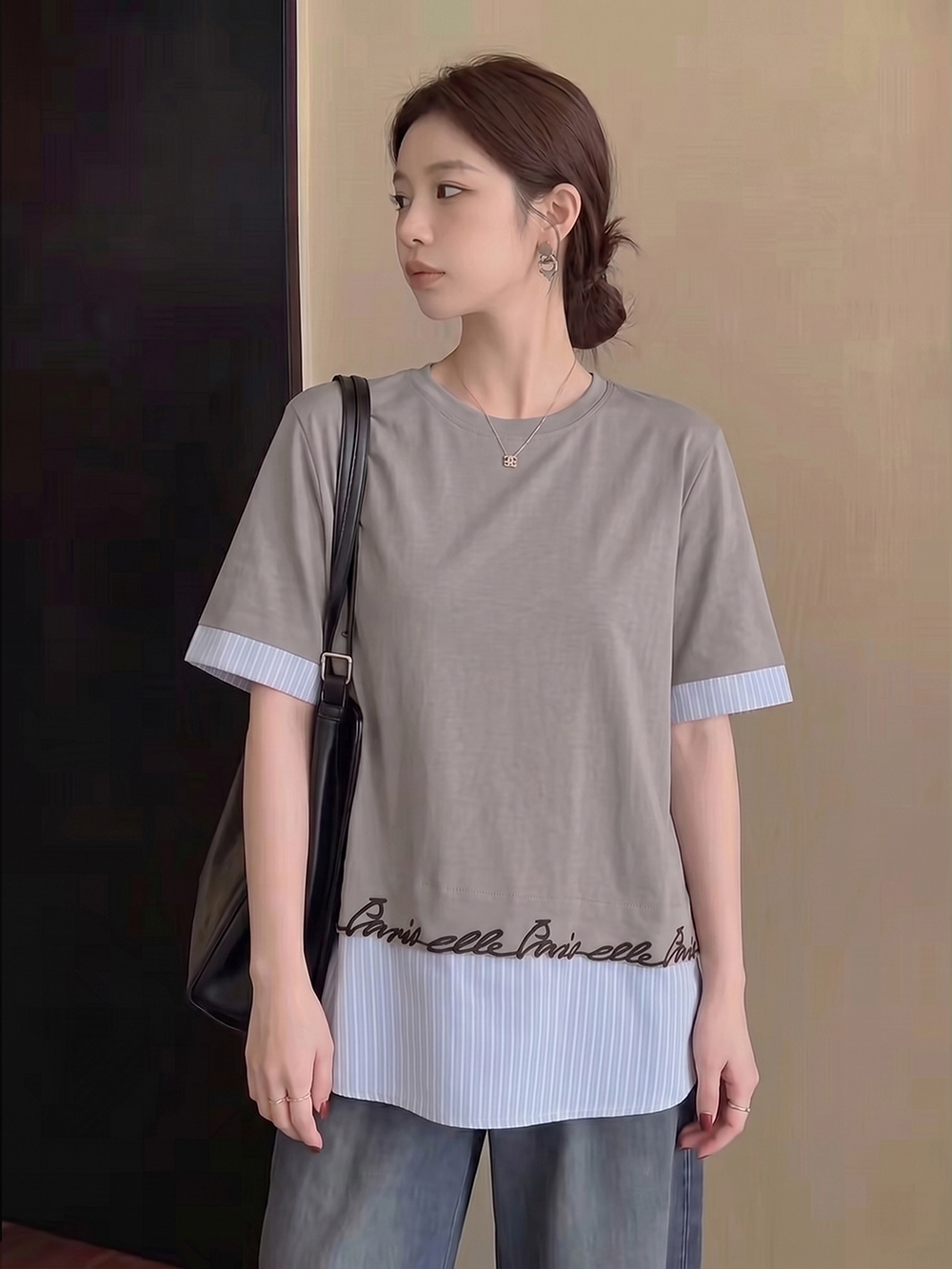 실사 여름 새로운 지방 mm 고급 센스 다용도 슬림해 보이는 페이크 레이어드 외국 가스 연령 감소 빅 사이즈 반팔 티셔츠