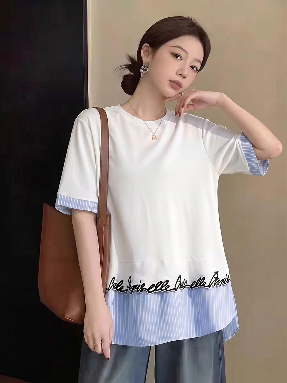 실사 빅 사이즈 여성 의류 여름 패션 미니멀리즘 패치워크 루즈핏 슬림해 보이는 지방 mm 캐주얼 표지 고기 반팔 티셔츠 맨위