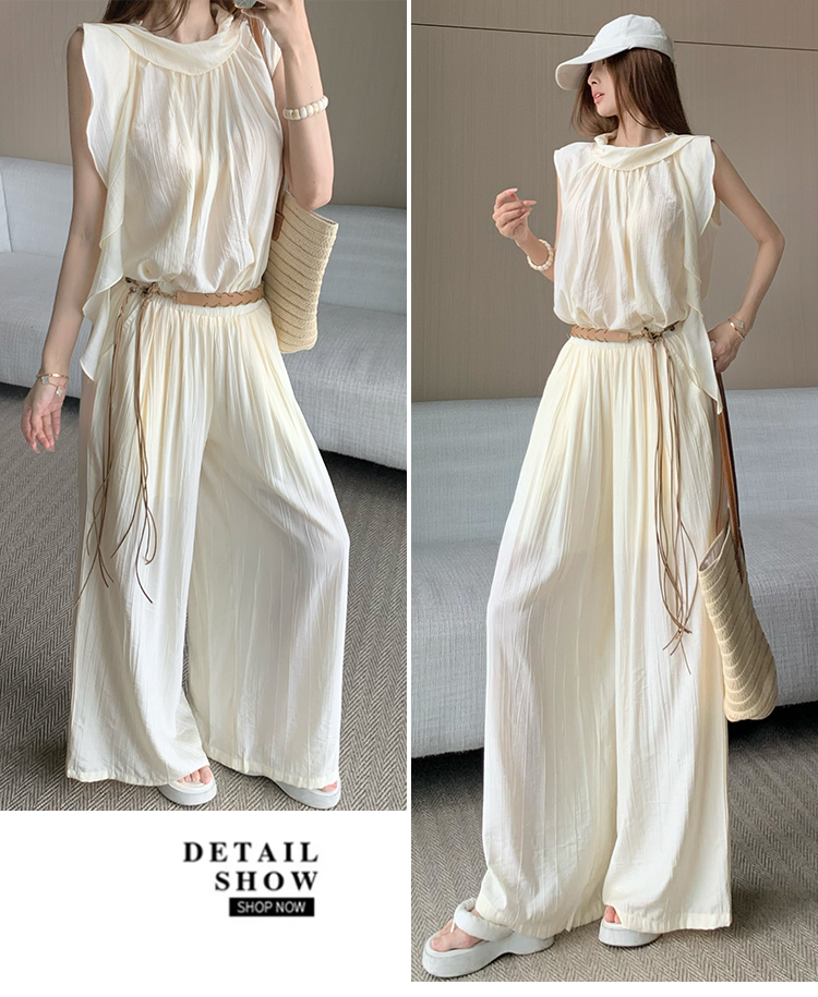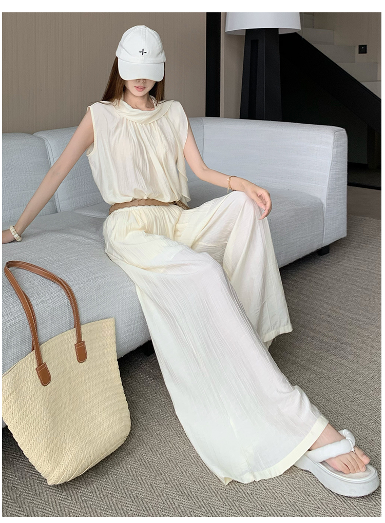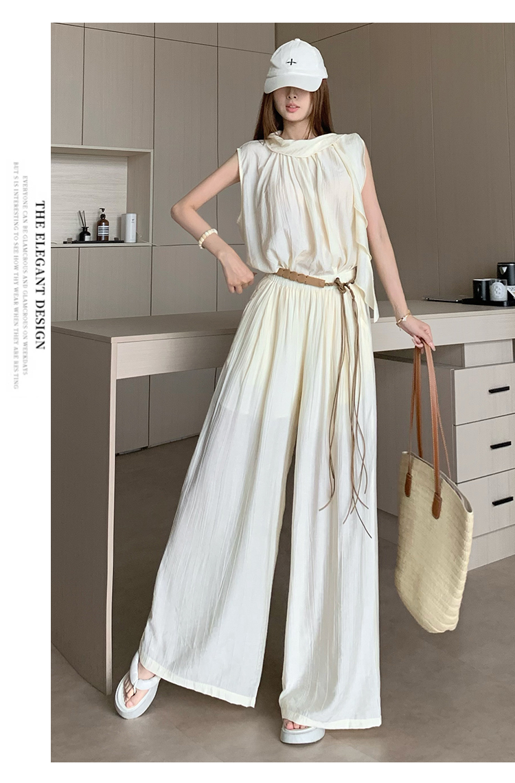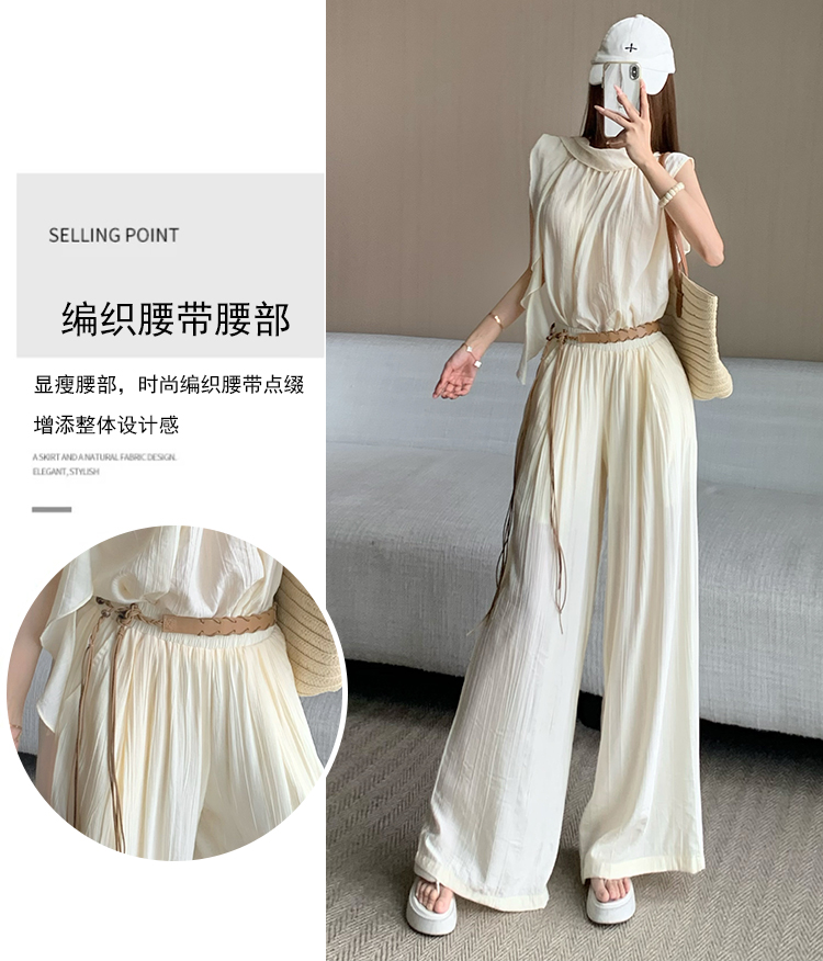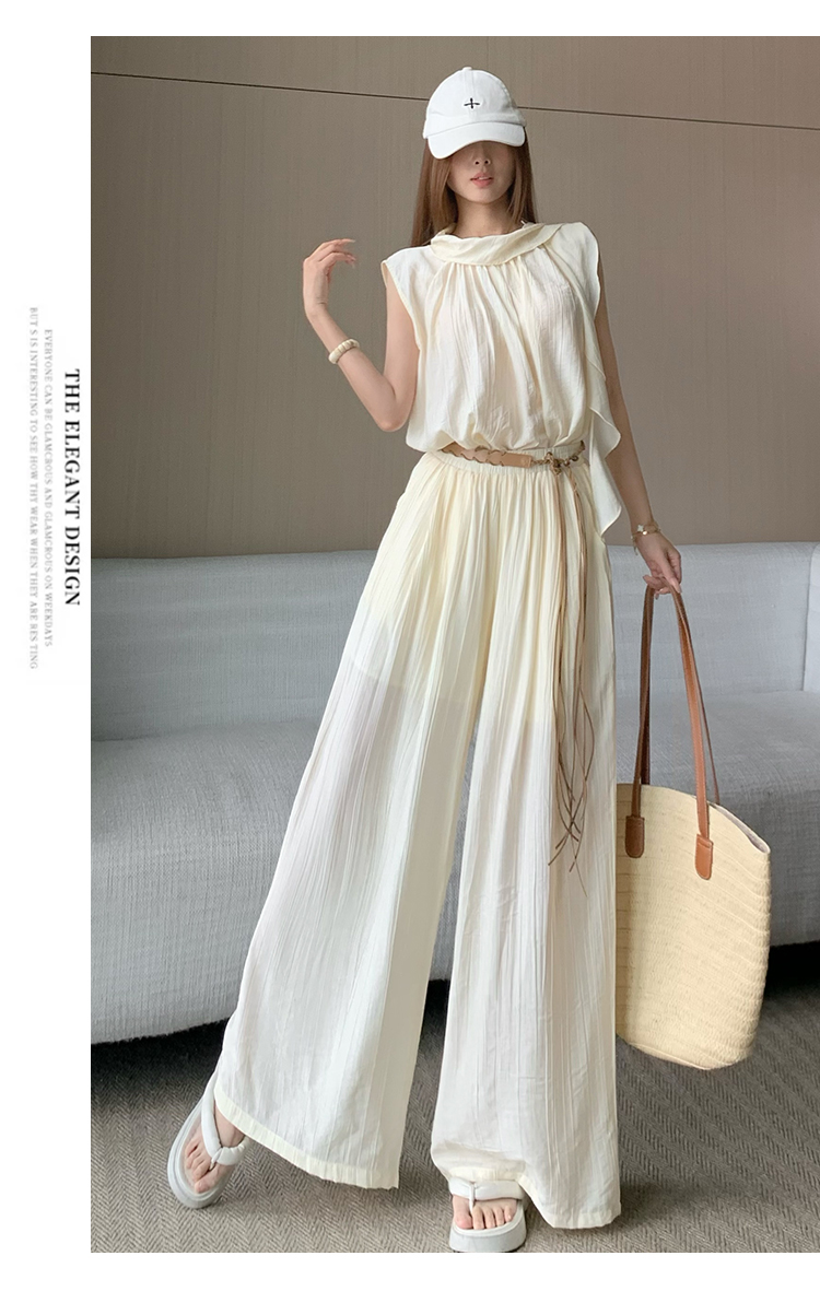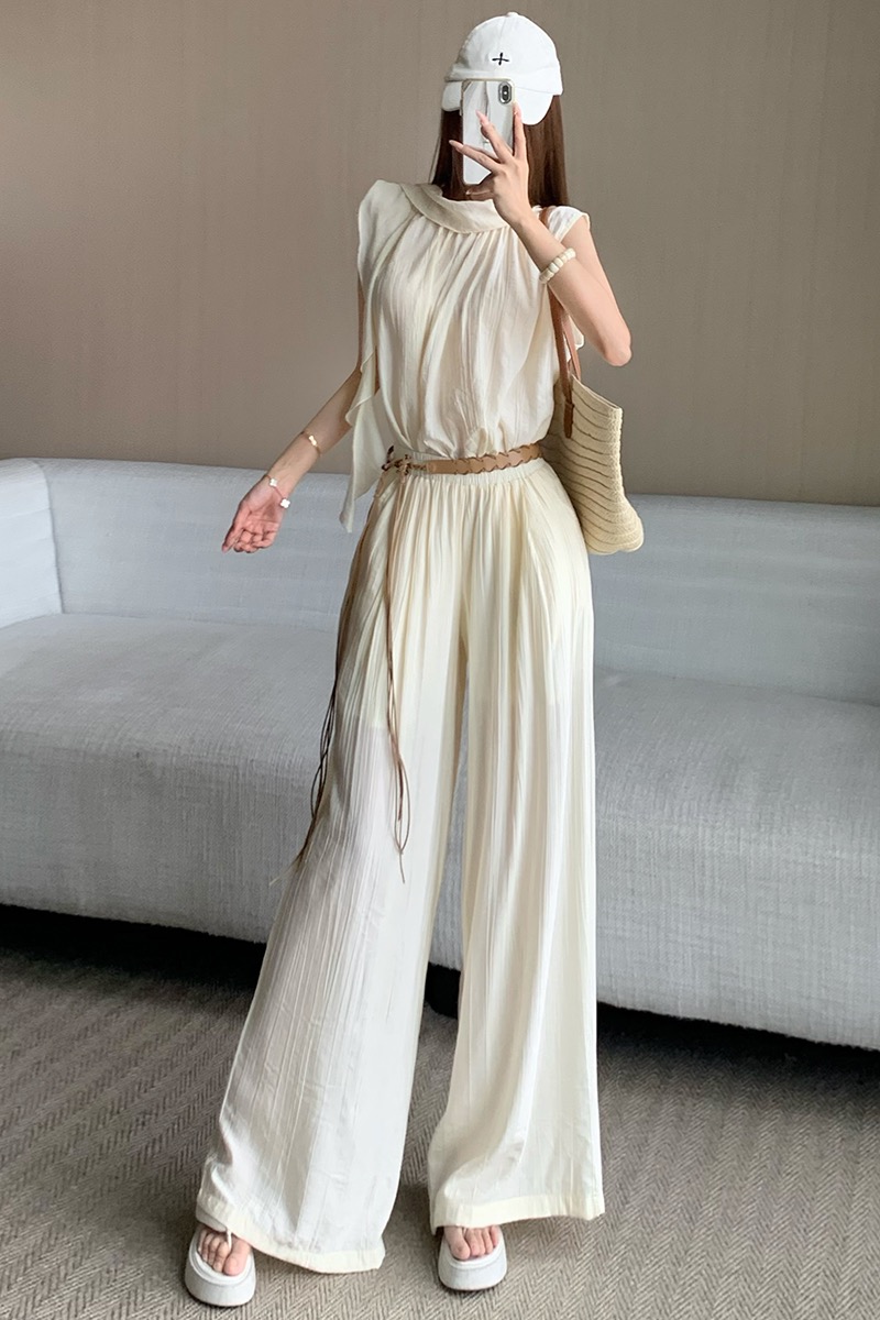 휴가 바람 고급 센스 세트 여성 여름 부드러운 바람 리본 단색 민소매 맨위 슬림해 보이는 와이드 레그 팬츠 투피스 세트