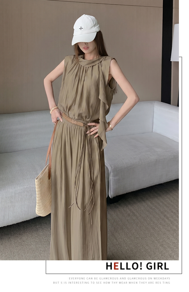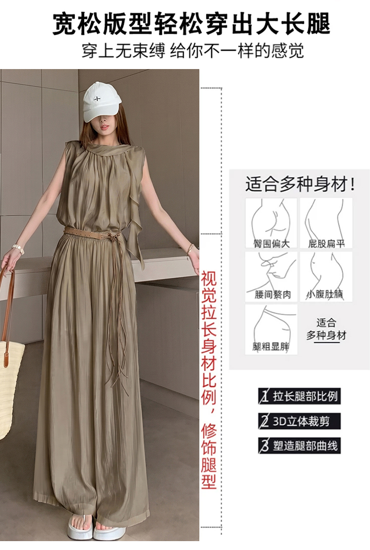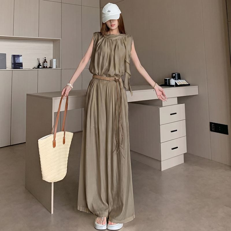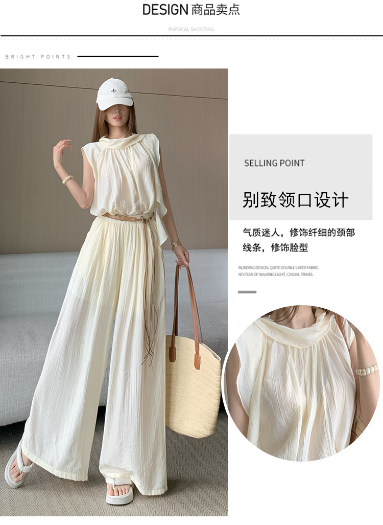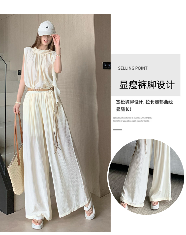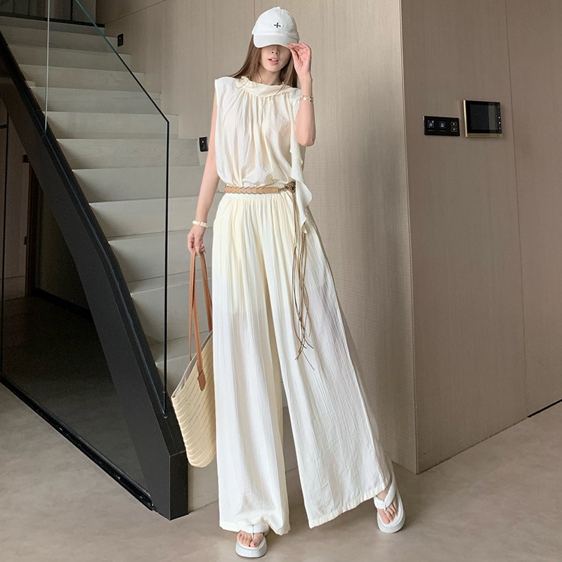 휴가 바람 고급 센스 세트 여성 여름 부드러운 바람 리본 단색 민소매 맨위 슬림해 보이는 와이드 레그 팬츠 투피스 세트