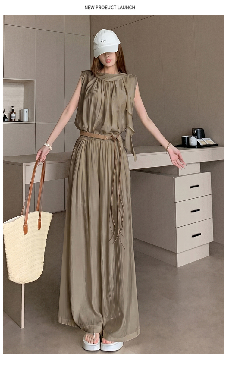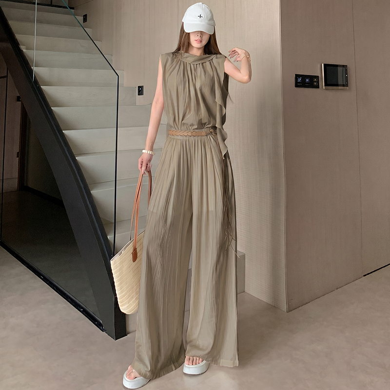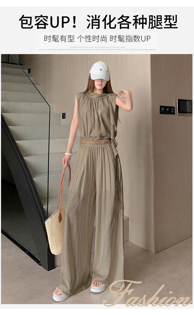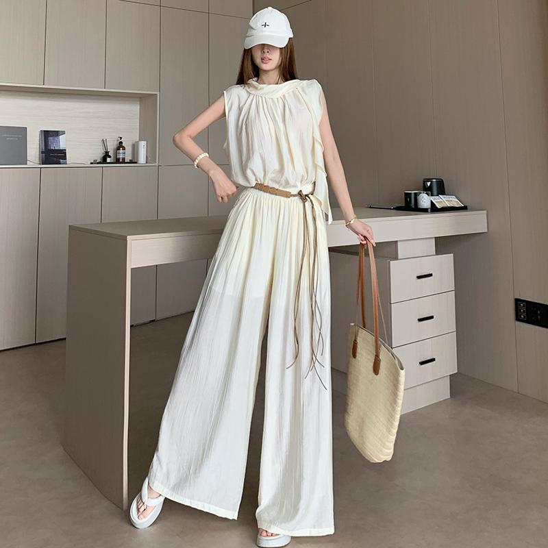 미니멀리즘 패션 슬림해 보이는 민소매 작은 셔츠 다용도 품격 루즈핏 하이웨이스트 캐주얼 바지 세트 벨트 포함 여성 여름