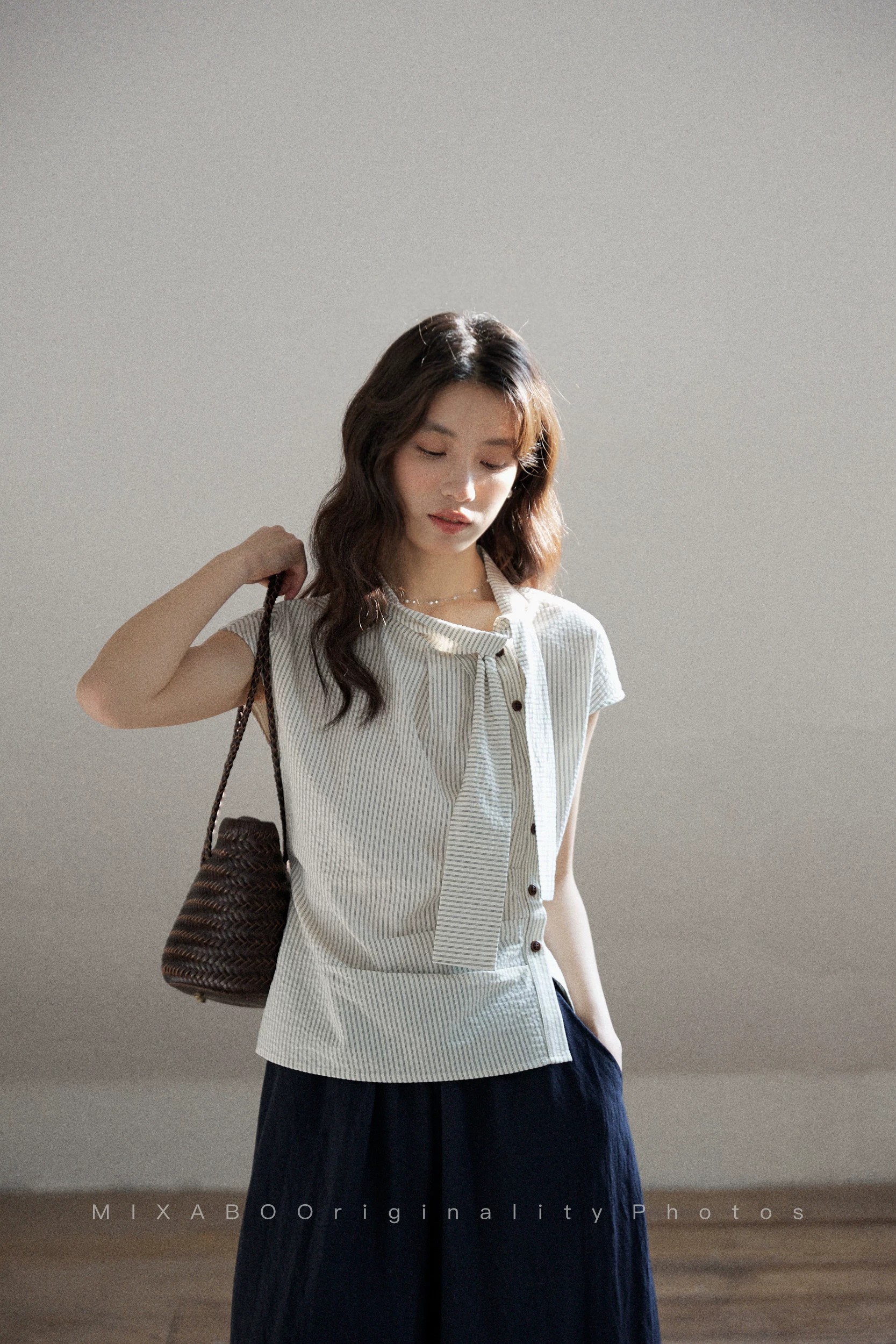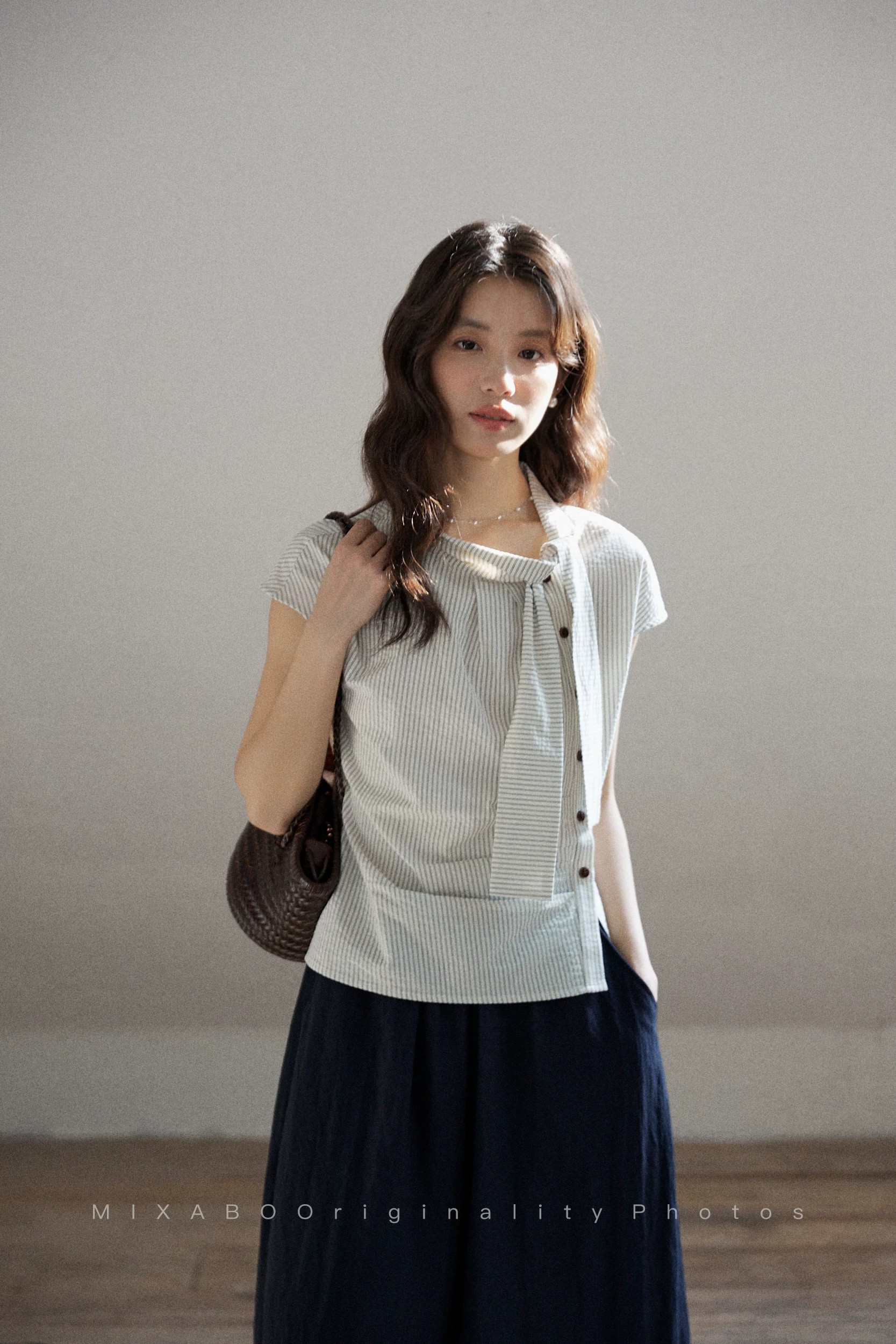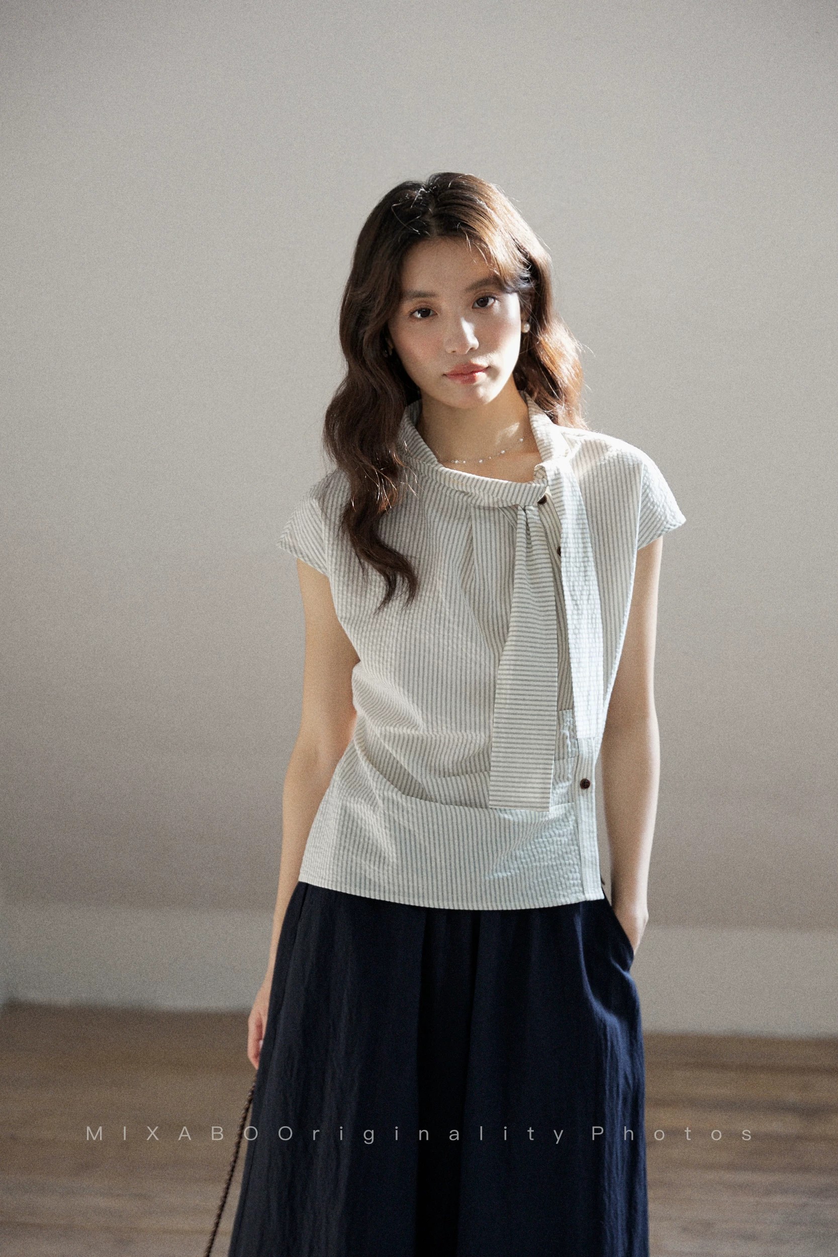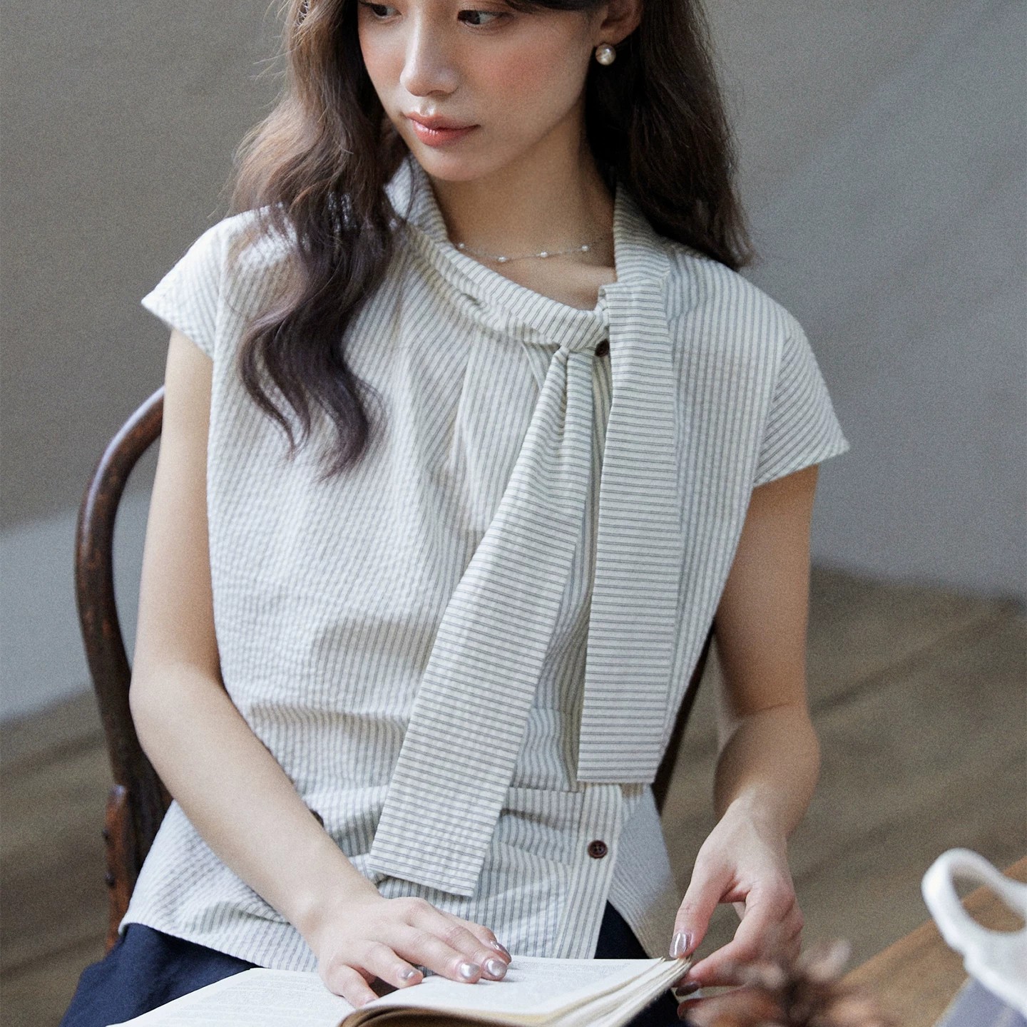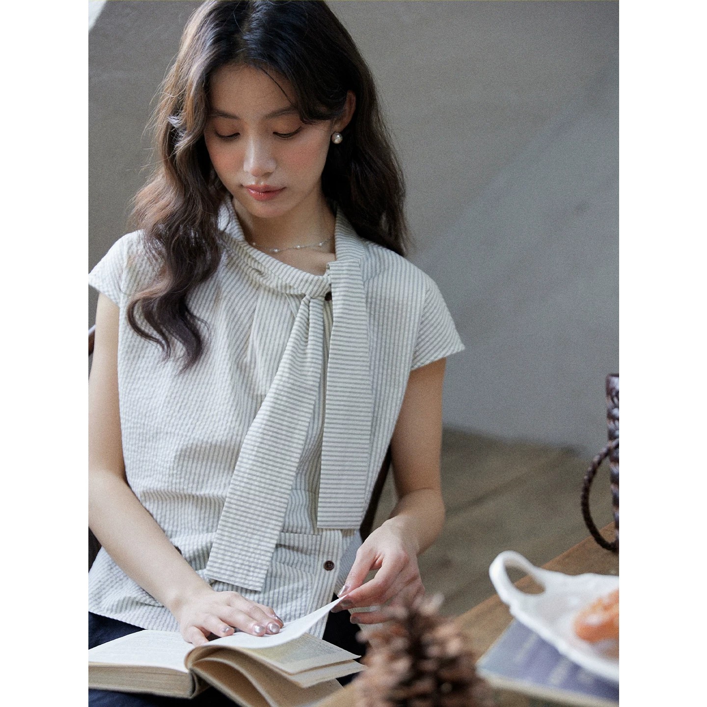 일상 세로 줄무늬 반팔 여성 셔츠 여름 비대칭 디자인 센스 리본 칼라 심지어 어깨 소매 맨위
