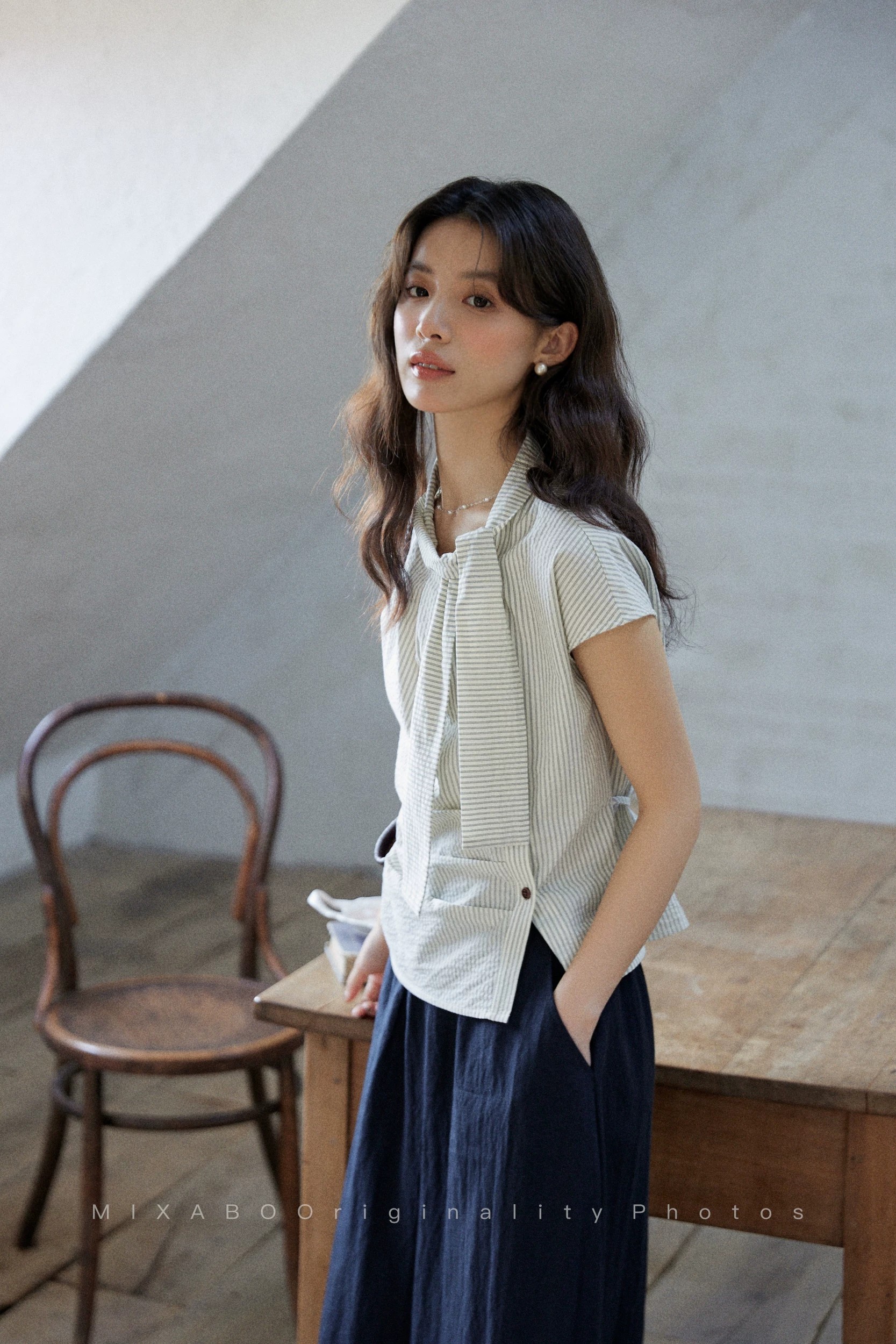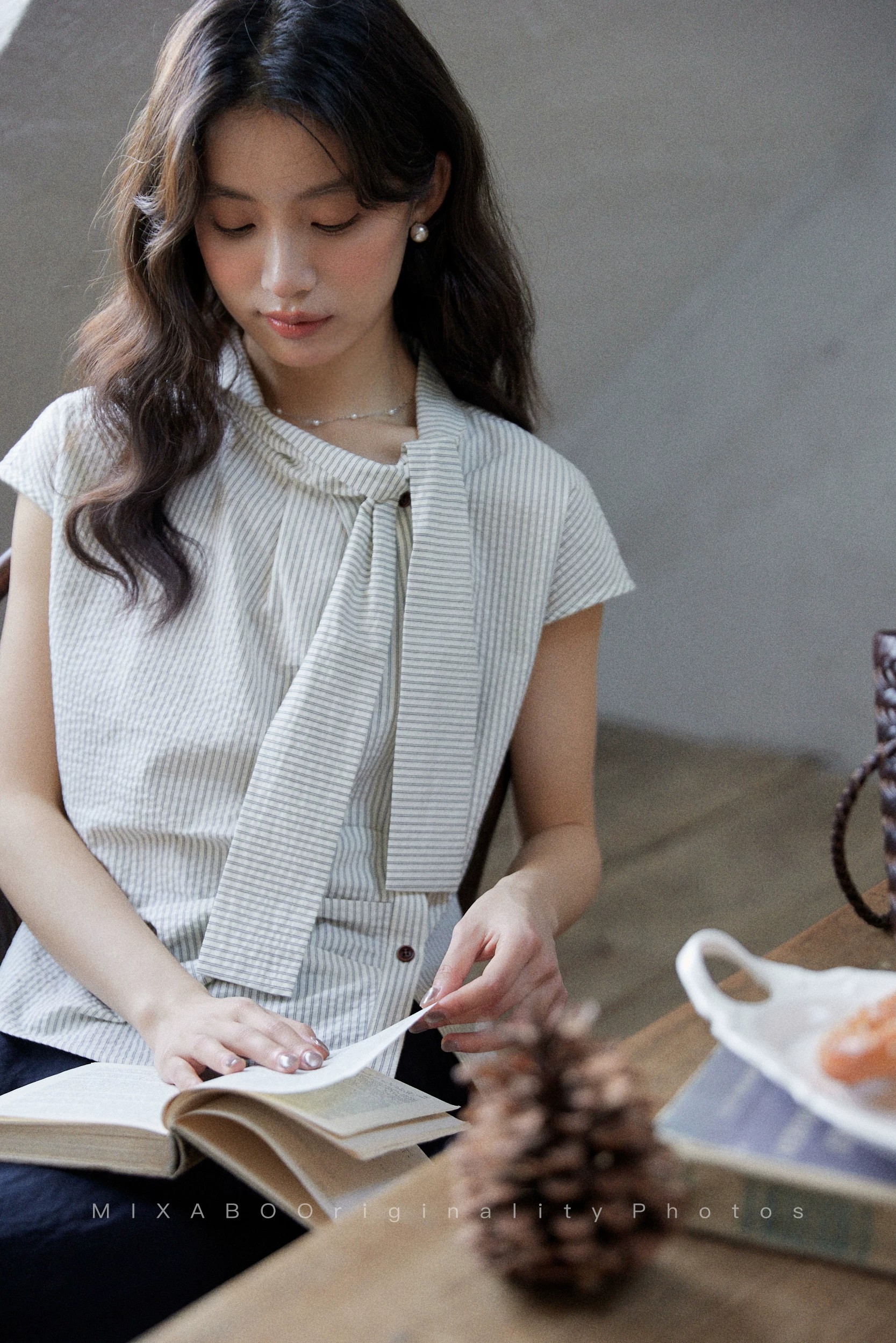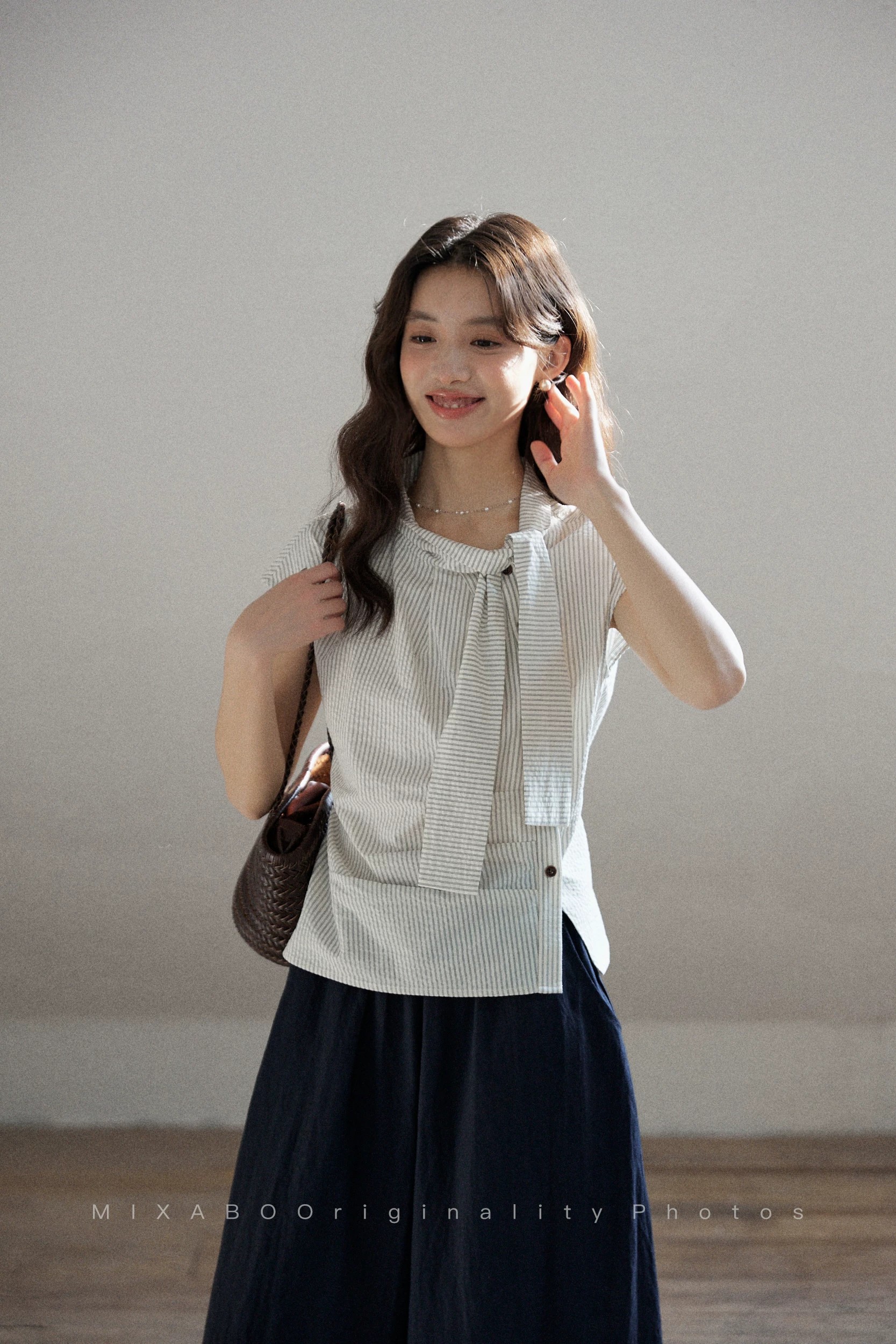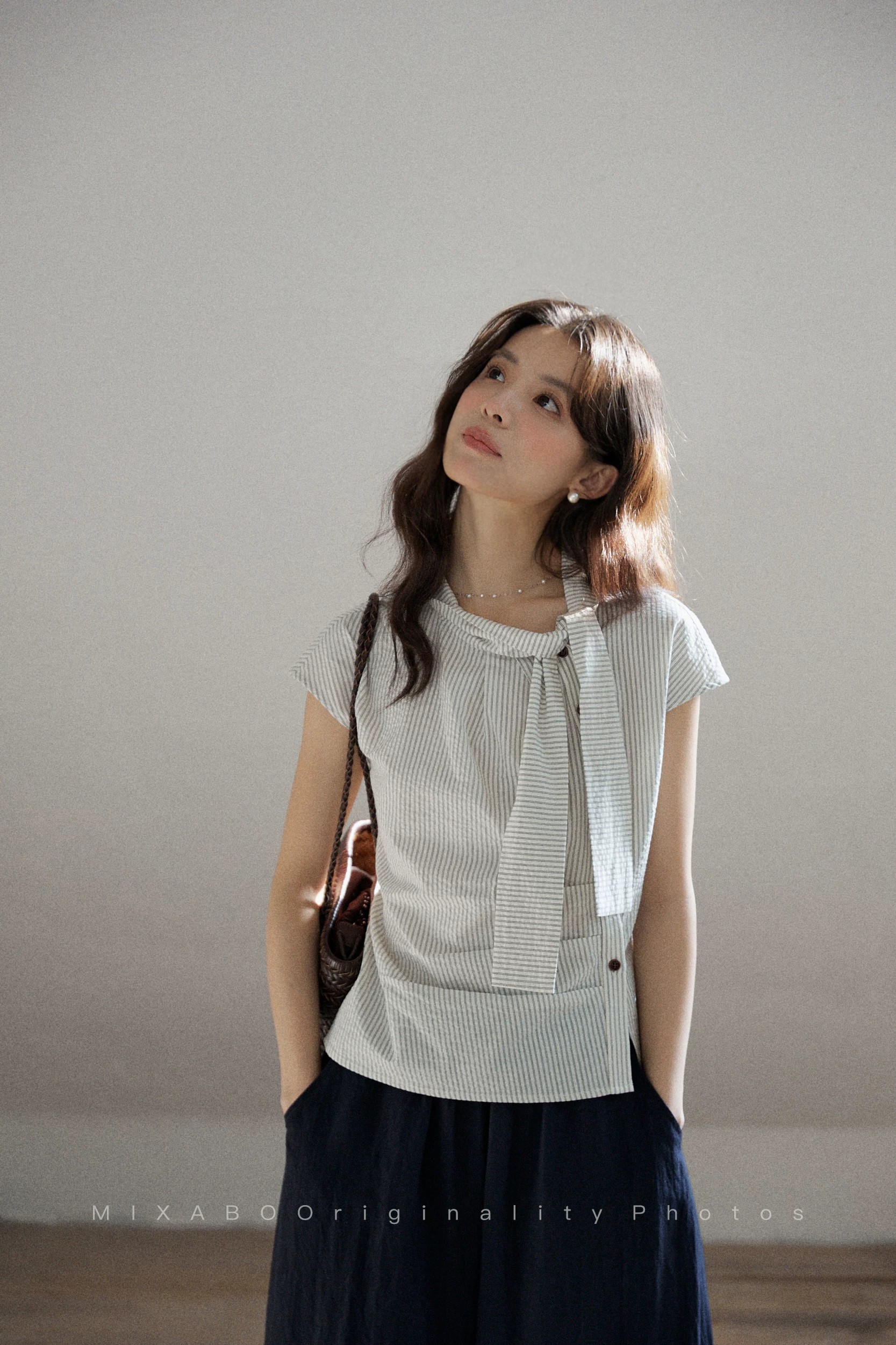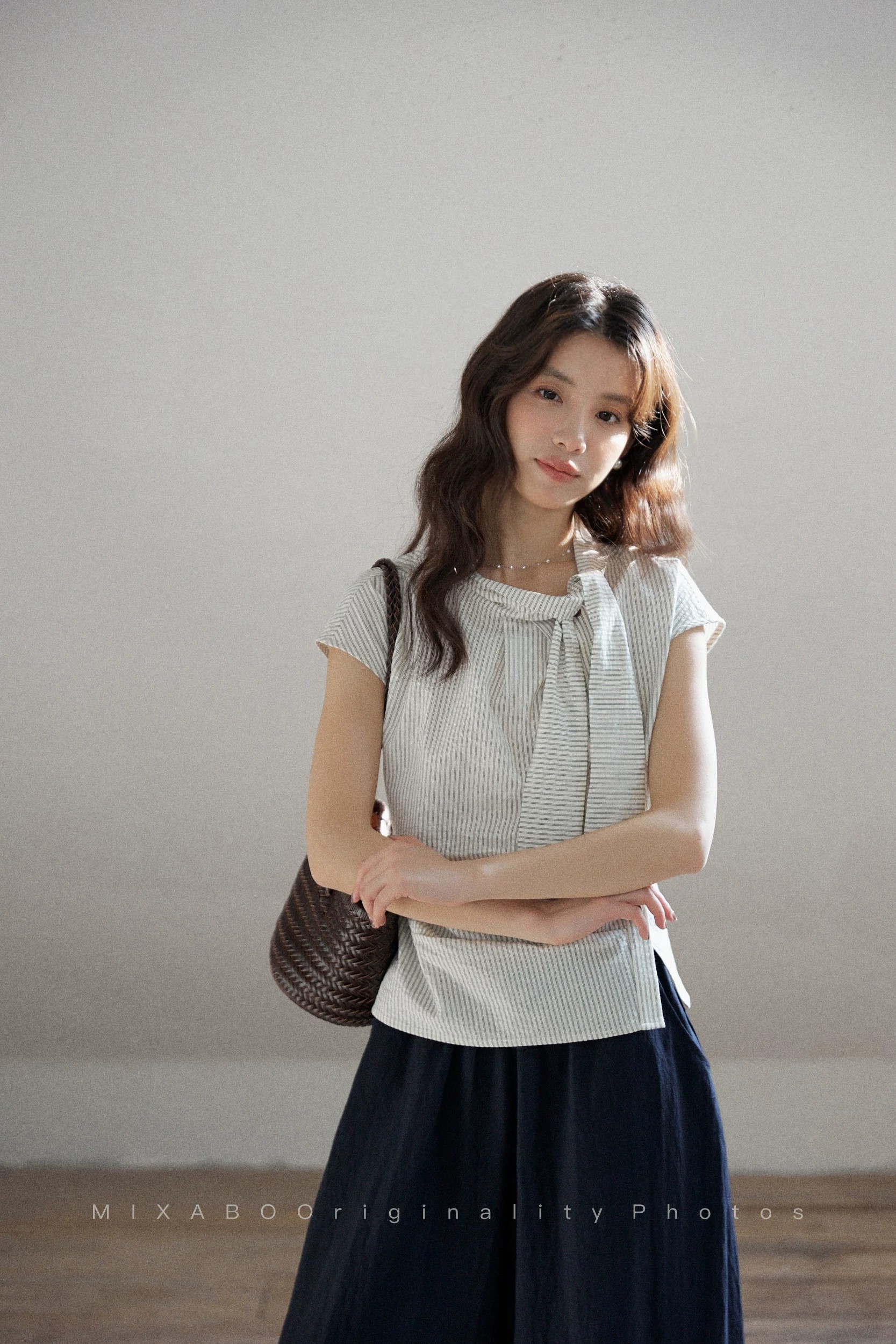 일상 세로 줄무늬 반팔 여성 셔츠 여름 비대칭 디자인 센스 리본 칼라 심지어 어깨 소매 맨위