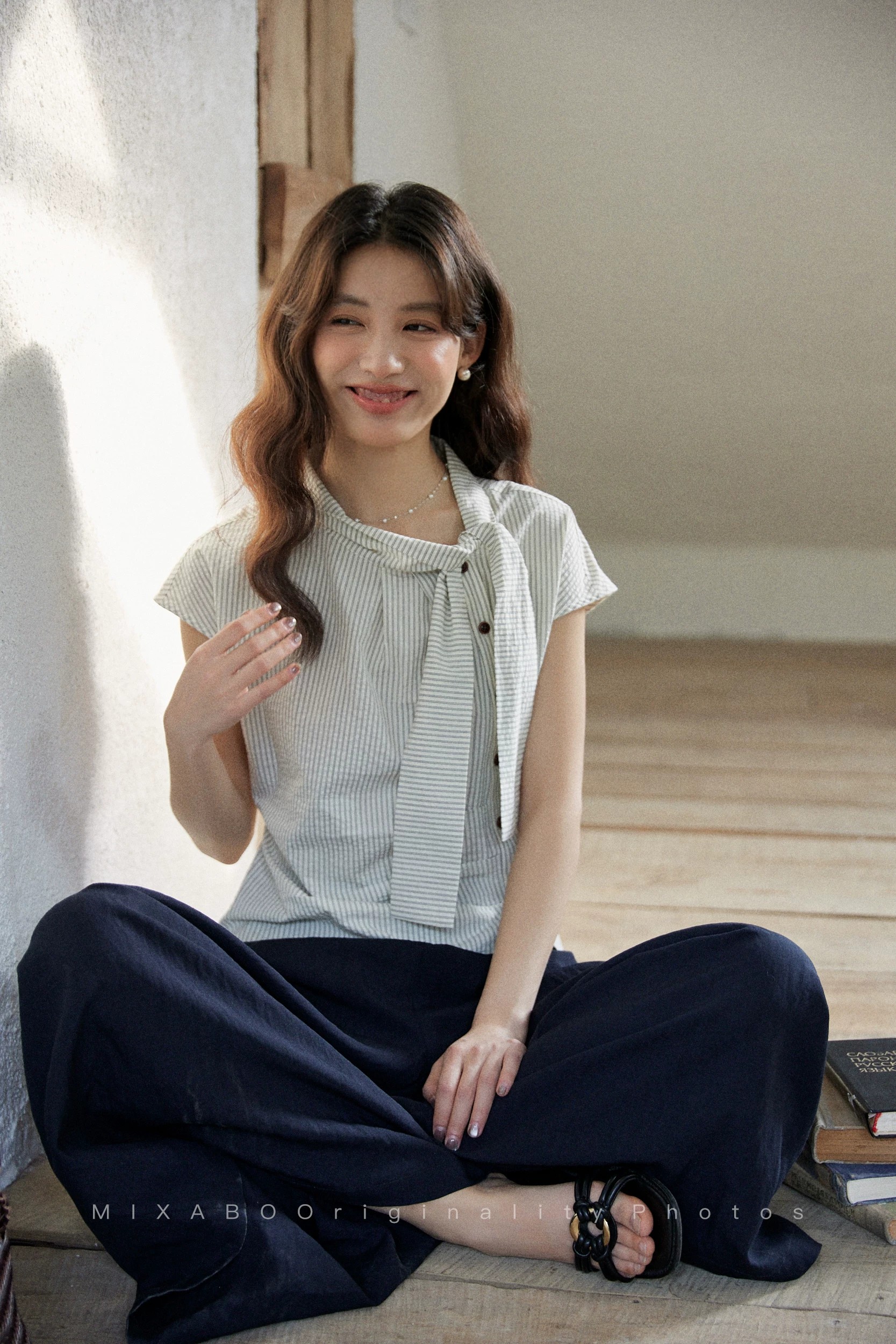 부드러운 부서 해상 바람 2026 여름 새로운 패치워크 레이스 해군 칼라 레이스업 긍정적 인 어깨 맞춤 티셔츠