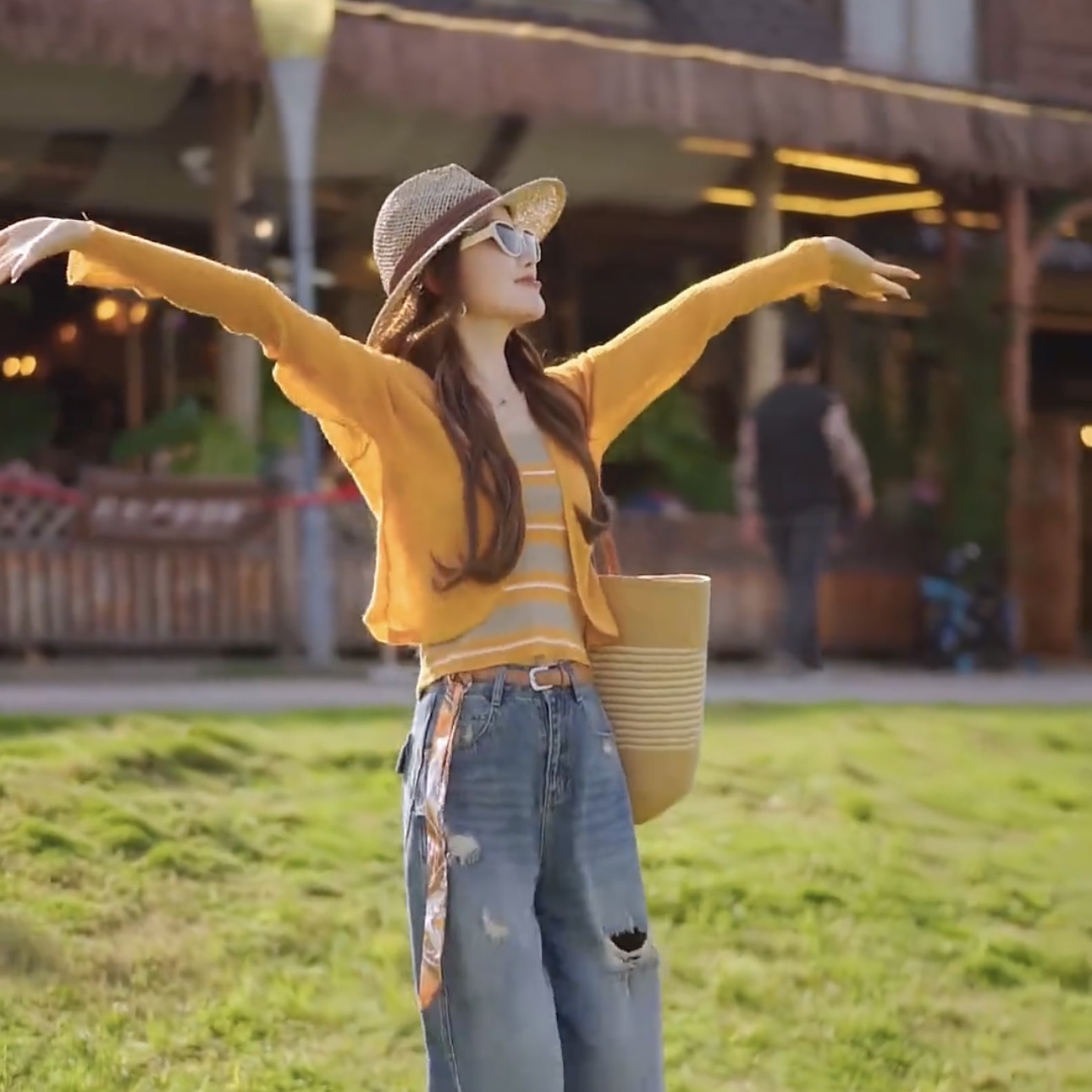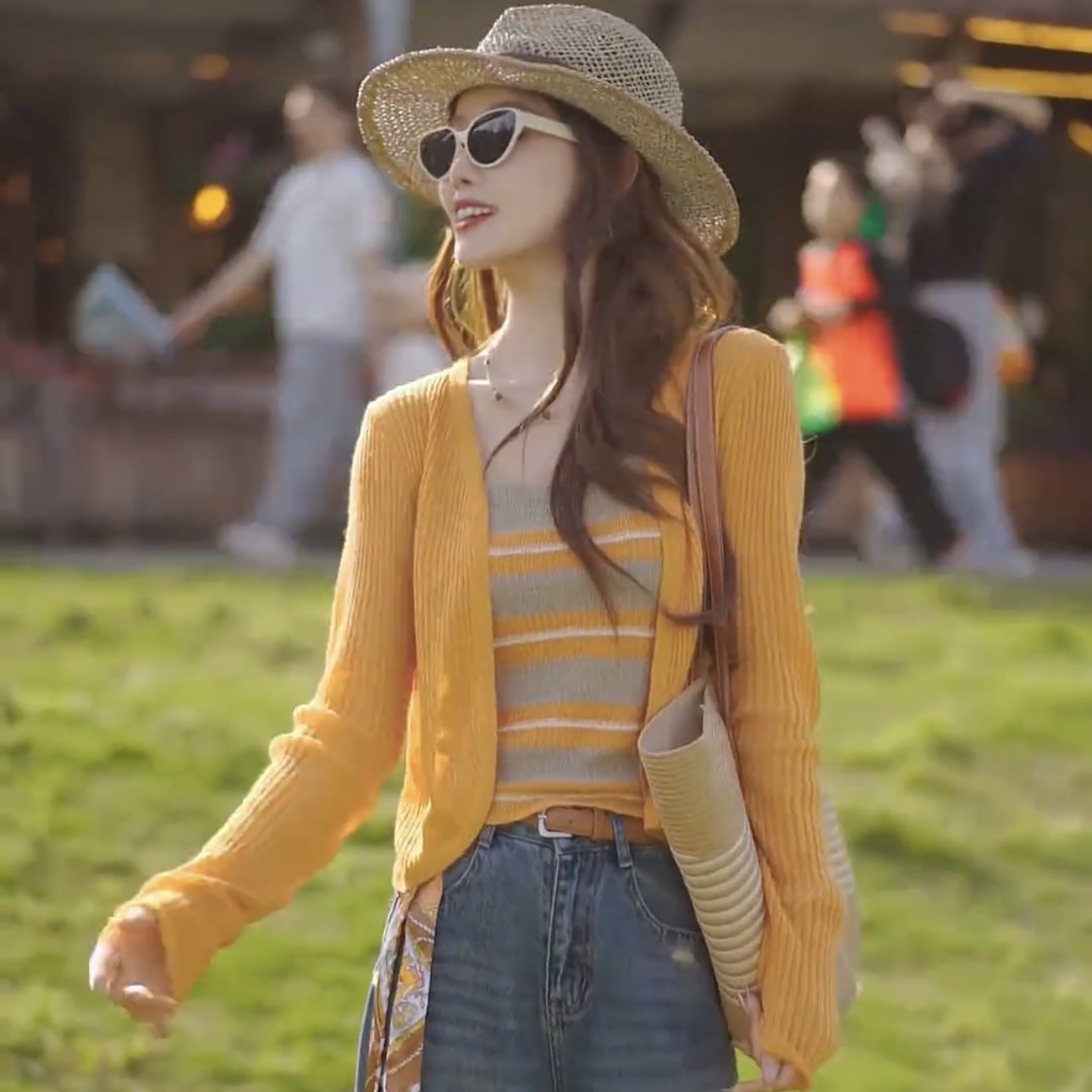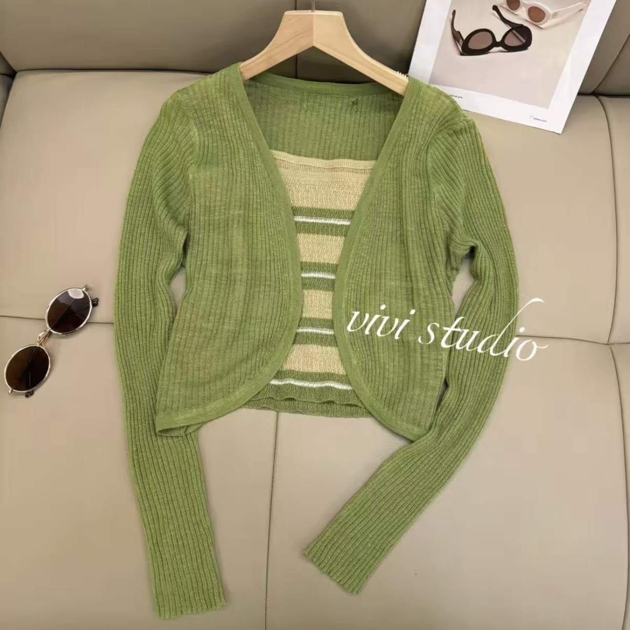 긴팔 얇은 스타일 자외선 차단 니트 오픈 가디건 여성 여름 2026 새로운 품격 스트라이프 조끼 자켓 투피스 세트 맨위
