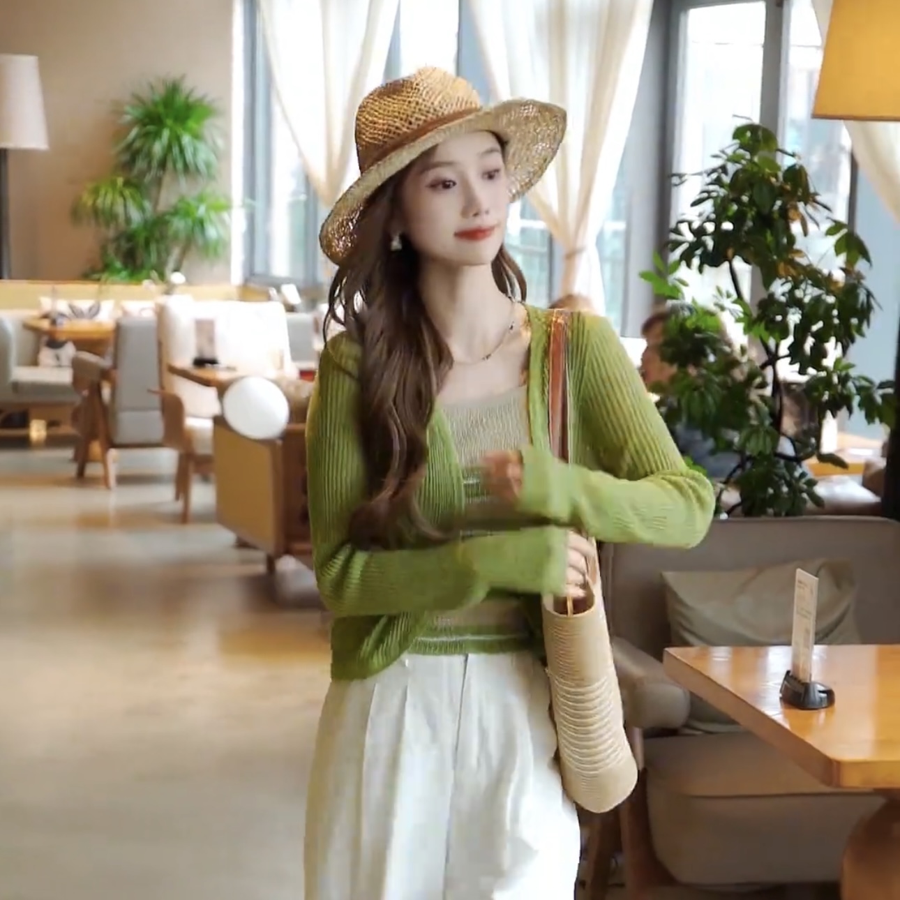 2026 년 여름 새로운 한 부서 순수한 욕망 바람 슬립 긴팔 오픈 가디건 세트 여성