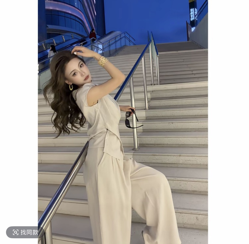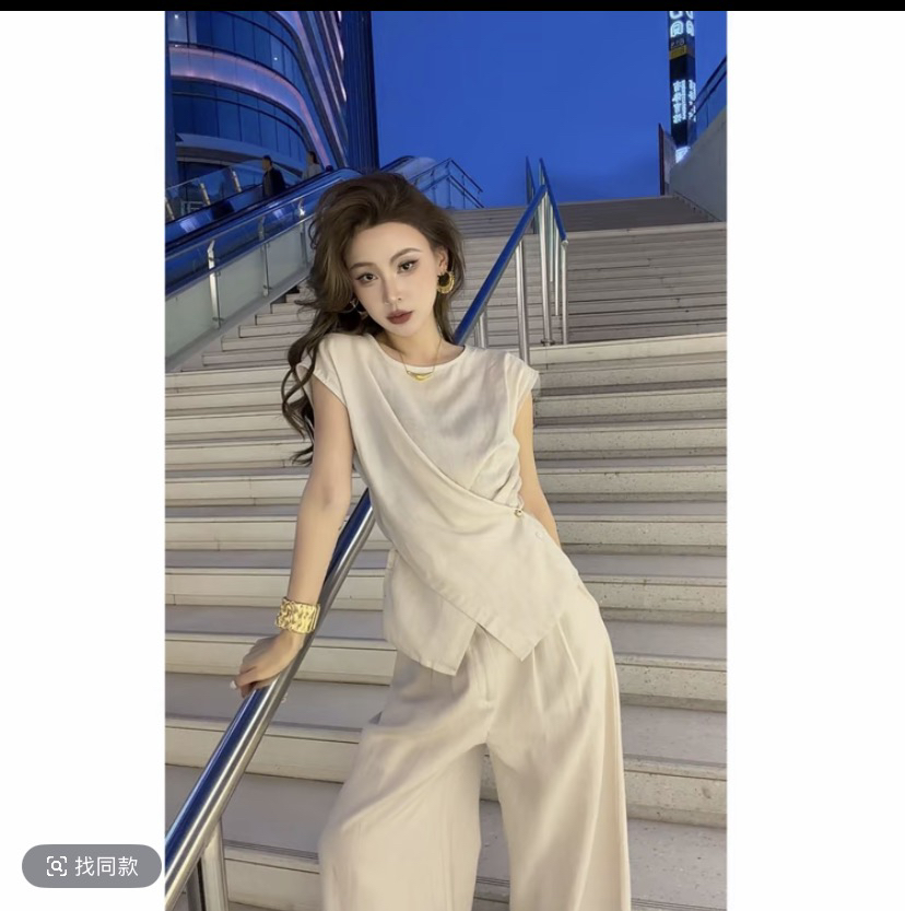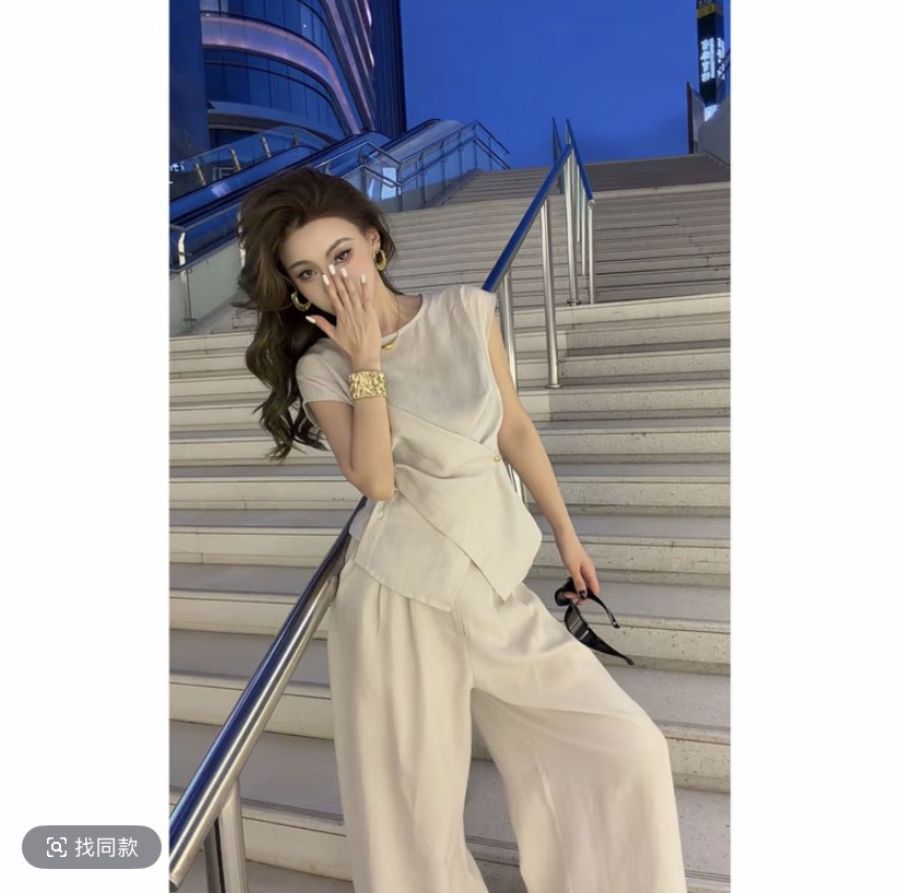 고급 센스 품격 아마 세트 여성 여름 새로운 품격 맨위 와이드 레그 팬츠 패션 슬림해 보이는 통기성 투피스 세트