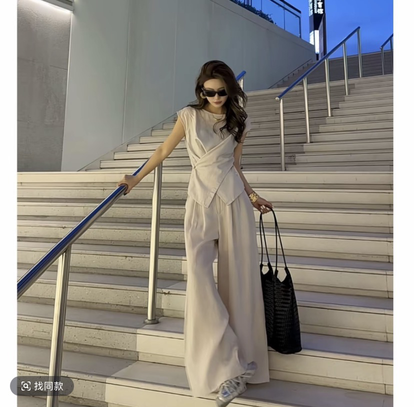 한국 여성 주님 여름 한 부서 캐주얼 조끼 셔츠 디자인 센스 바닥 청소 와이드 레그 팬츠