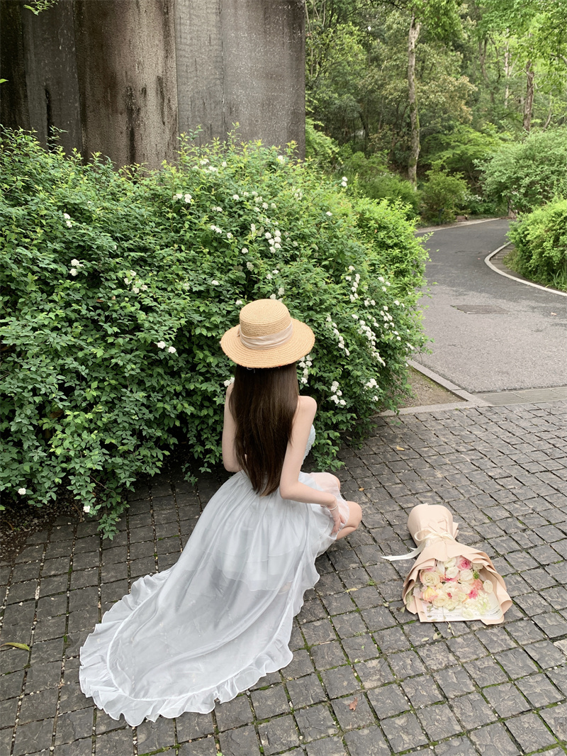 실사 여름 새로운 화이트 플리츠 쉬폰 슬립 드레스 롱 코트 품격 허리 수축 대 치마 요정 치마