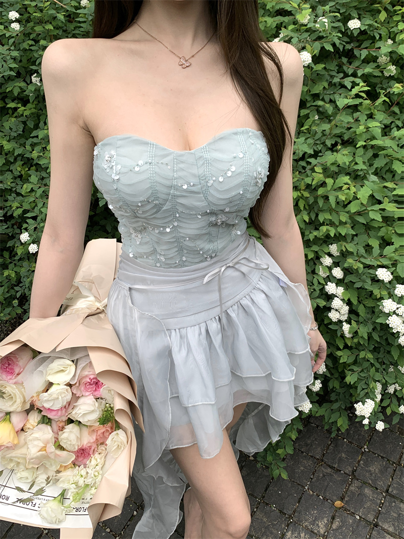 여름 레이스 스팽글 망사 요정 가스 허리 수축 순수한 욕망 휴가 데이트 생일 슬립 퍼프 작은 드레스 드레스