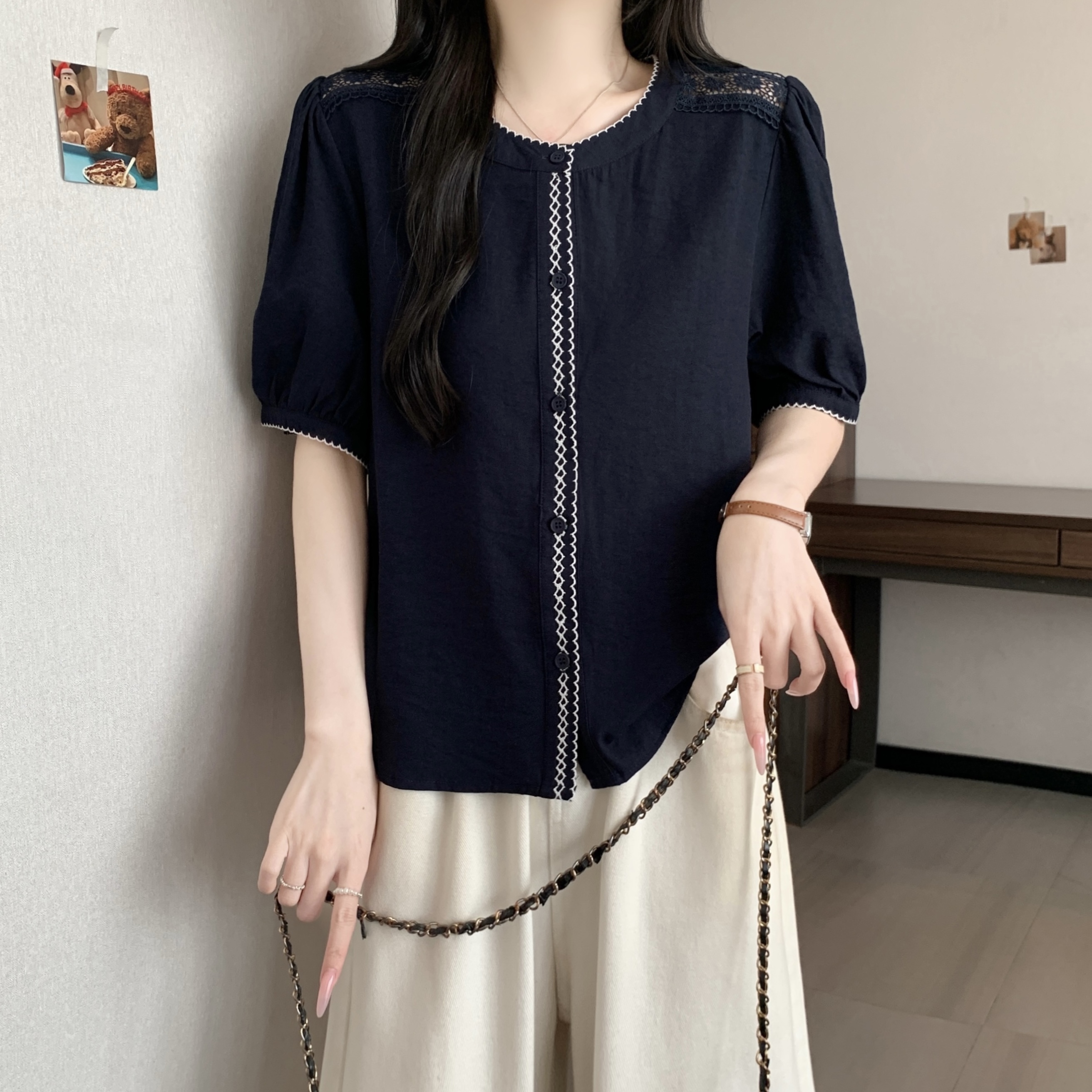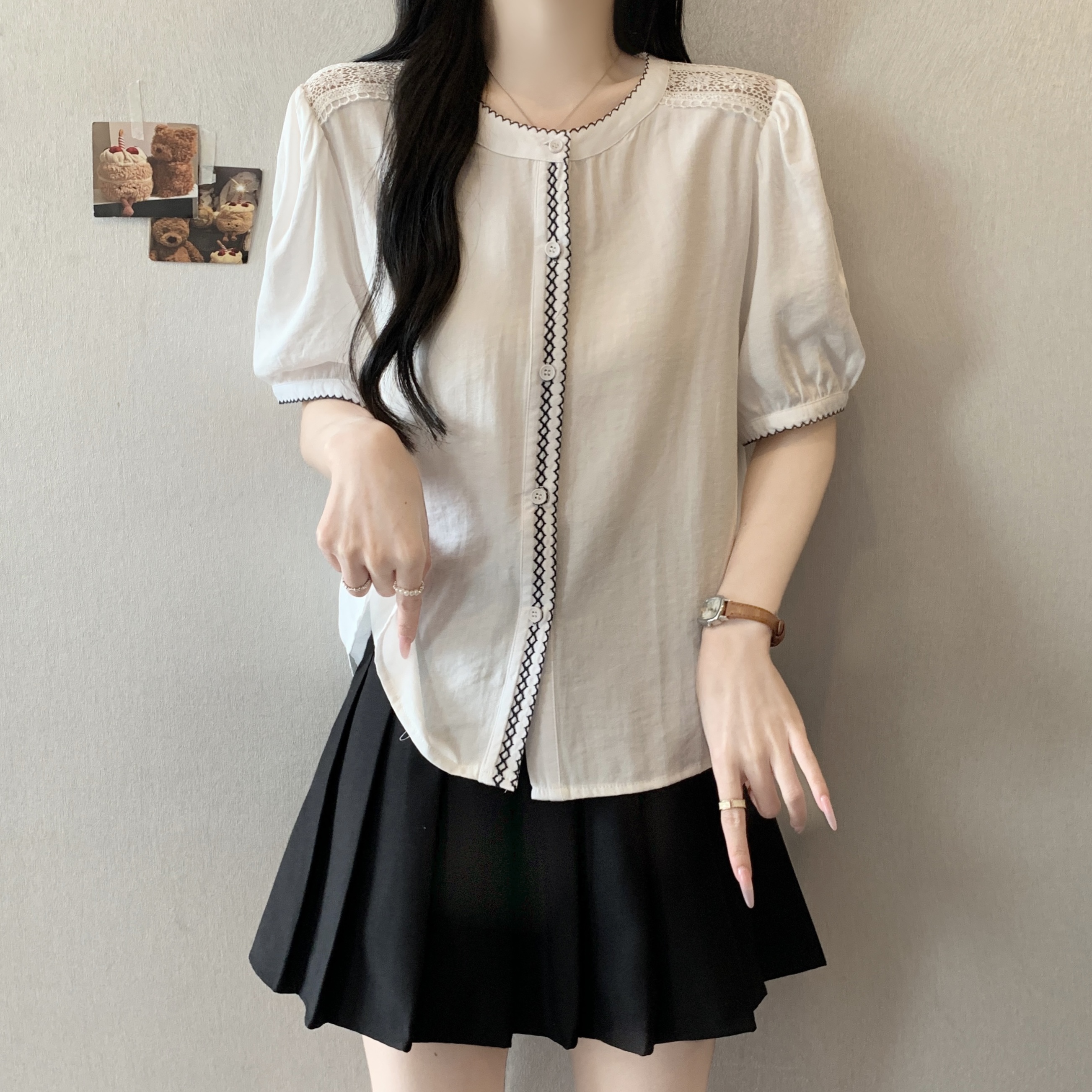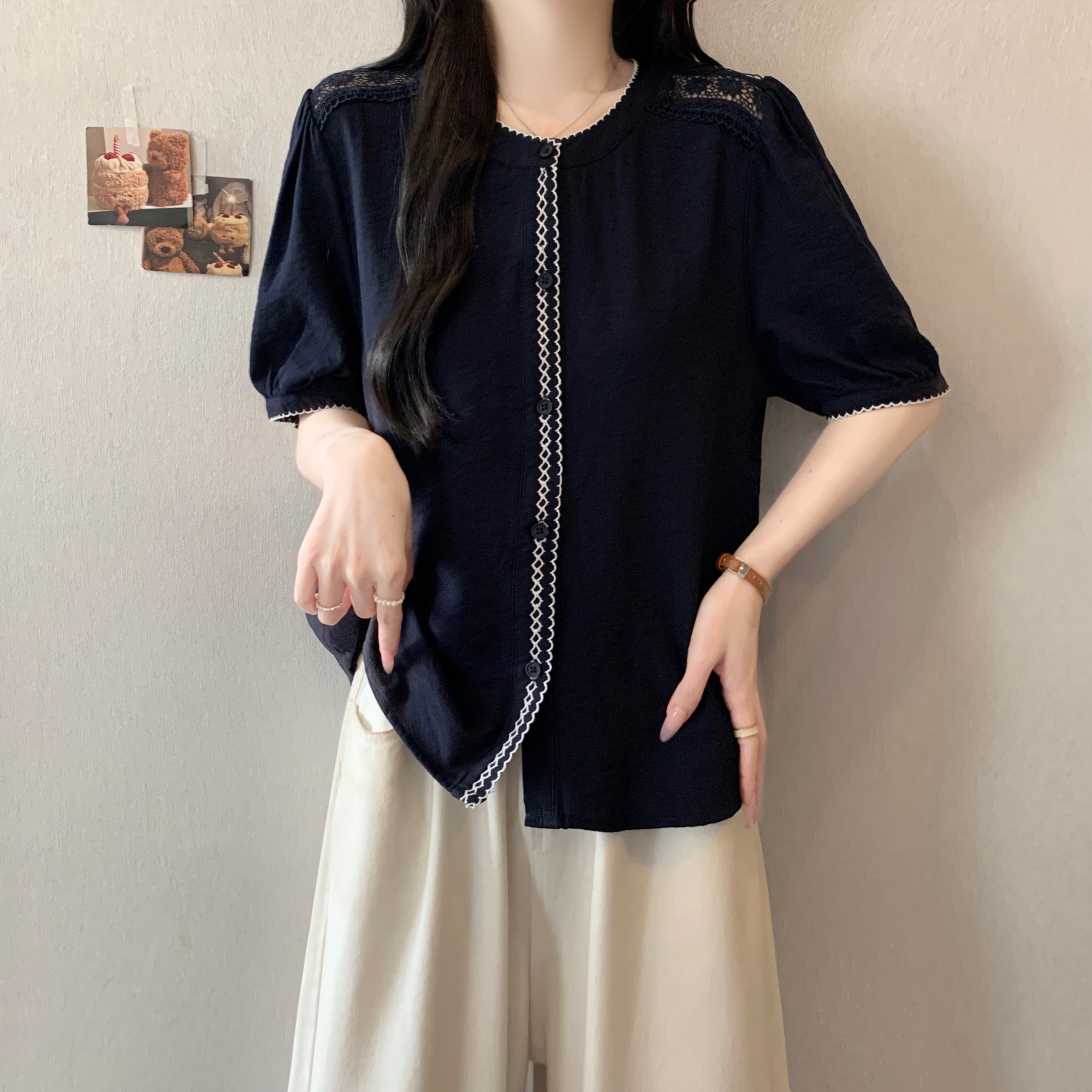 빅 사이즈 지방 mm 여름 새로운 한 부서 색상 버클 라운드 넥 반팔 셔츠 여성 여름 달콤함 맨위