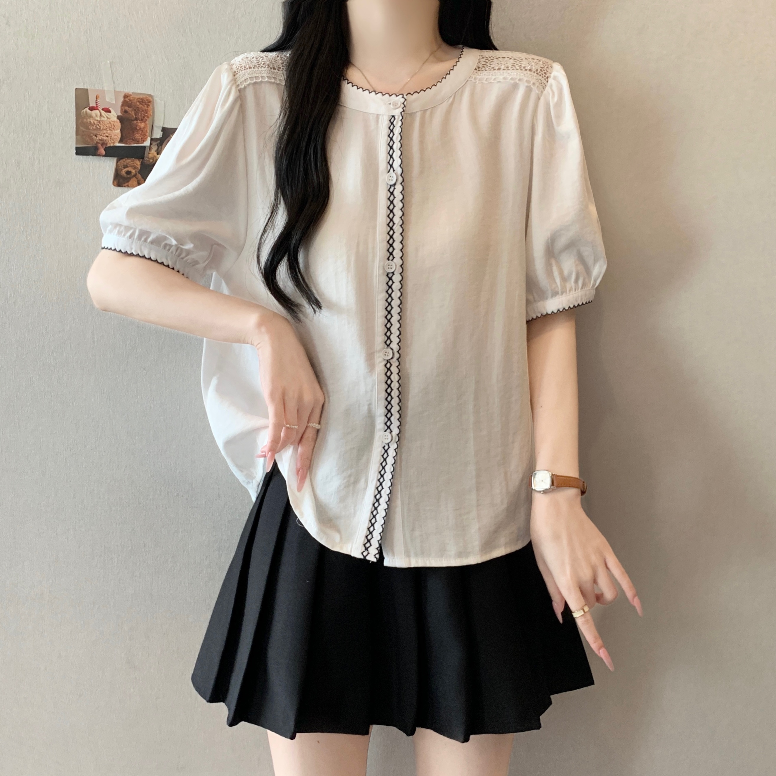빅 사이즈 지방 mm 여름 새로운 비즈 박기 광장 칼라 거품 소매 셔츠 지방 mm 슬림해 보이는 표지 고기 맨위