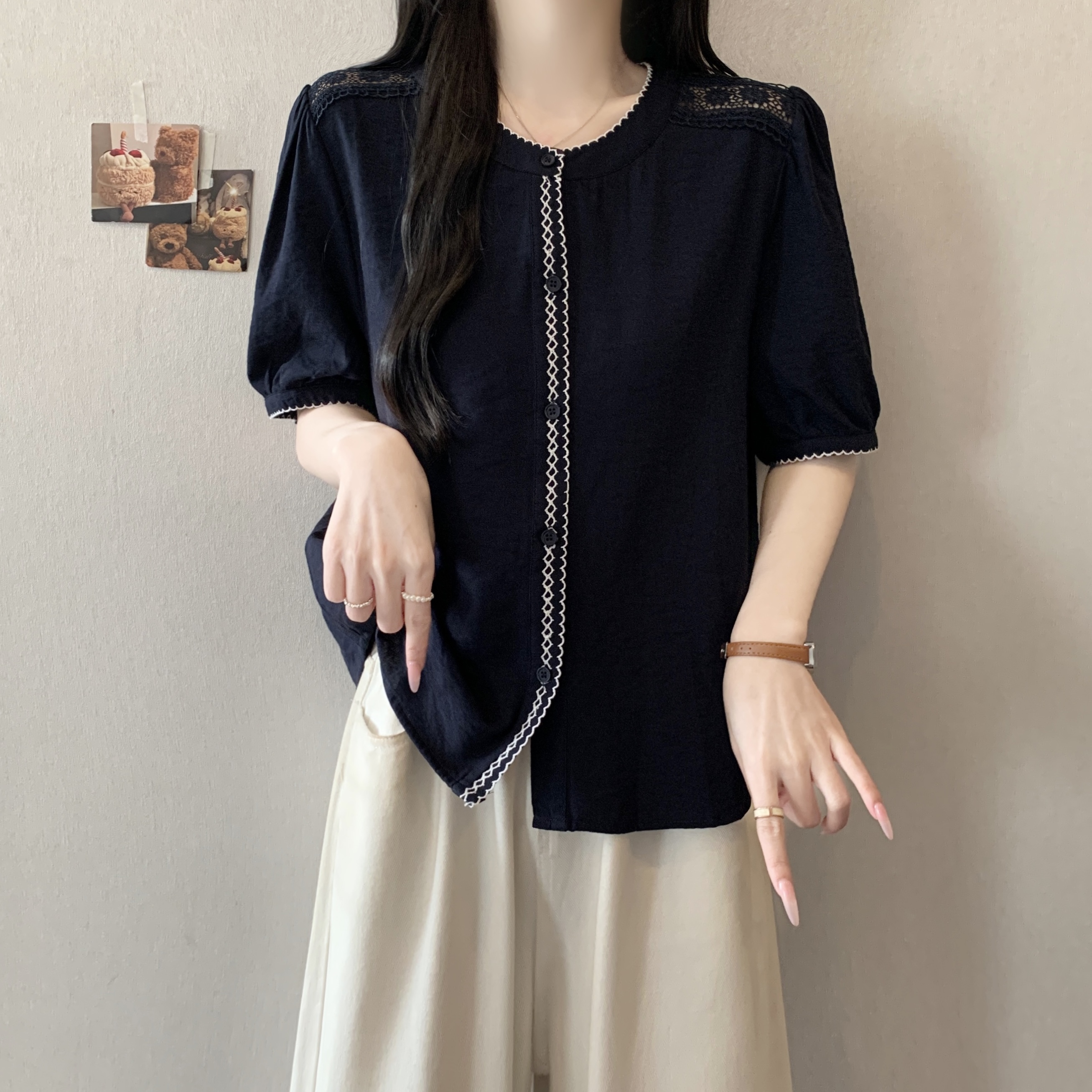 빅 사이즈 지방 mm 여름 새로운 레이스 자수 홀로우 아웃 반팔 여성 셔츠 표지 배 슬림해 보이는 연령 감소 작은 셔츠 맨위