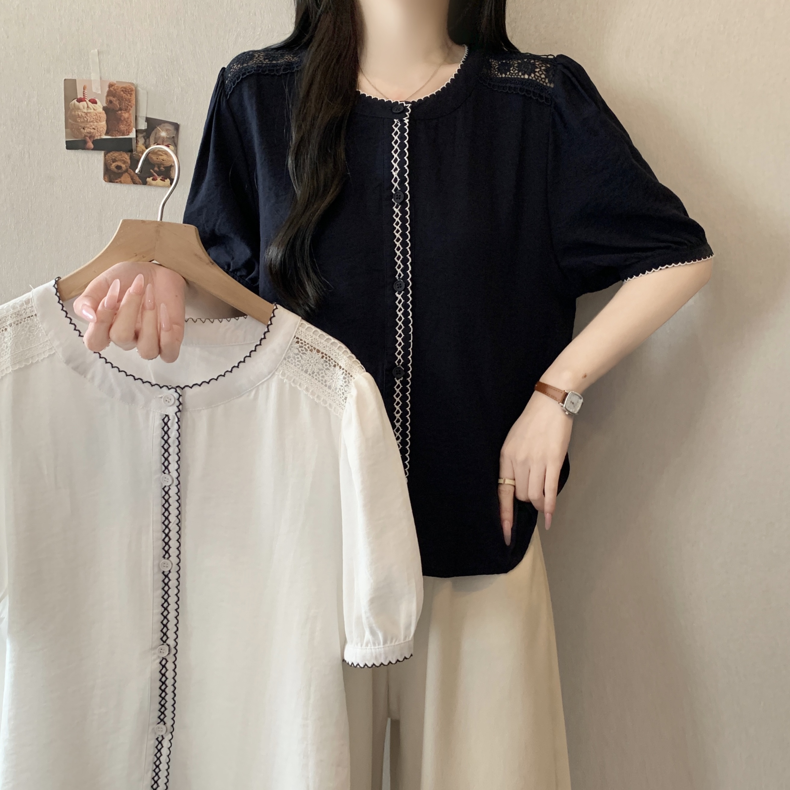 빅 사이즈 지방 mm 여름 새로운 품격 패션 미니멀리즘 허리 수축 패치워크 레이스 레이스 자수 셔츠 맨위 여성