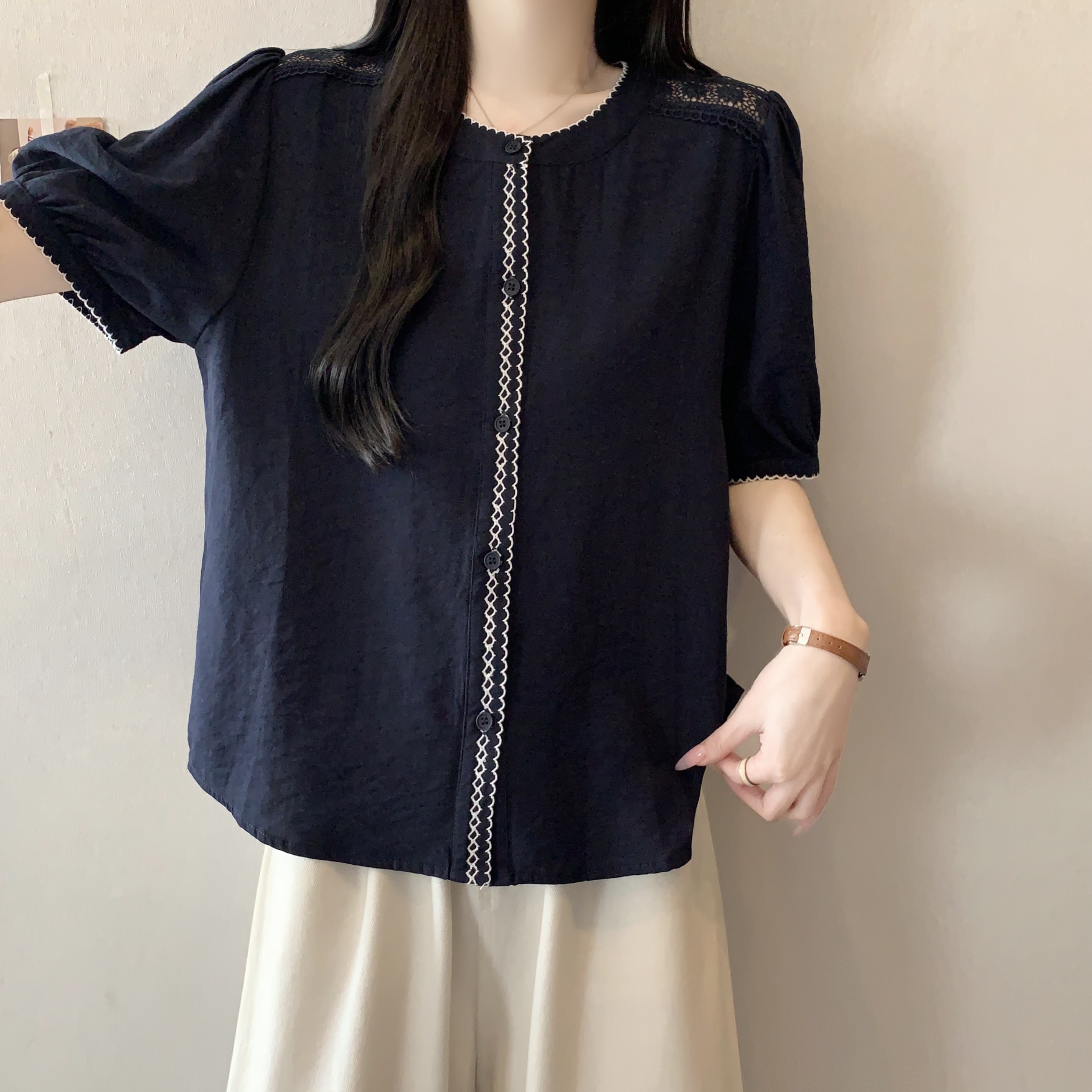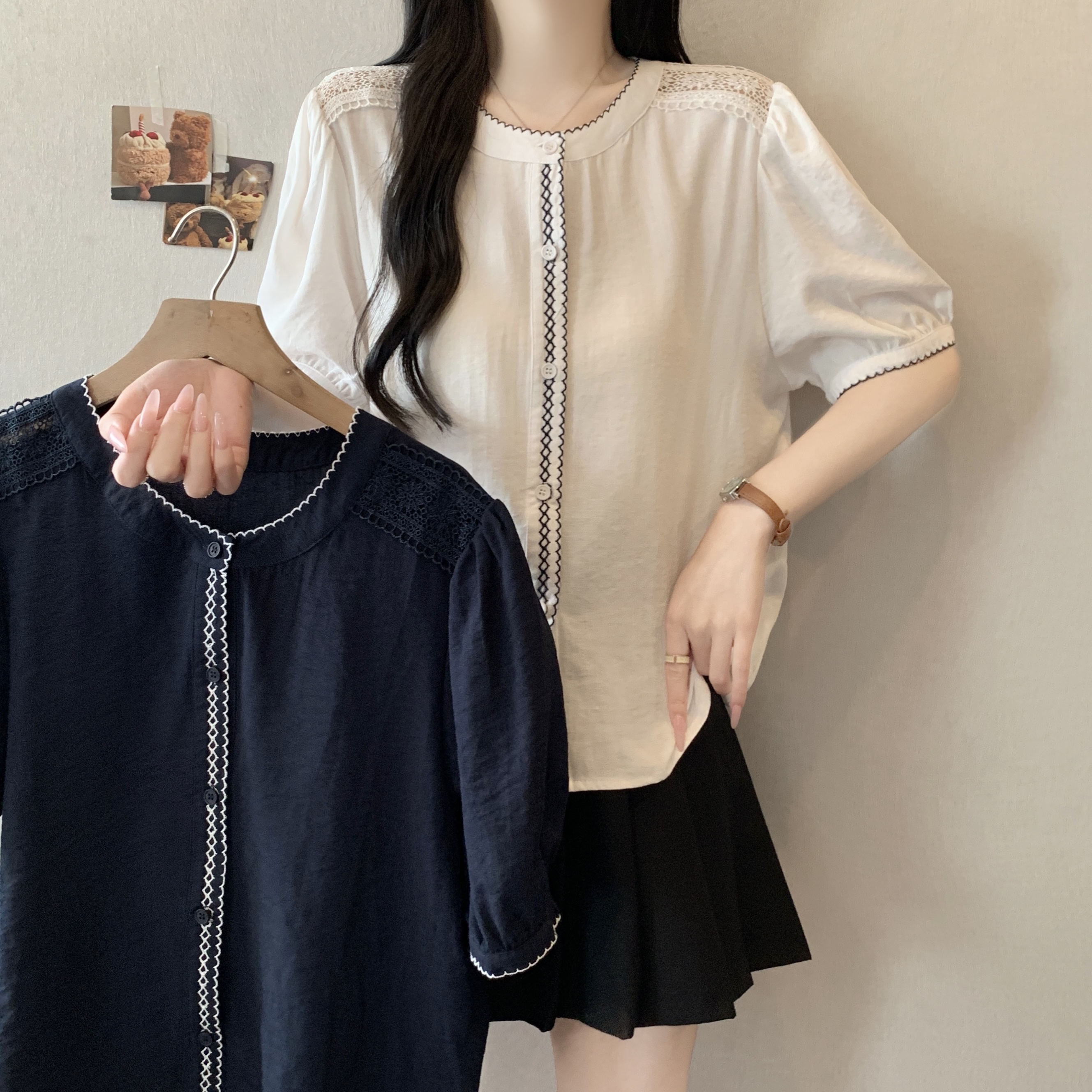 빅 사이즈 지방 mm 여름 새로운 품격 패션 미니멀리즘 허리 수축 패치워크 레이스 레이스 자수 셔츠 맨위 여성