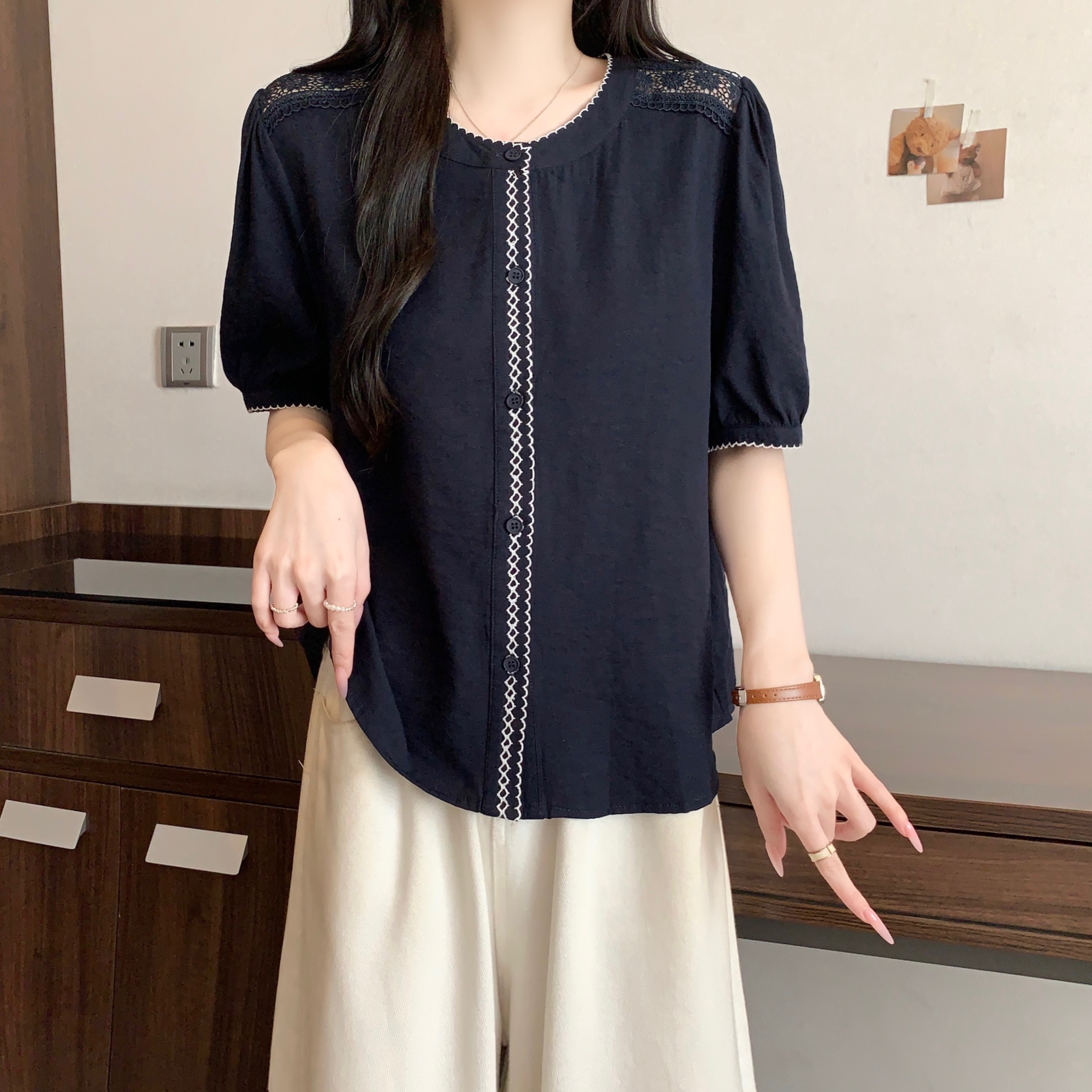 빅 사이즈 지방 mm 여름 새로운 레이스 자수 홀로우 아웃 반팔 여성 셔츠 표지 배 슬림해 보이는 연령 감소 작은 셔츠 맨위