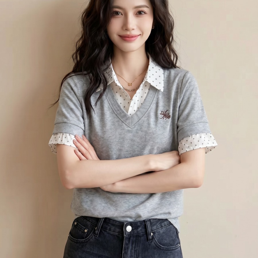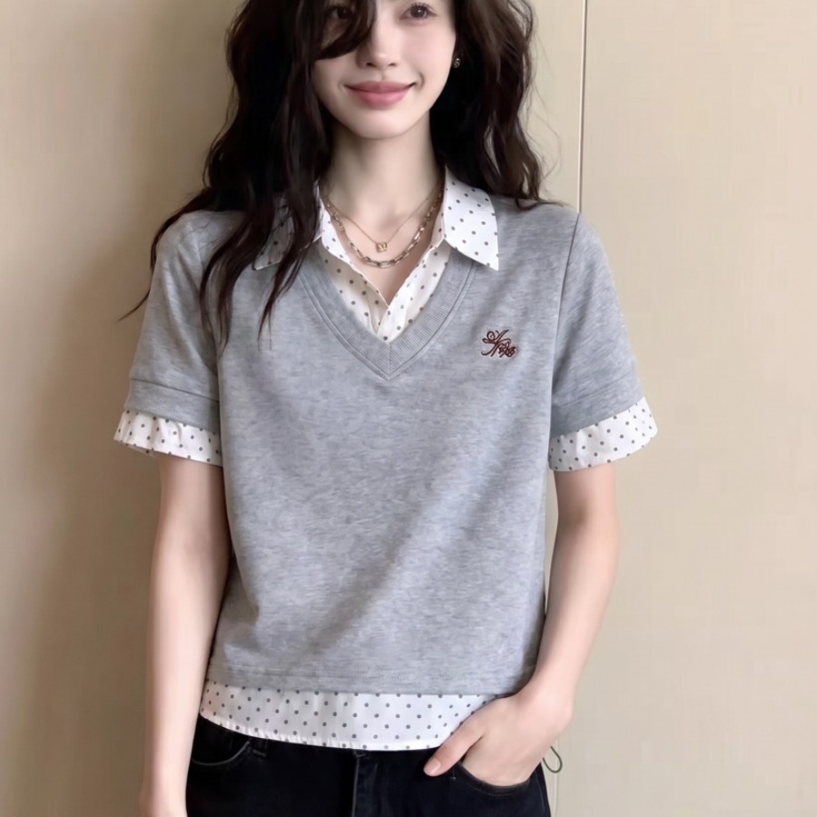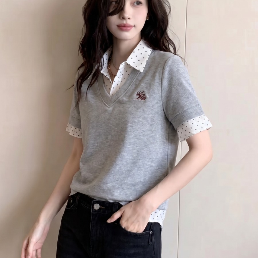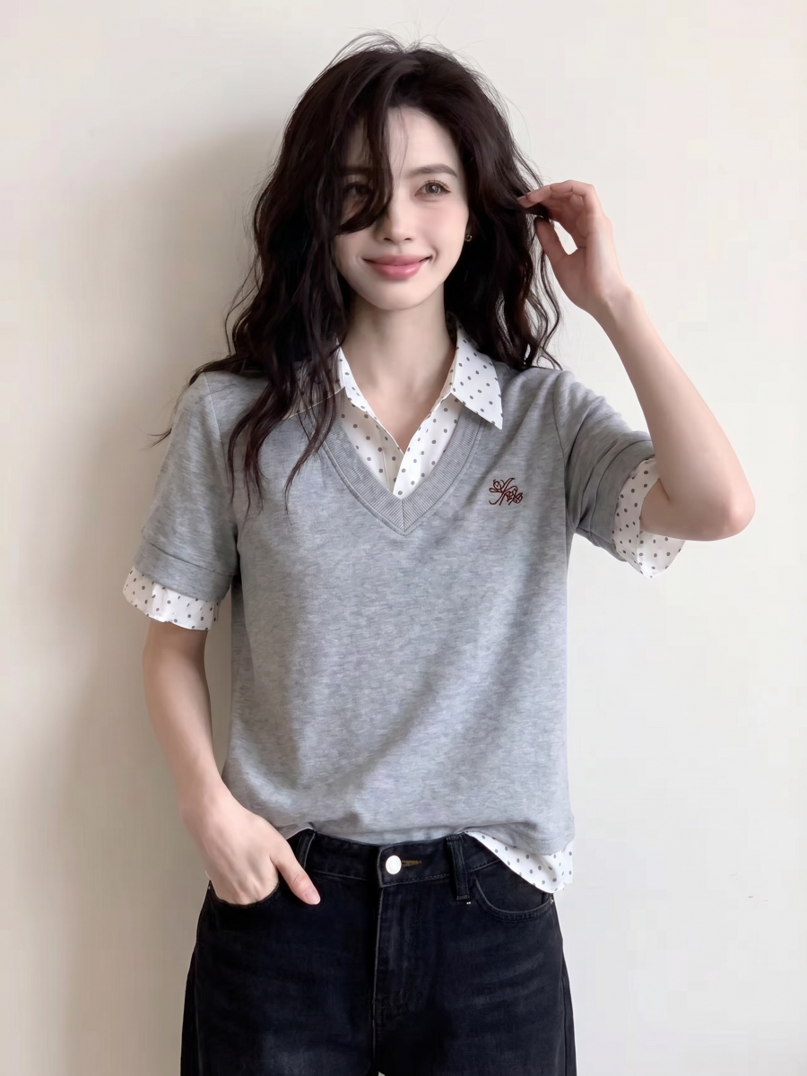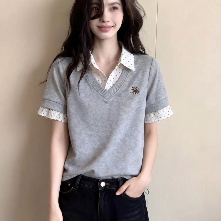 빅 사이즈 디자인 센스 셔츠 칼라 패치워크 티셔츠 페이크 레이어드 반팔 여성 여름 새로운 다용도 슬림해 보이는 표지 고기 맨위