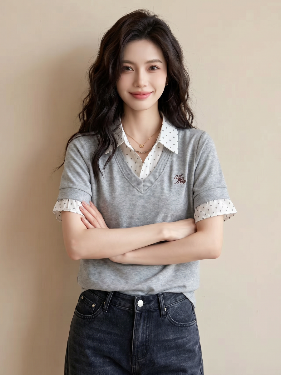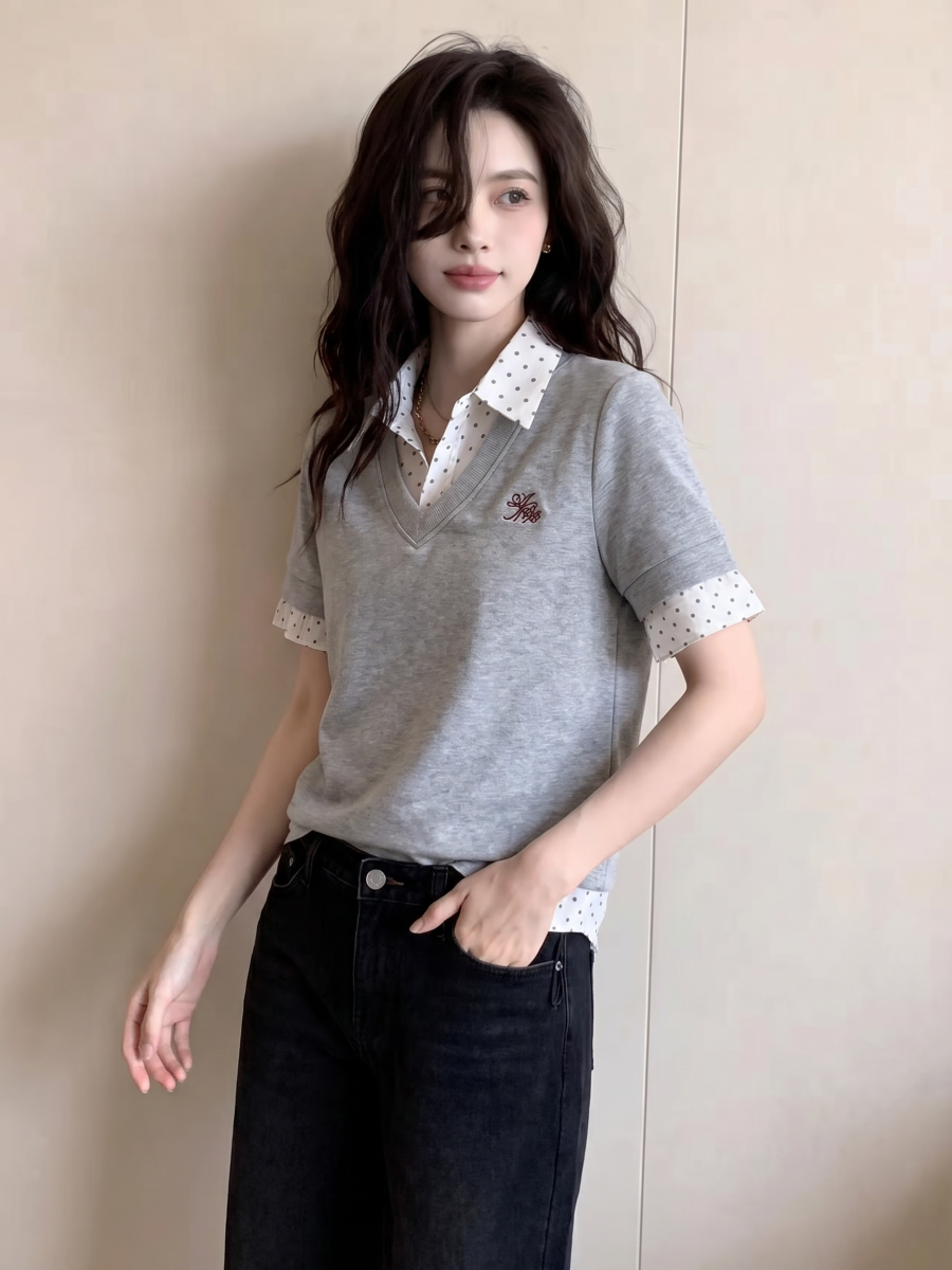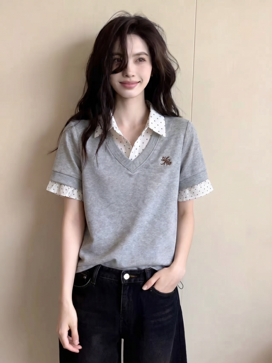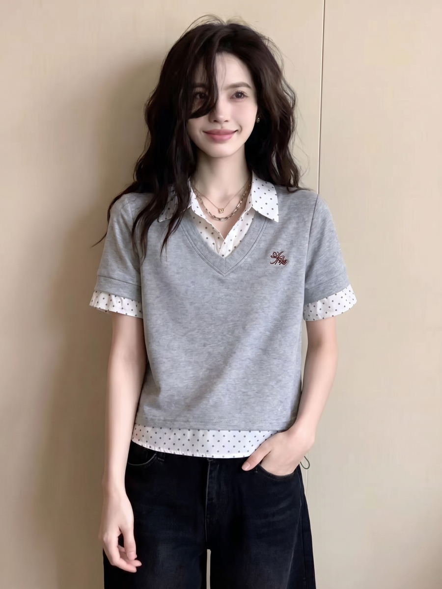 빅 사이즈 디자인 센스 셔츠 칼라 패치워크 티셔츠 페이크 레이어드 반팔 여성 여름 새로운 다용도 슬림해 보이는 표지 고기 맨위