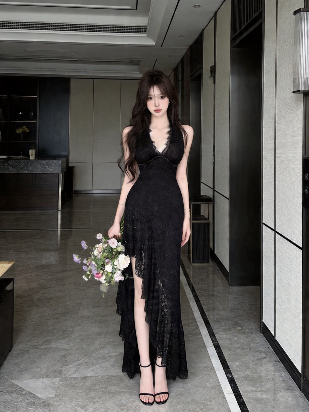 실사 핫걸 섹시함 낮은 가슴 허리 수축 큰 진자 꽃 숄더백 슬립 드레스 순수한 욕망 슬림해 보이는 연회 예복 치마
