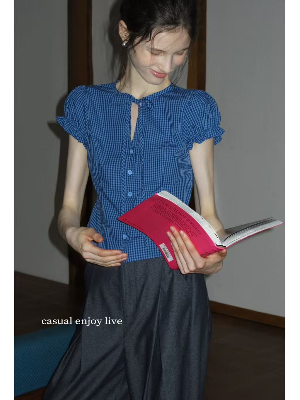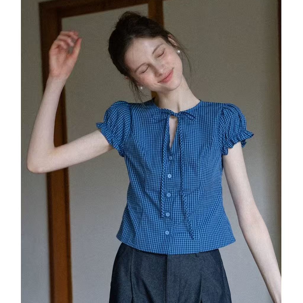 eggka 파란색 거품 소매 레이스업 체크무늬 여성 셔츠 여름 달콤함 품격 쇼트 스타일 슬림해 보이는 캐주얼 긍정적 인 어깨 의류