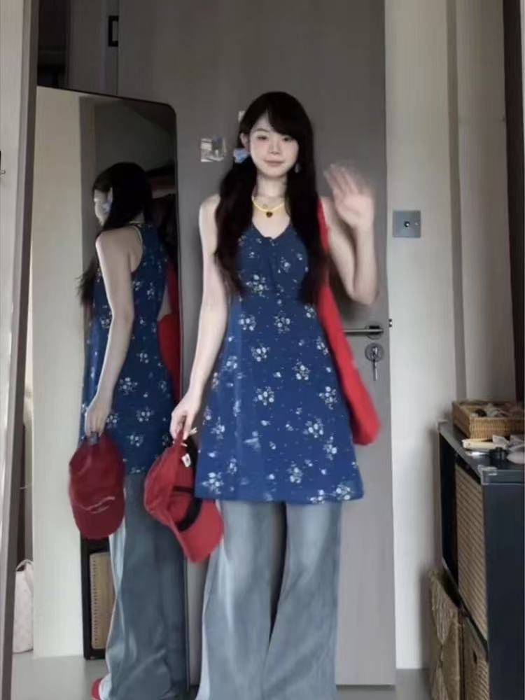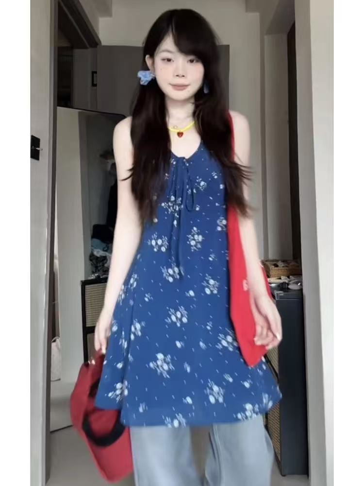 아메리칸 레트로 여름 센스 민소매 V넥 슬립 여성 드레스 2026 여름 새로운 행침 목 허리 수축 섹션 미니 스커트