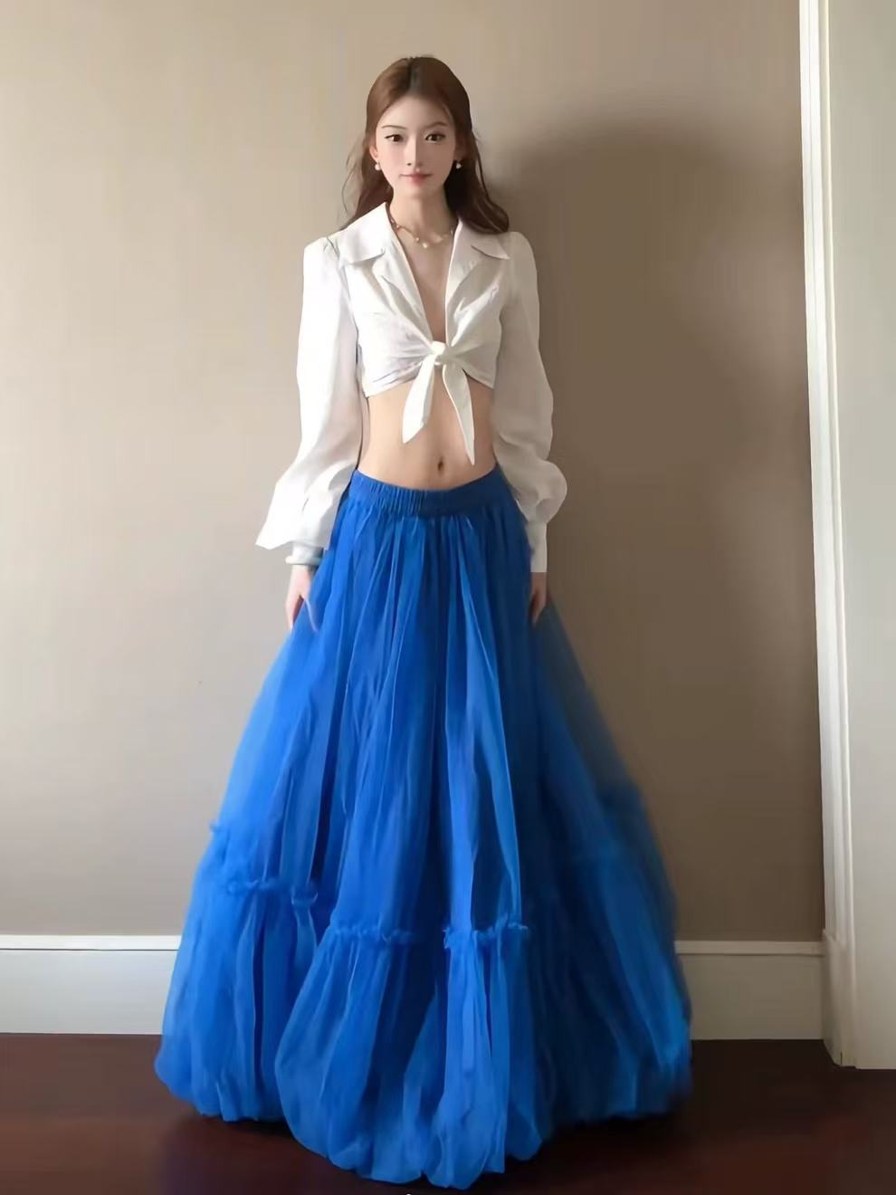 이중층 수묵화 헤일로 염색 망사 V넥 좋은 슬립 드레스 하이웨이스트 몸매 가꾸기 롱 스커트