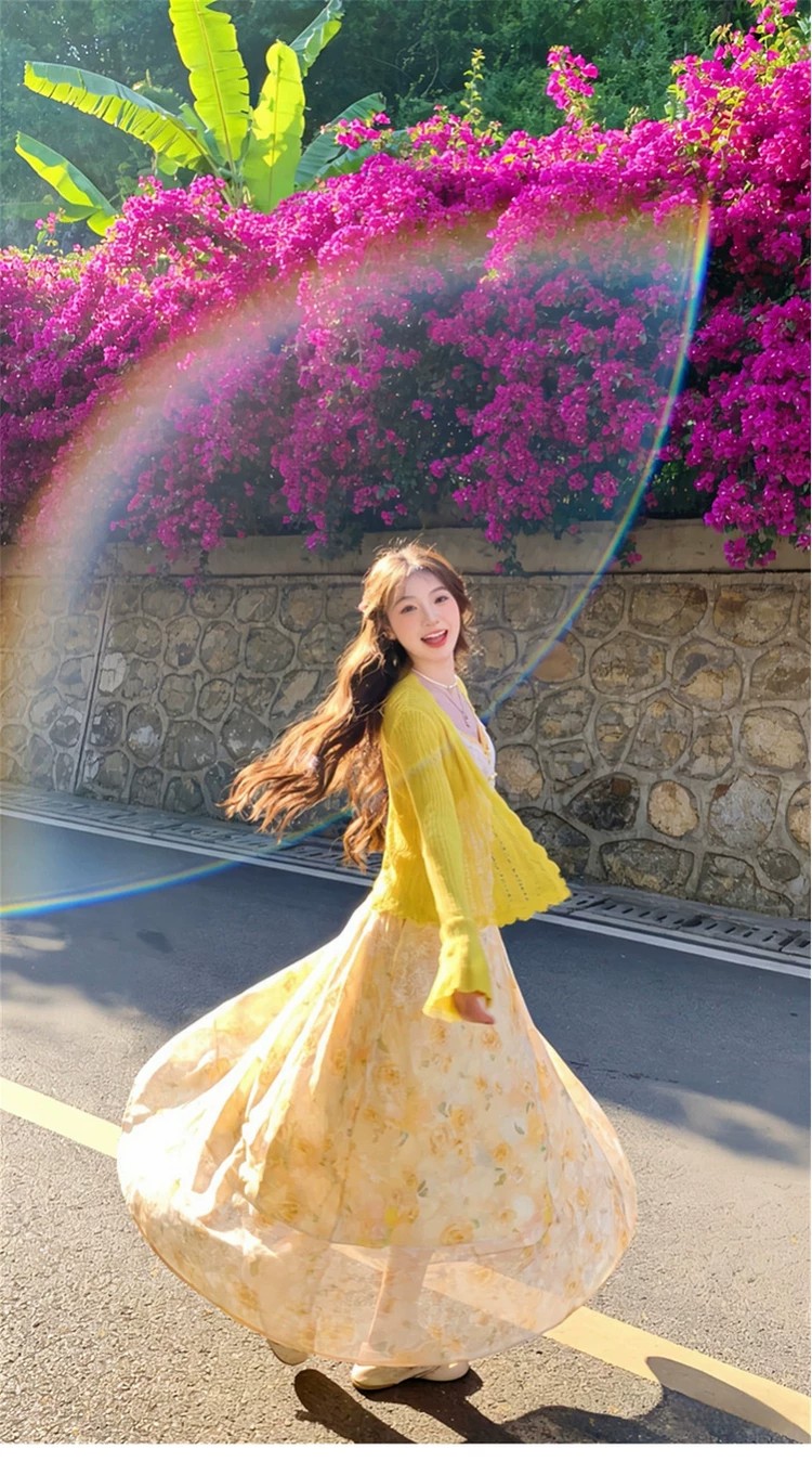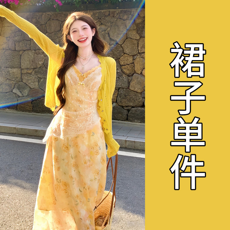 한 부서 분위기 센스 황색 레이스 슬립 꽃무늬 드레스 봄 여름 도파민 밝은 착용 가져 가라. 롱 스커트 세트