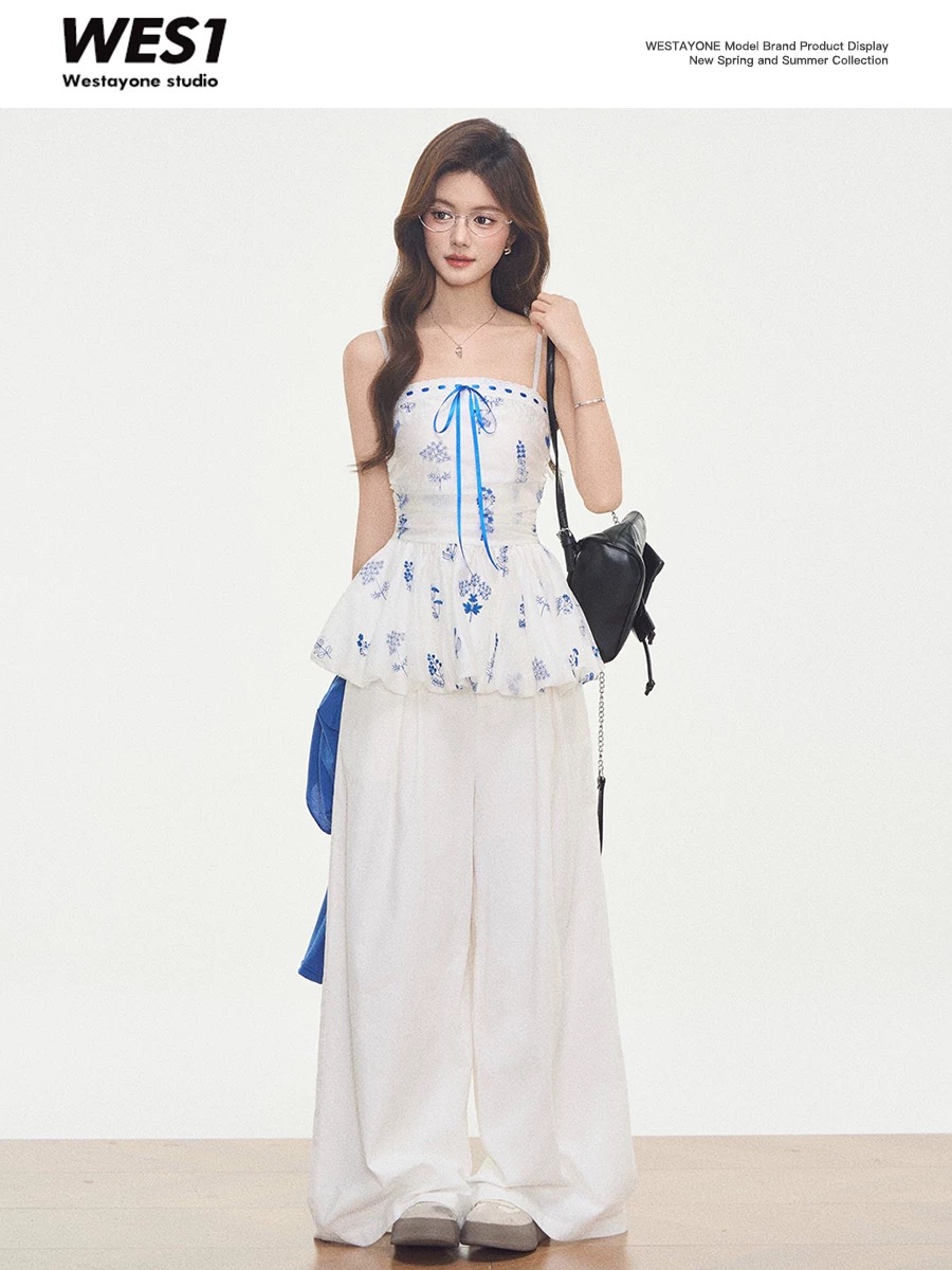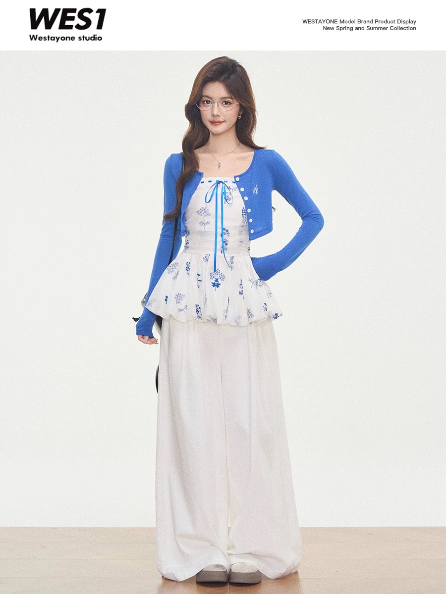 4.3 신제품 westayone 니트 자외선 차단 오픈 가디건 꽃무늬 슬립 드레스 맨위 모방 데님 와이드 레그 팬츠