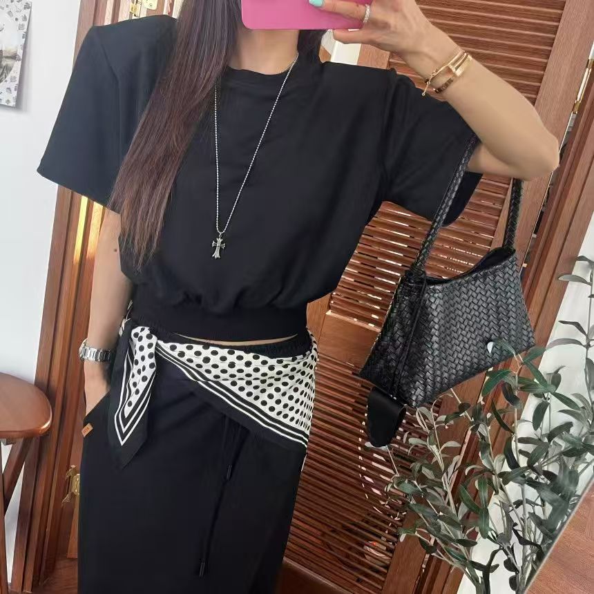 재고 있음 새로운 루즈핏 라운드 넥 반팔 티셔츠 허리밴드 펌프 로프 스트레이트 한 마디 반신 스커트 세트