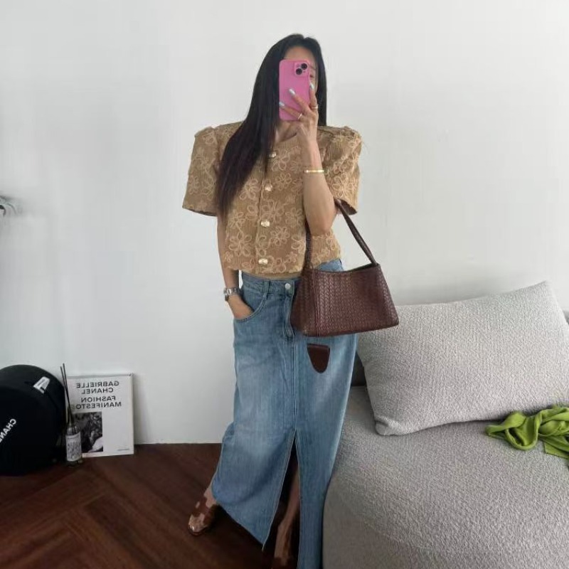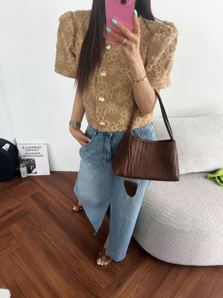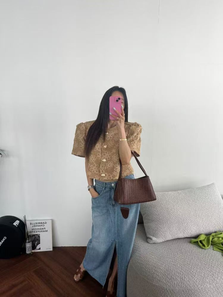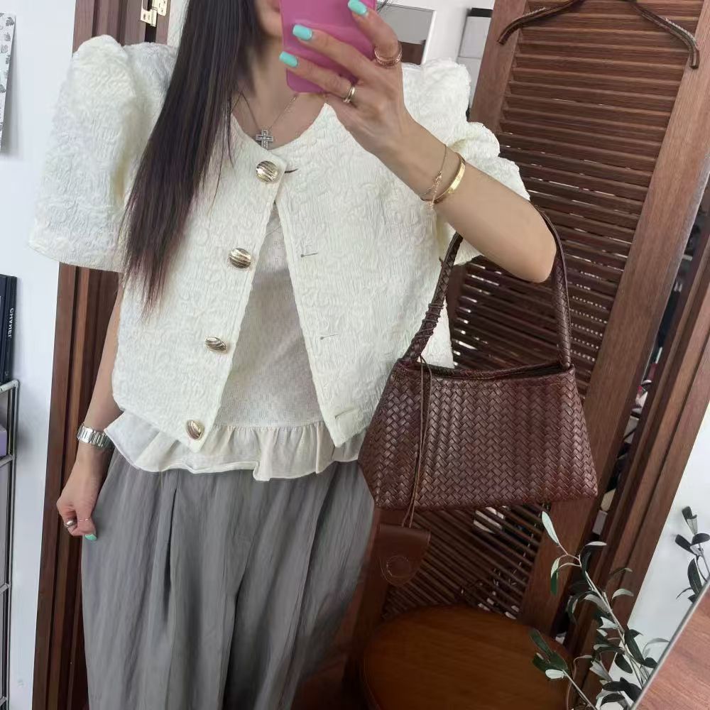 재고 있음 한국 chic 프랑스식 품격 공예 3 차원 자카드 캐주얼 다용도 거품 소매 셔츠