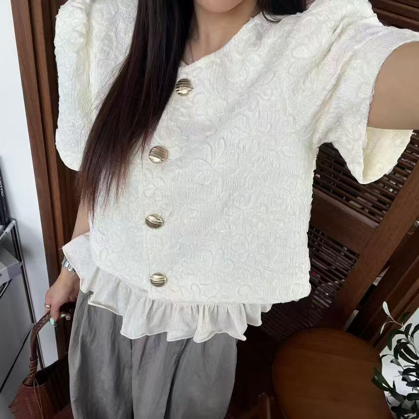 재고 있음 한국 여성 의류 해야한다 프랑스식 작은 샤넬 스타일 3 차원 꽃 자수 거품 소매 반팔 셔츠 여성 코트