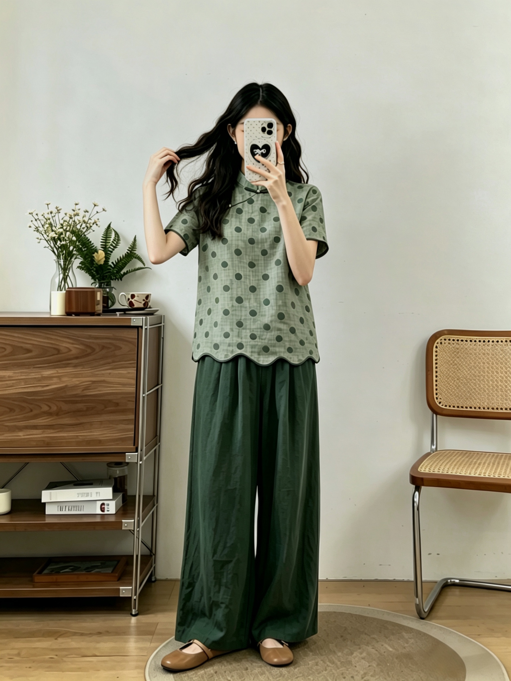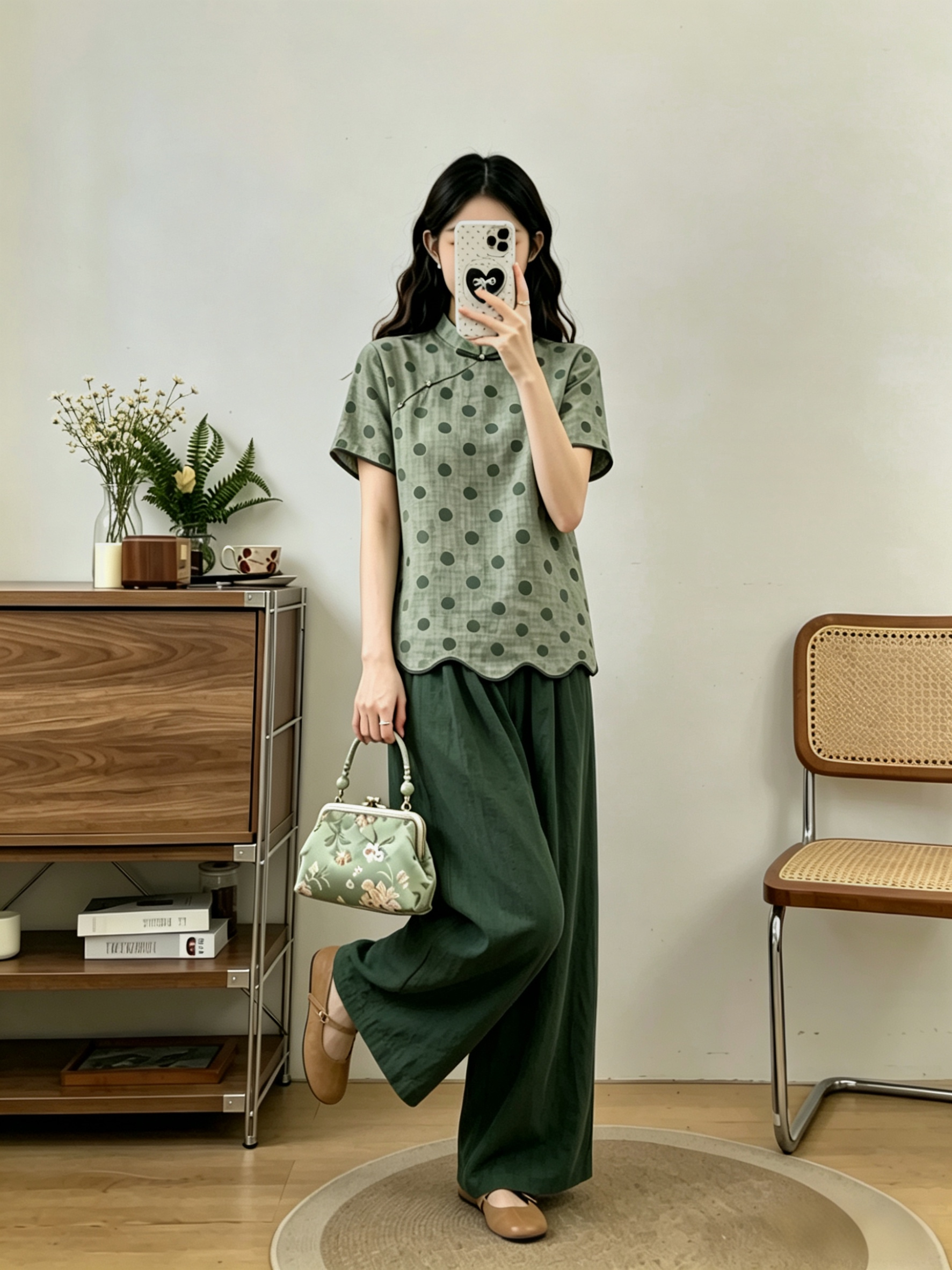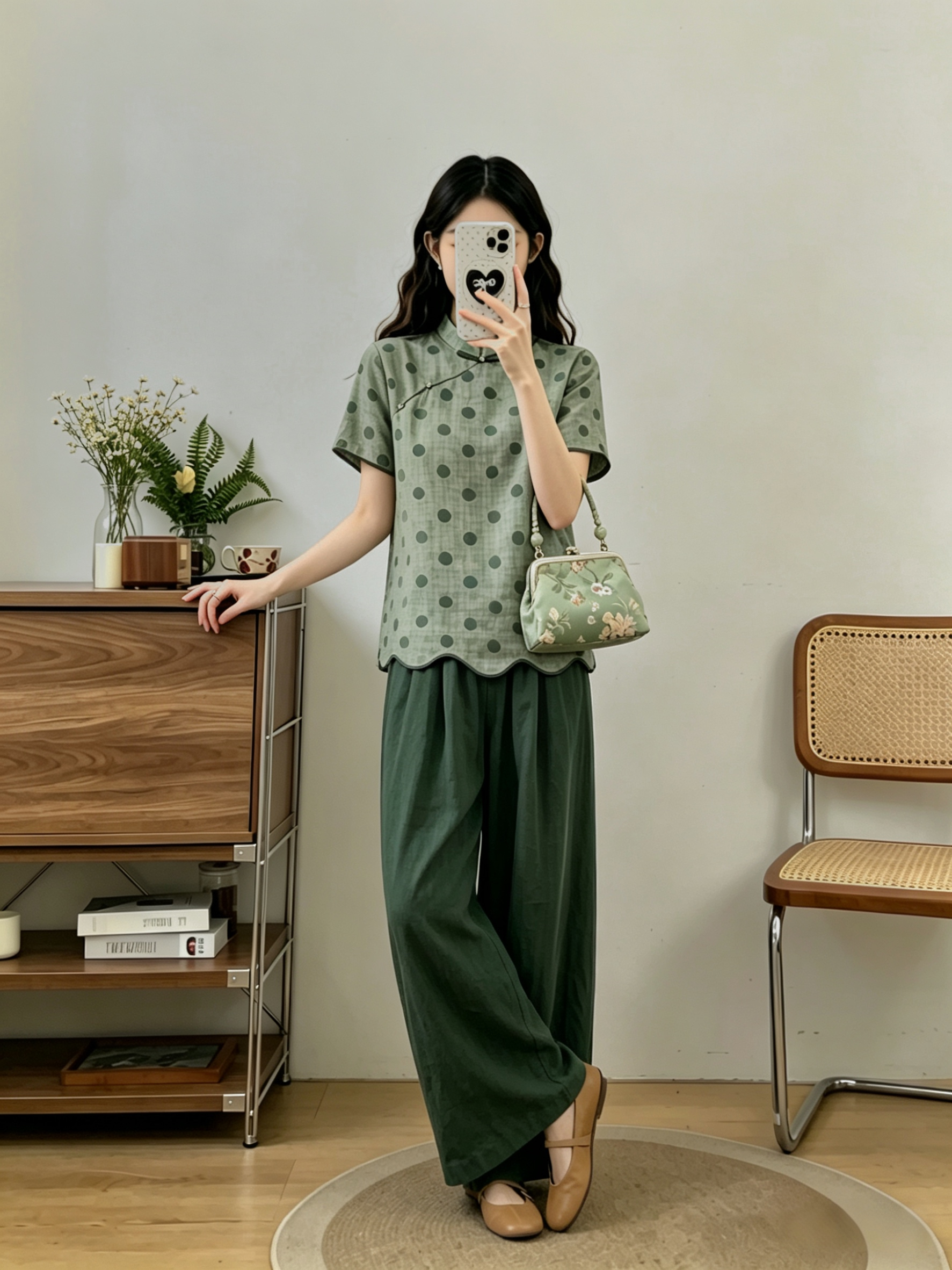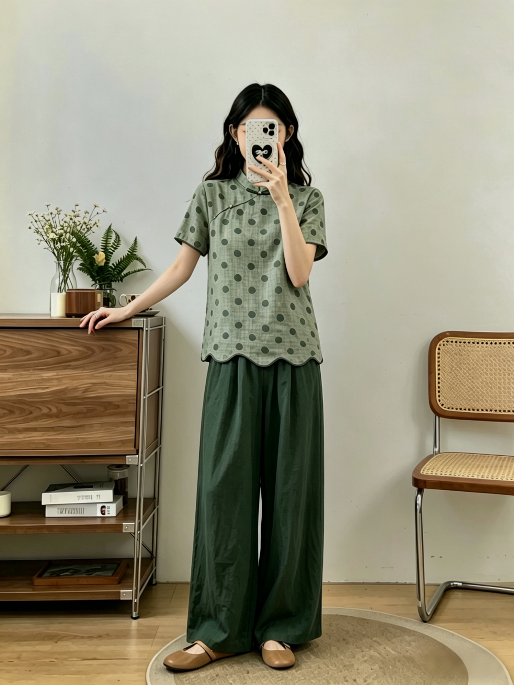 빅 사이즈 2026 돌아 가기 구름 푸 여름 새로운 중식 레트로 품격 슬림해 보이는 녹색 도트 맨위 긴 바지 두 조각 여성 세트