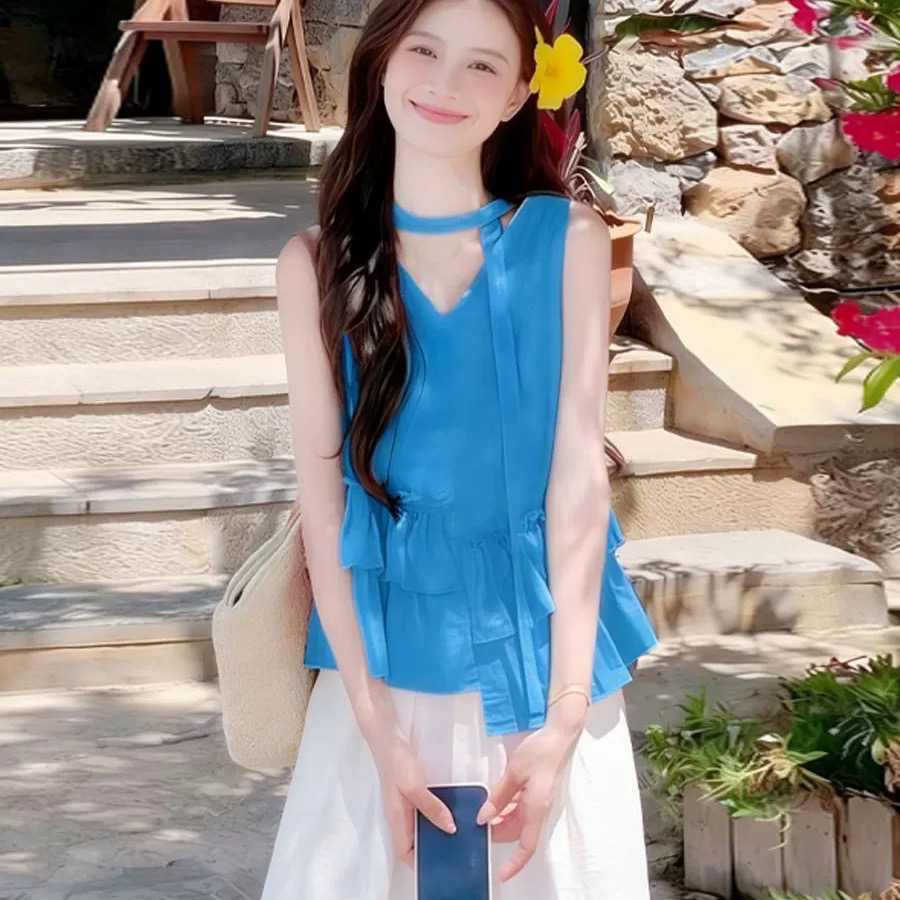 barb chill 감기 천 골드 분위기 센스 배색 슬립 오프숄더 여성 여름 슬림해 보이는 연꽃 잎 맨위