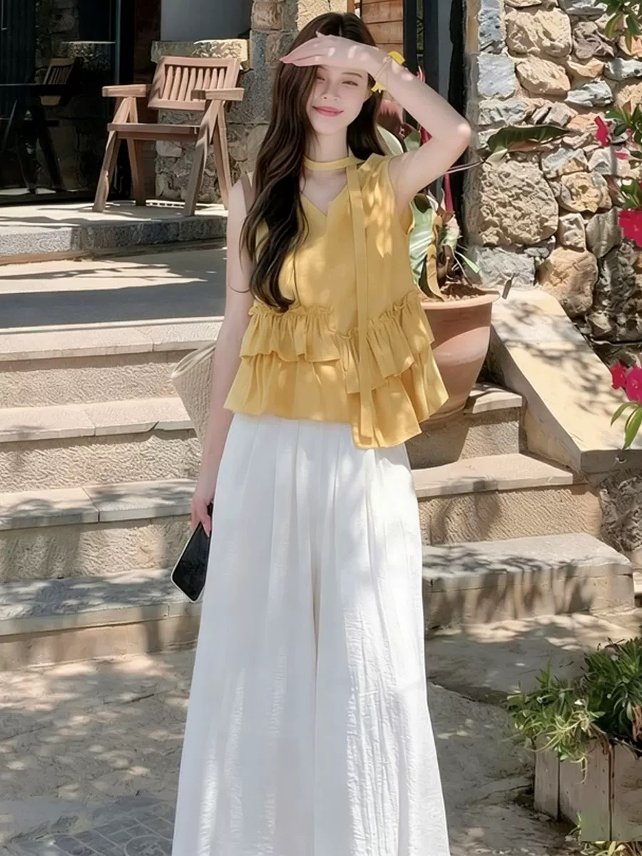 불규칙 프릴 달콤함 민소매 셔츠 캐주얼 와이드 레깅스 바지 2026 여름 새로운 패션 세트