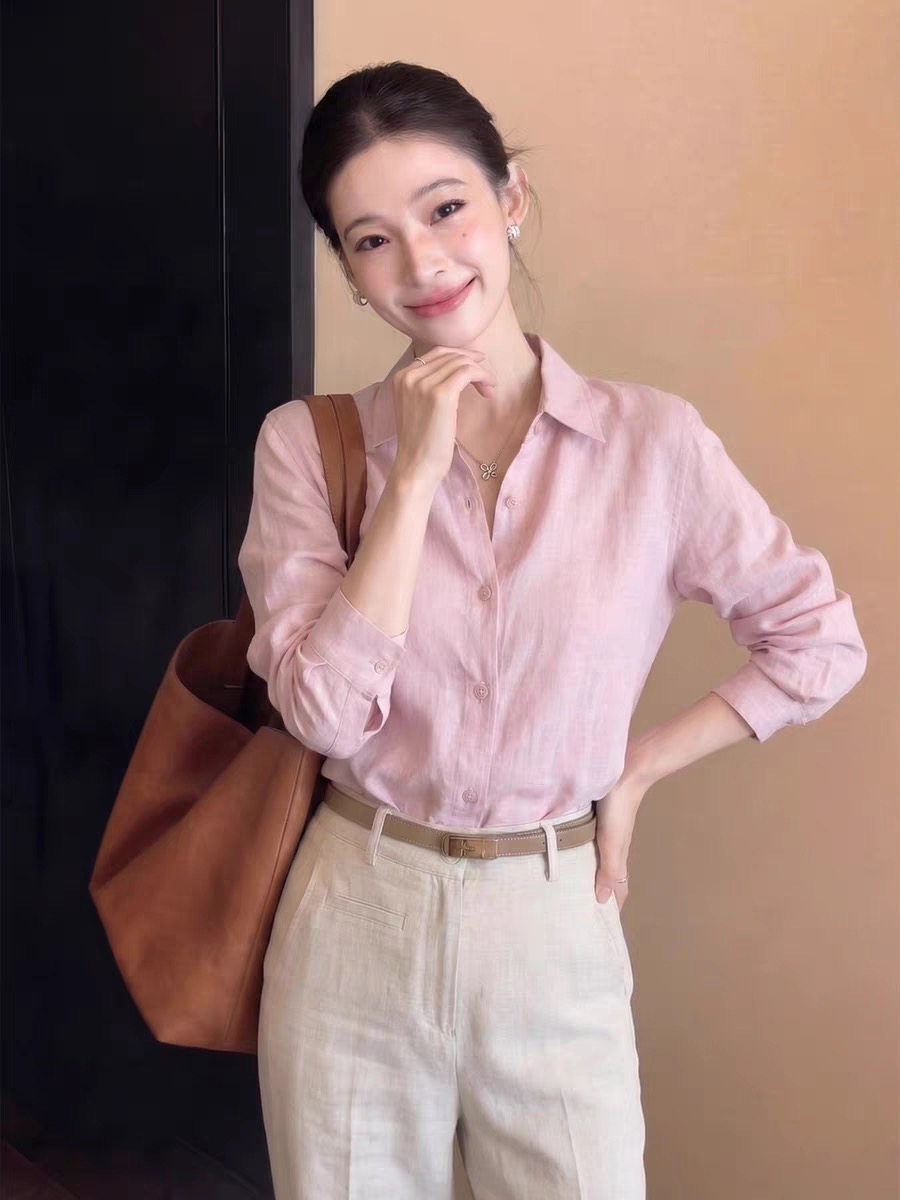 한 부서 핑크색 polo 폴로 칼라 긴팔 여성 셔츠 여름 오래된 돈 바람 품격 루즈핏 캐주얼 셔츠 자외선 차단 맨위