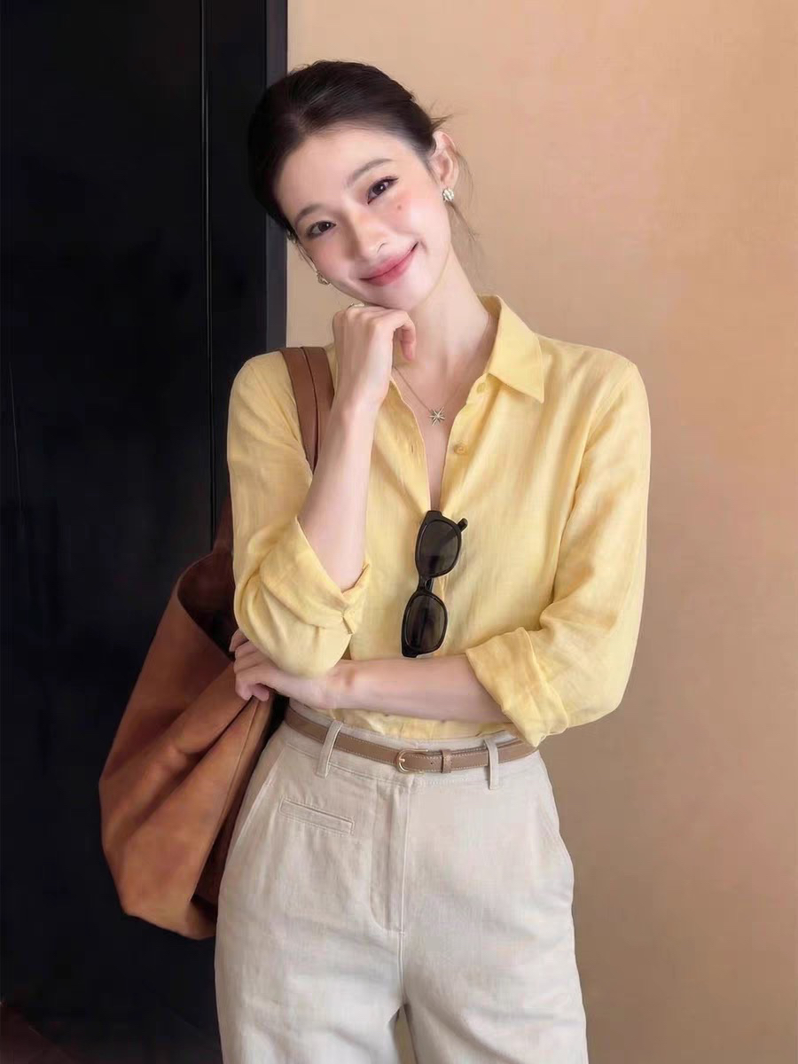 100 자연 순수 린넨 셔츠 V넥 자연 우아한 긴팔 셔츠 황색 자외선 차단 여성 셔츠 재킷 이른 봄