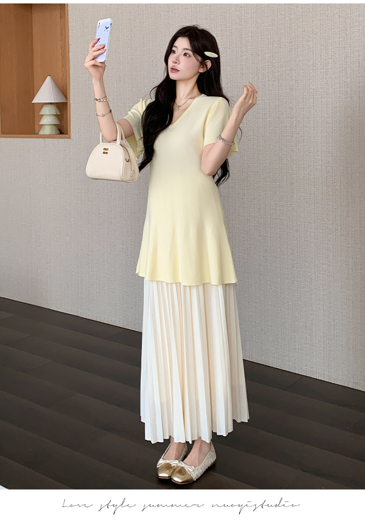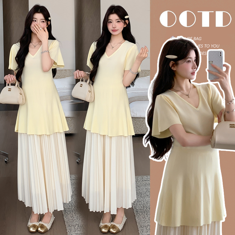 실사 지금 지금 높은 품질 얇은 스타일 차가운 센스 니트 임산부 여름 드레스 매운맛 엄마 몸매 가꾸기 V넥 임산부 드레스