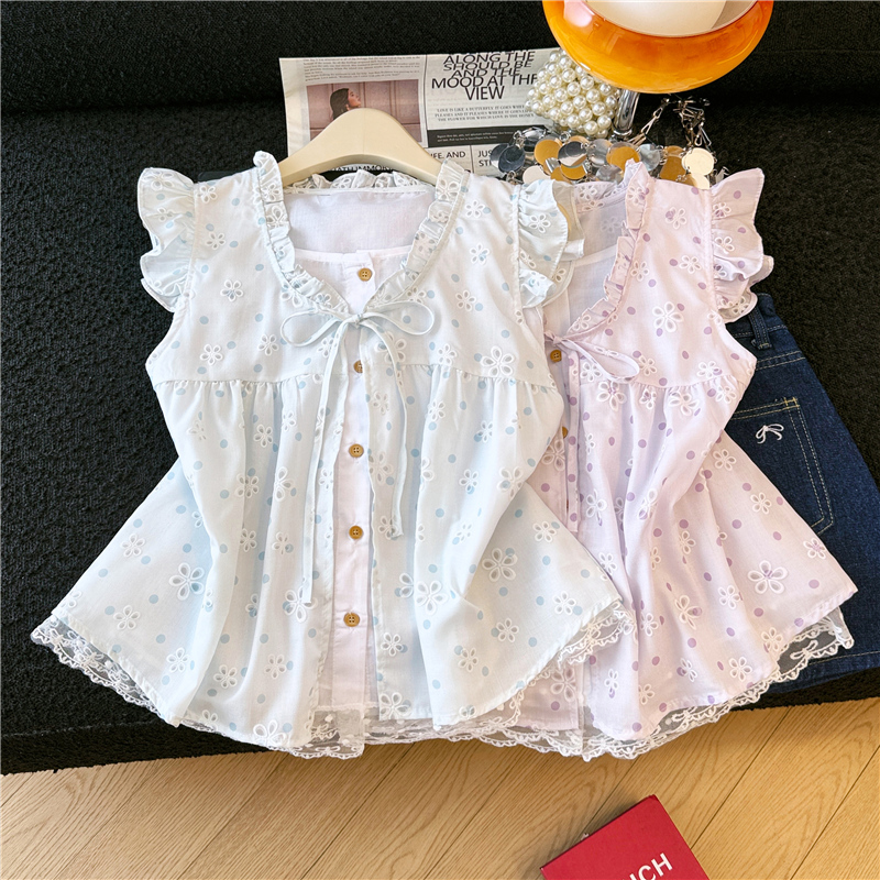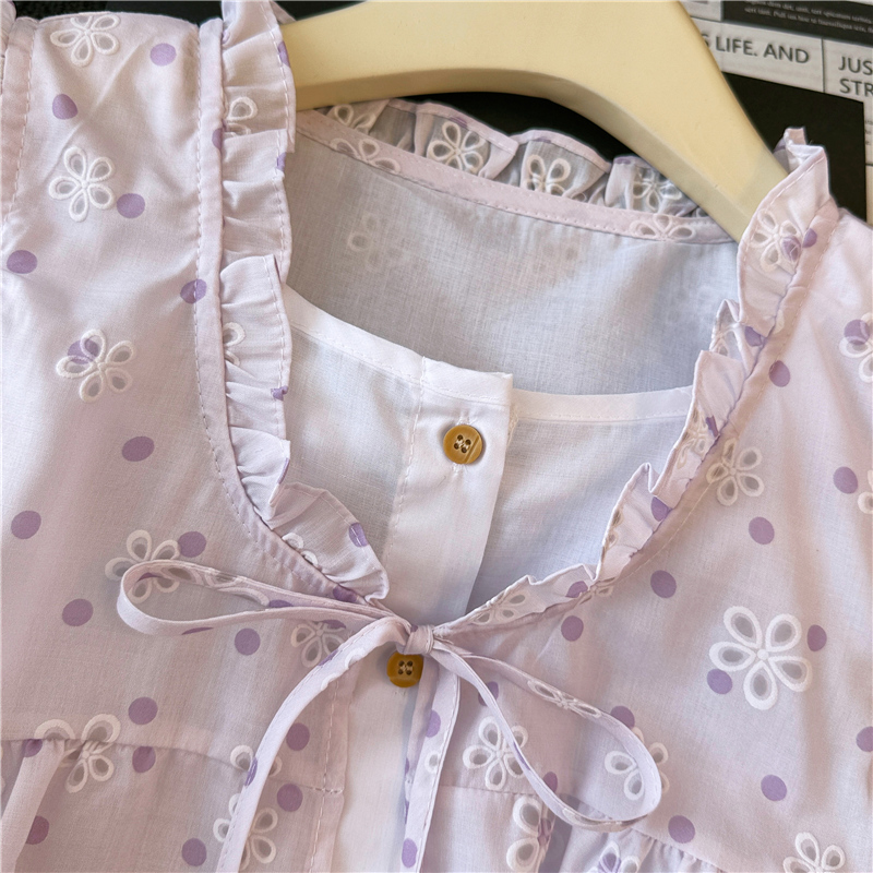 페이크 레이어드 프릴 V넥 도트 무늬 여성 셔츠 여름 연령 감소 귀여운 착용 가져 가라. 고유 한 아름다운 인형 셔츠 맨위