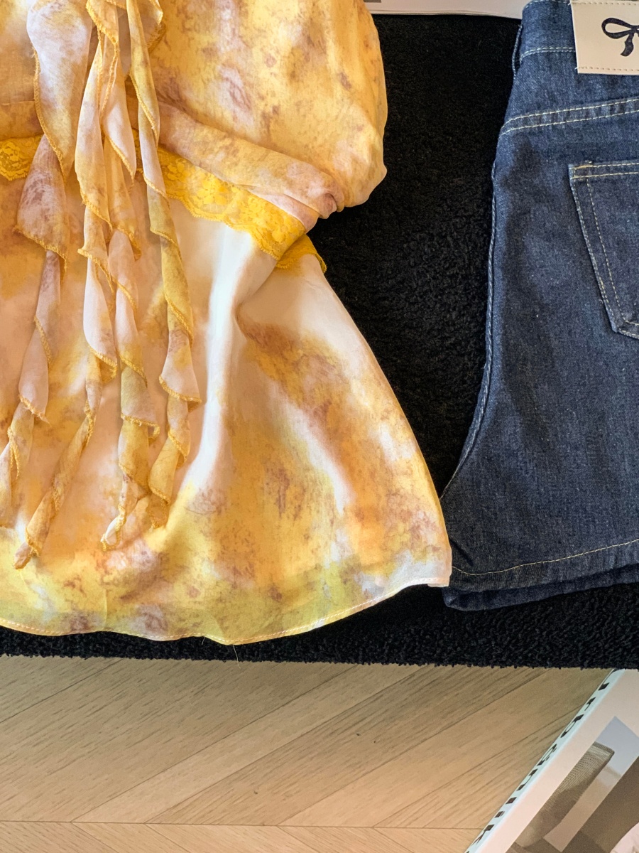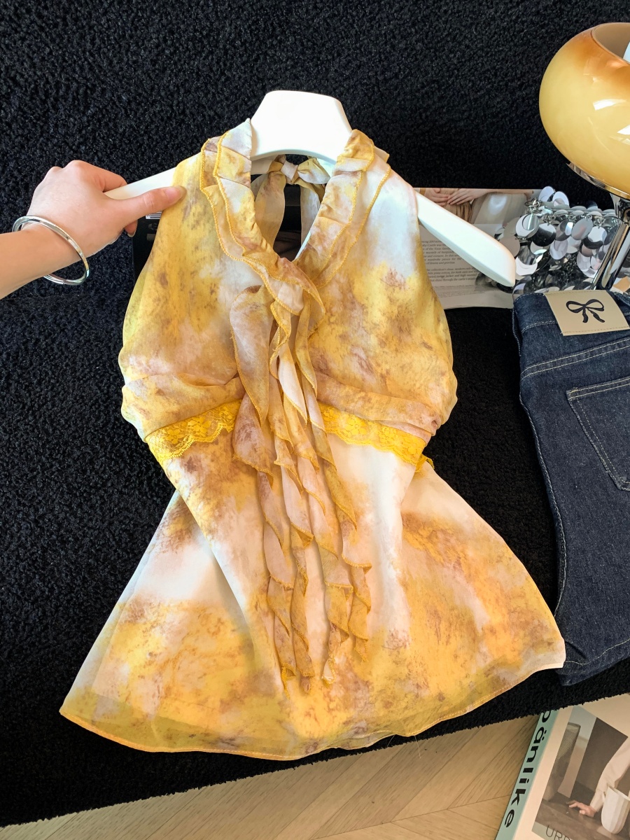 황색 프릴 행침 목 민소매 맨위 여성 2026 여름 새로운 순수한 욕망 디자인 센스 빅 사이즈 슬립 쉬폰 블라우스