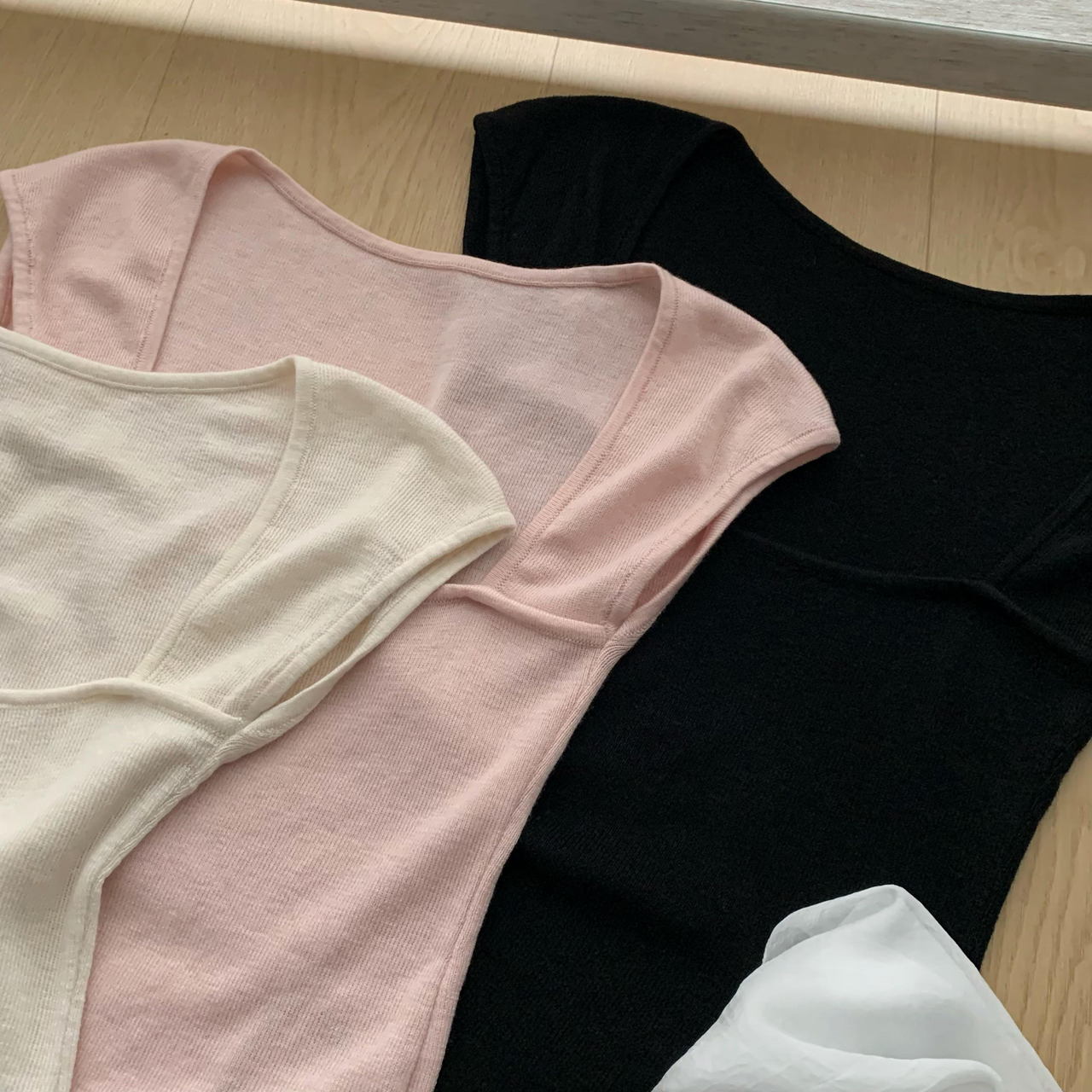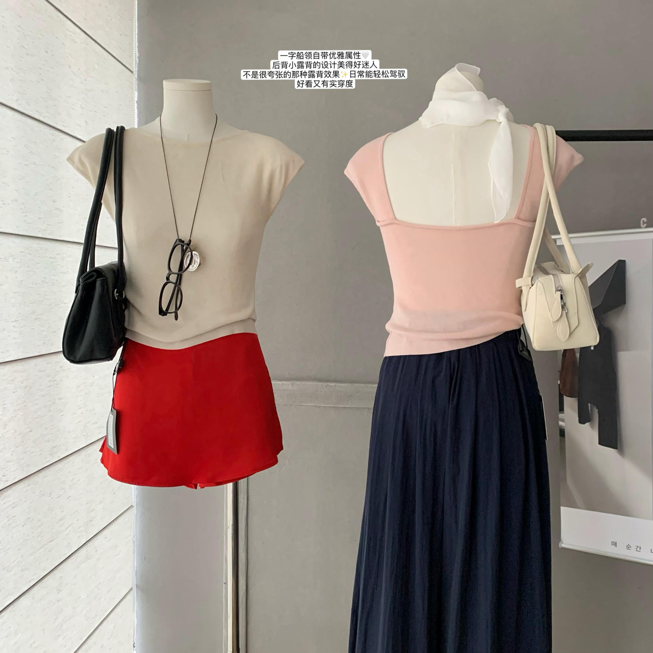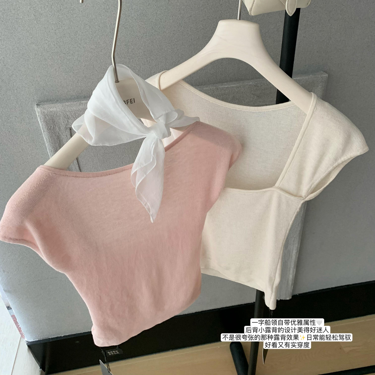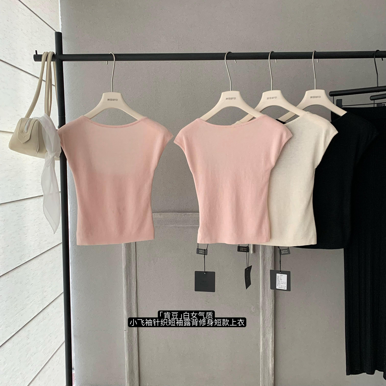 안녕하세요. 팬 팬 켄 콩 comfy 화이트 여성 품격 작은 날다 소매 니트 반팔 백리스 몸매 가꾸기 쇼트 스타일 맨위