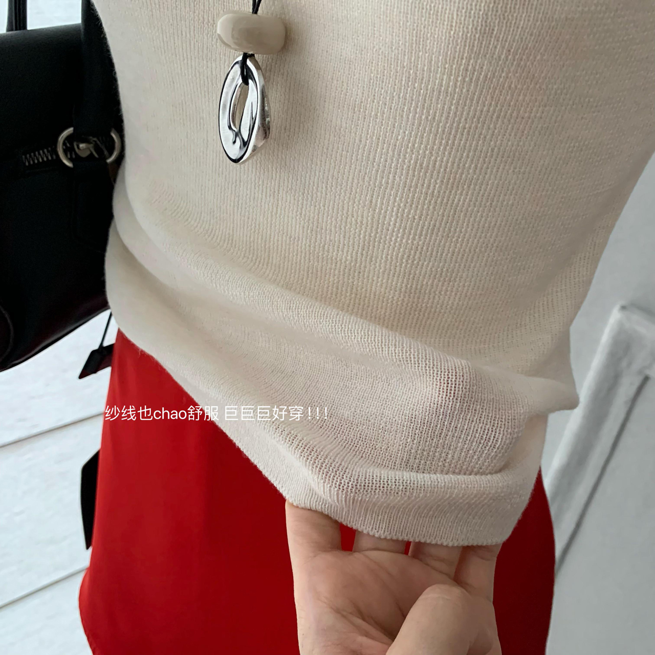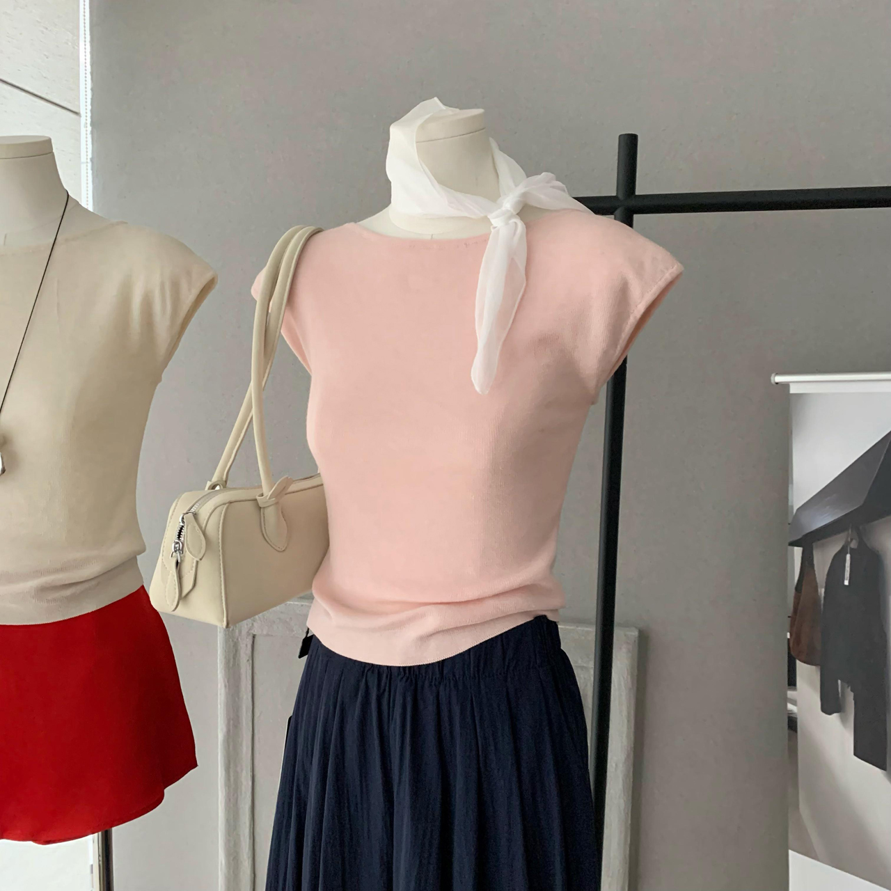 4pril 면 100% 니트 반하이넥 몸매 가꾸기 조끼 볼륨 측면 반팔 티셔츠