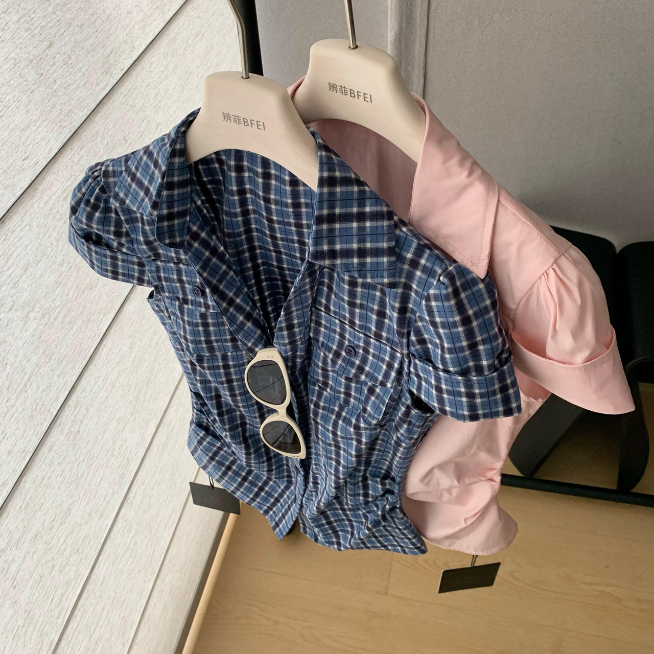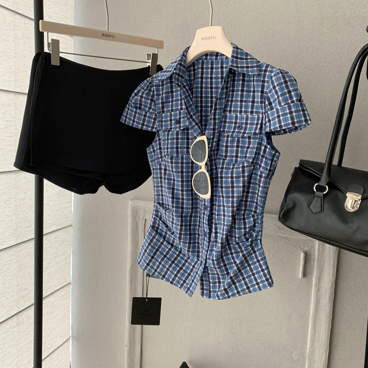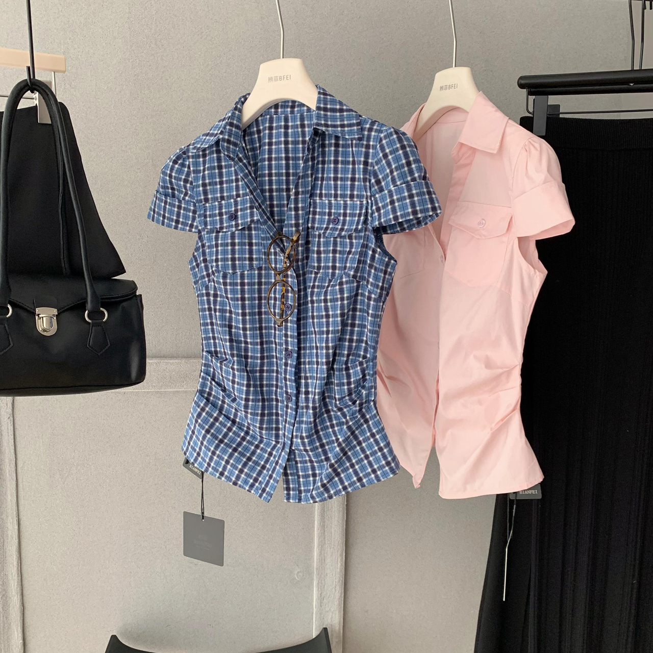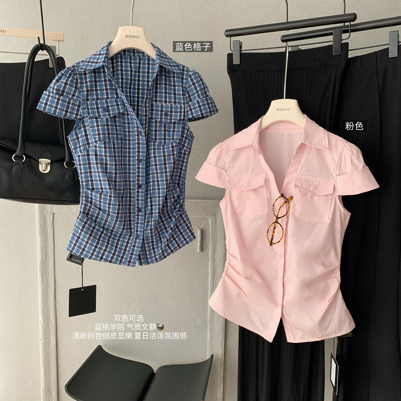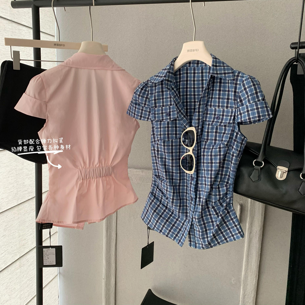 soote season 오리지널 한 부서 꼬집기 허리 몸매 가꾸기 슬림해 보이는 반팔 주머니 허리 수축 품격 셔츠 맨위 여성