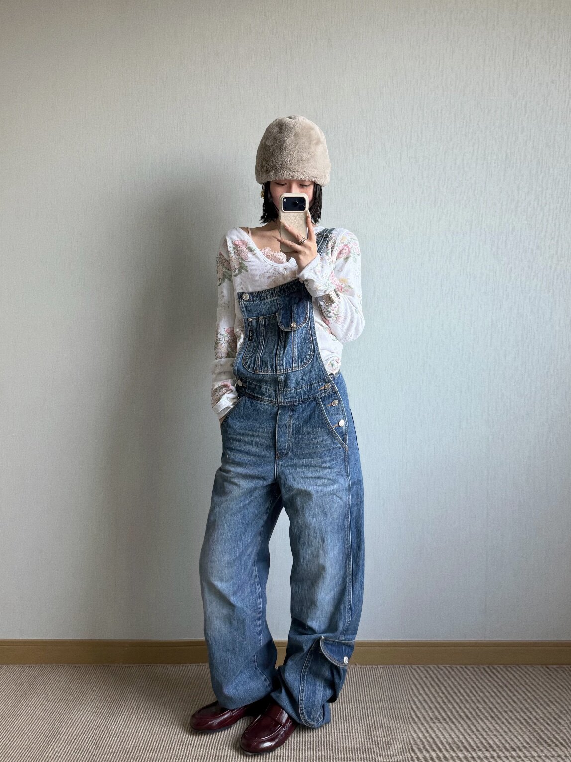 청춘 멜빵 바지 중 로우 웨이스트 넓은 다리 워크웨어 청바지 여성 봄 긴 바지