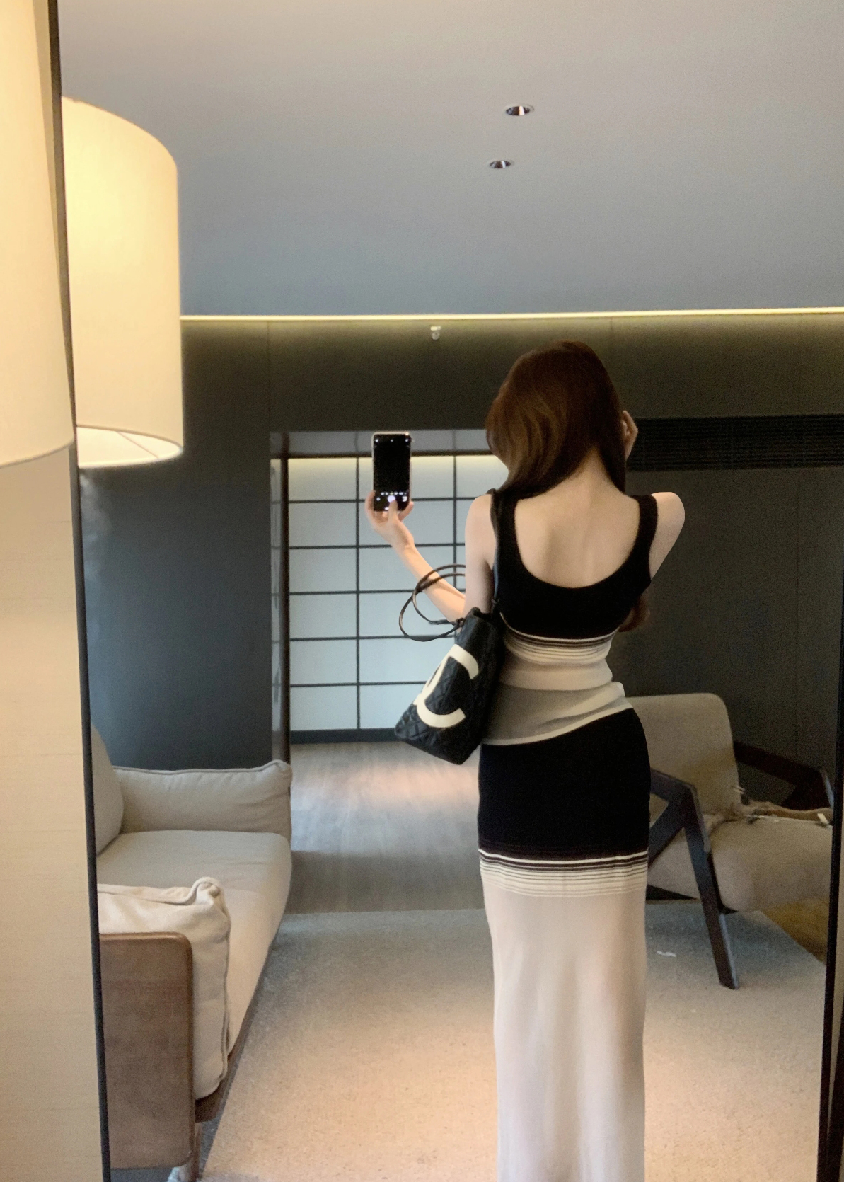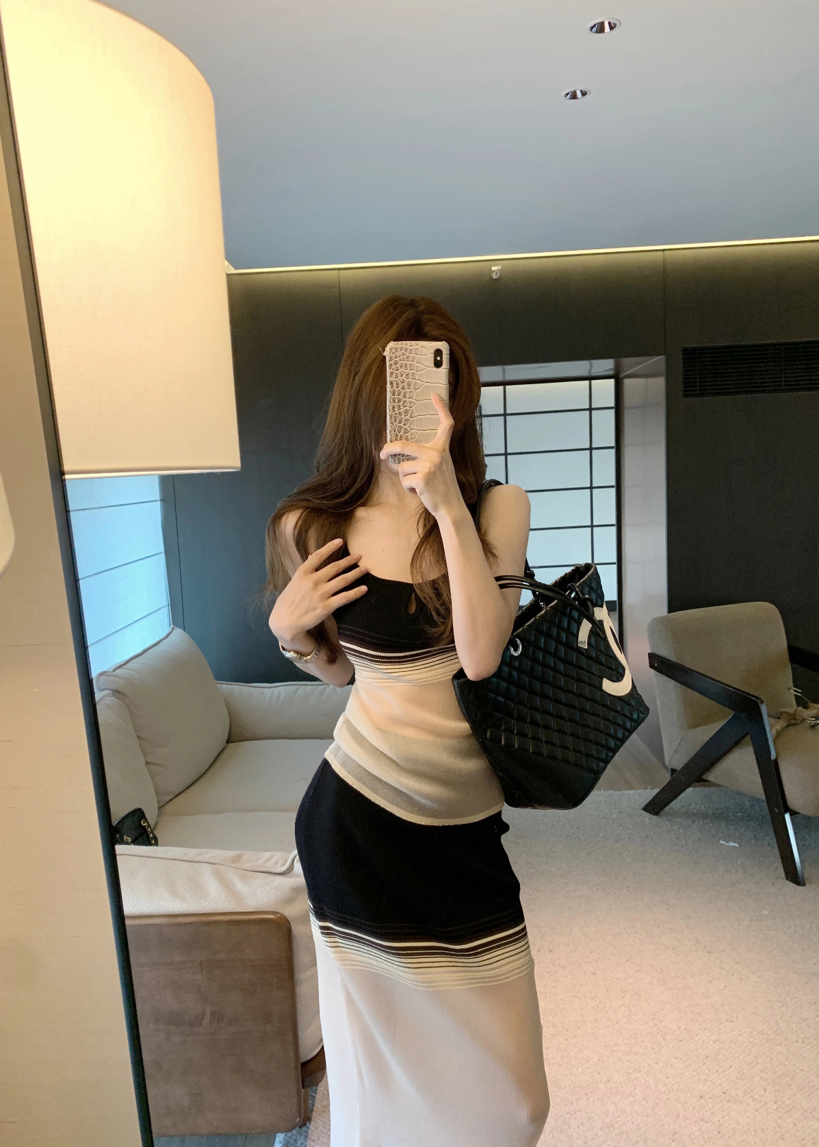 한 부서 디자인 센스 배색 몸매 가꾸기 스트라이프 슬립 맨위 2026 새로운 순수한 욕망 품격 슬림해 보이는 반신 치마 세트