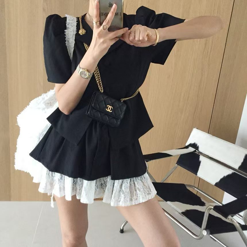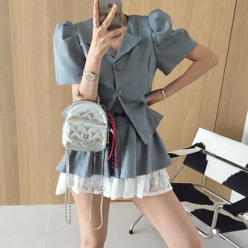 한국 동대문 새로운 달콤한 차가운 레트로 거품 소매 짧은 정장 여성 코트 레이스 조각 반신 치마 세트