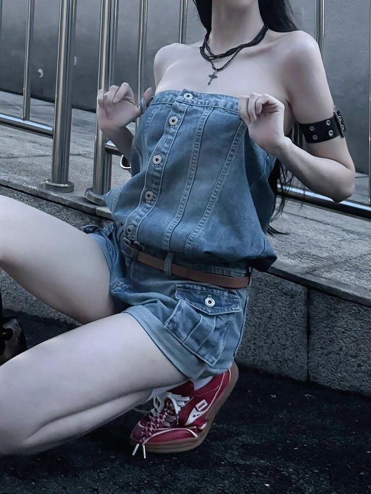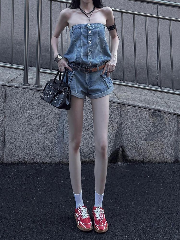 아메리칸 레트로 핫걸 민소매 튜브탑 데님 올인원 바지 여성 의류 여름 Chic 원피스 바지 슬림해 보이는 파란색 반바지