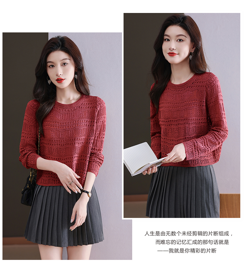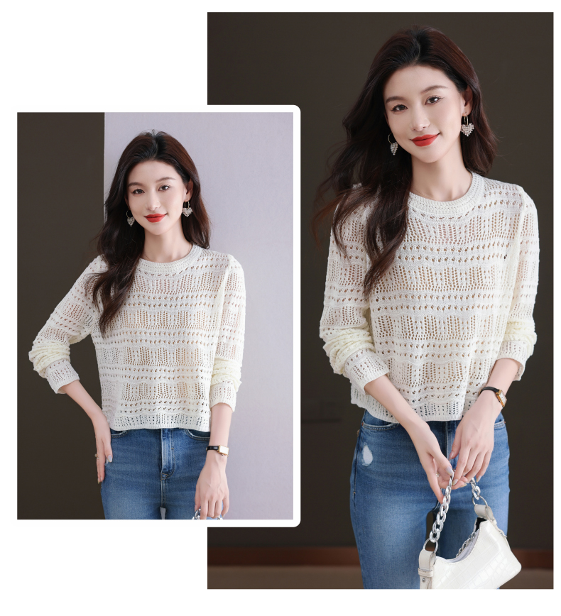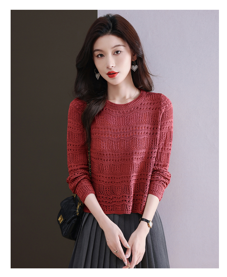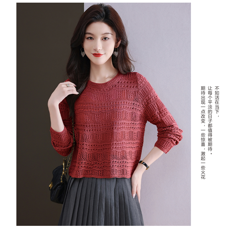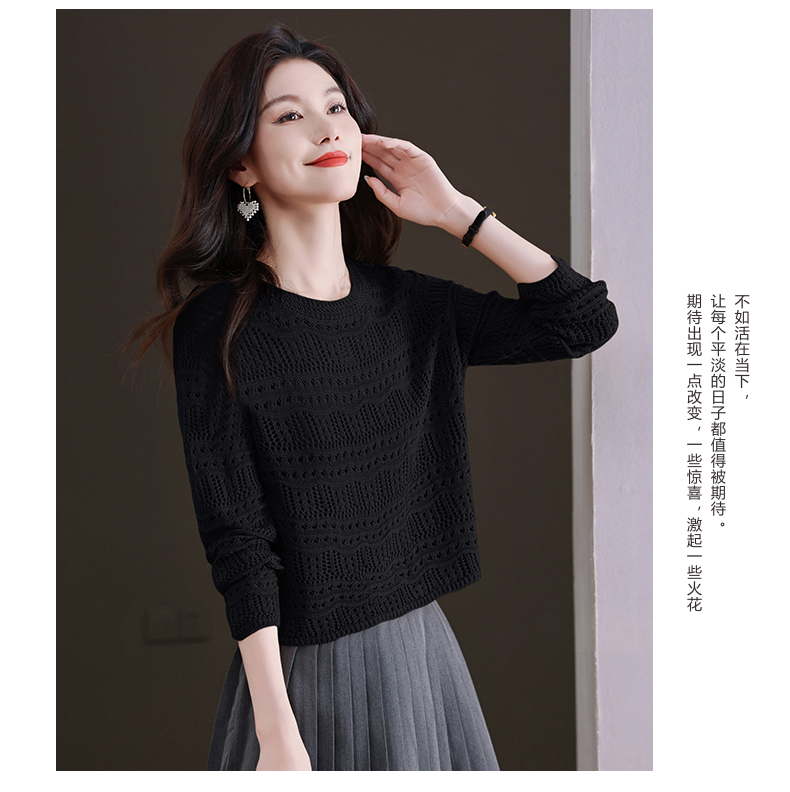 2026 봄 여름 디자인 센스 루즈핏 쇼트 스타일 라운드 넥 니트 스웨터 레트로 홀로우 아웃 이후 트임 긴팔 맨위 블라우스 여성