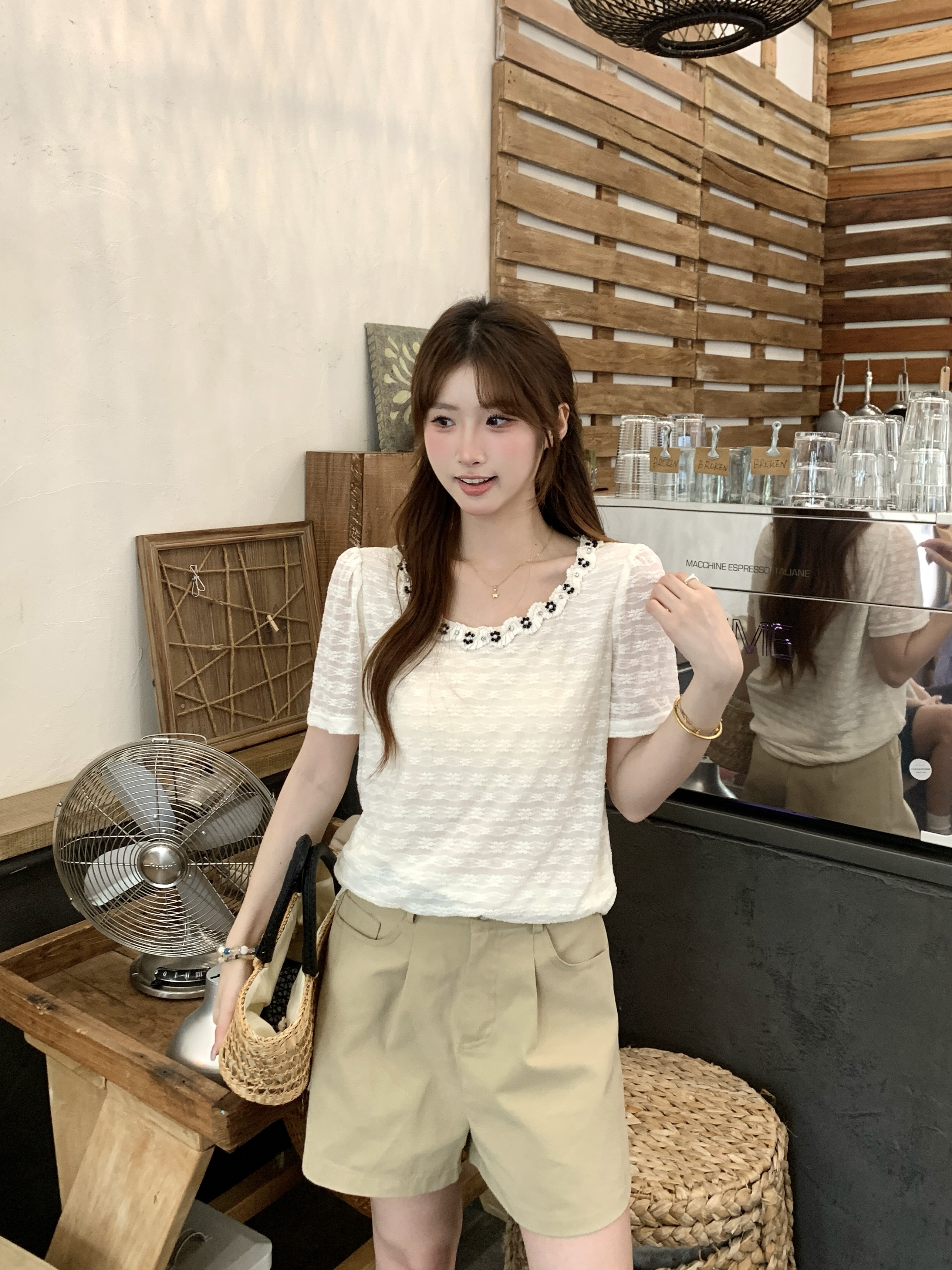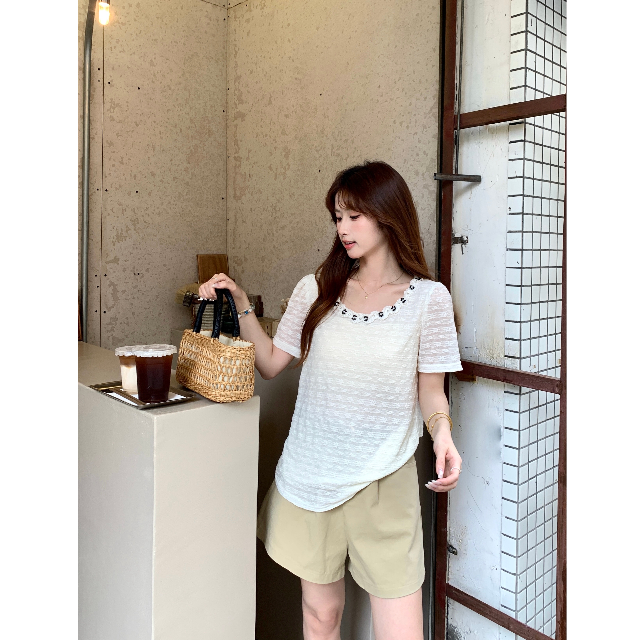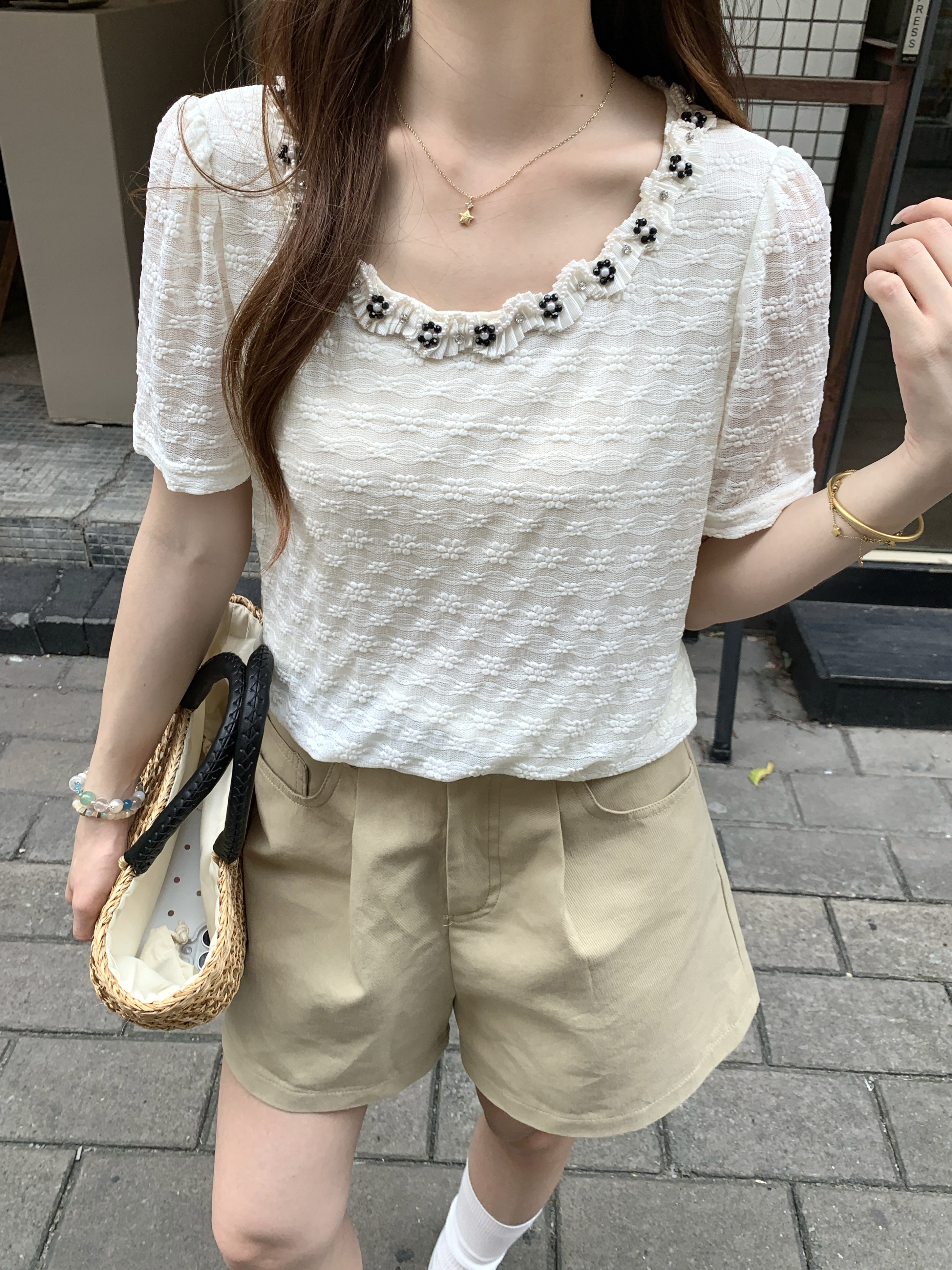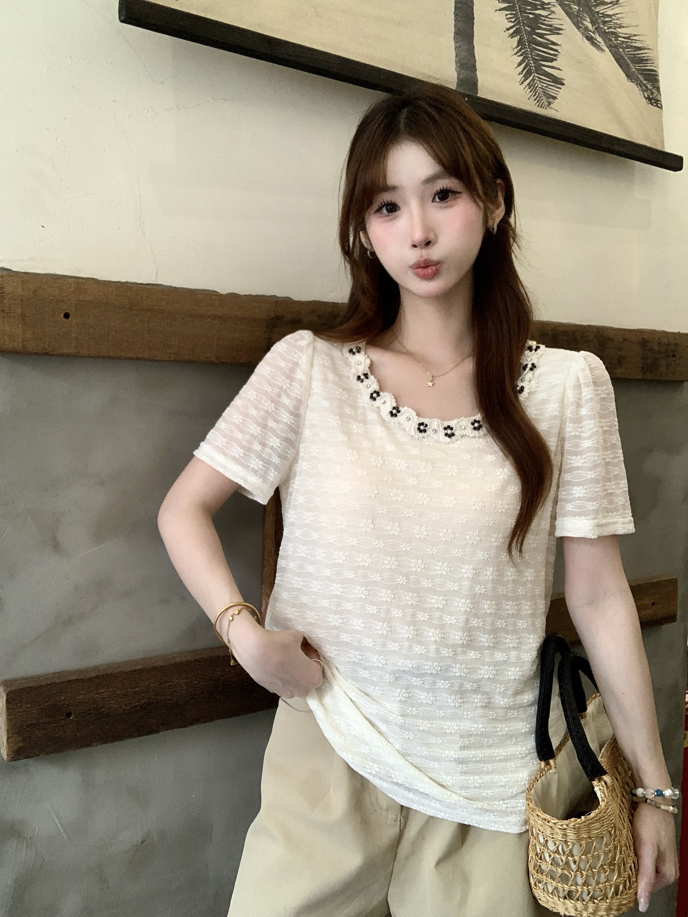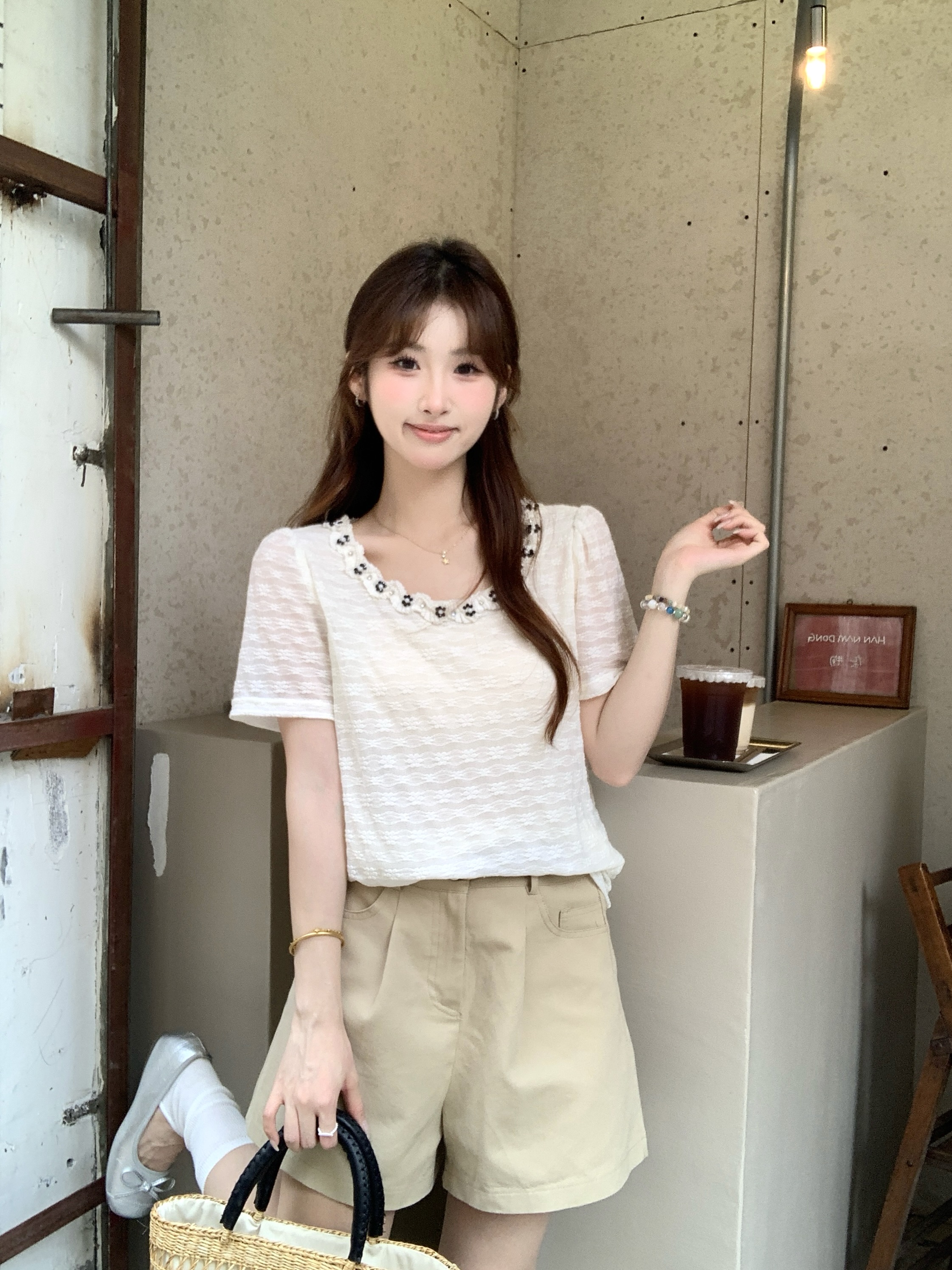 gs.good start 한 부서 부드러운 여름 분위기 센스 캐주얼 프린트 작은 셔츠 레이스 조끼 세트