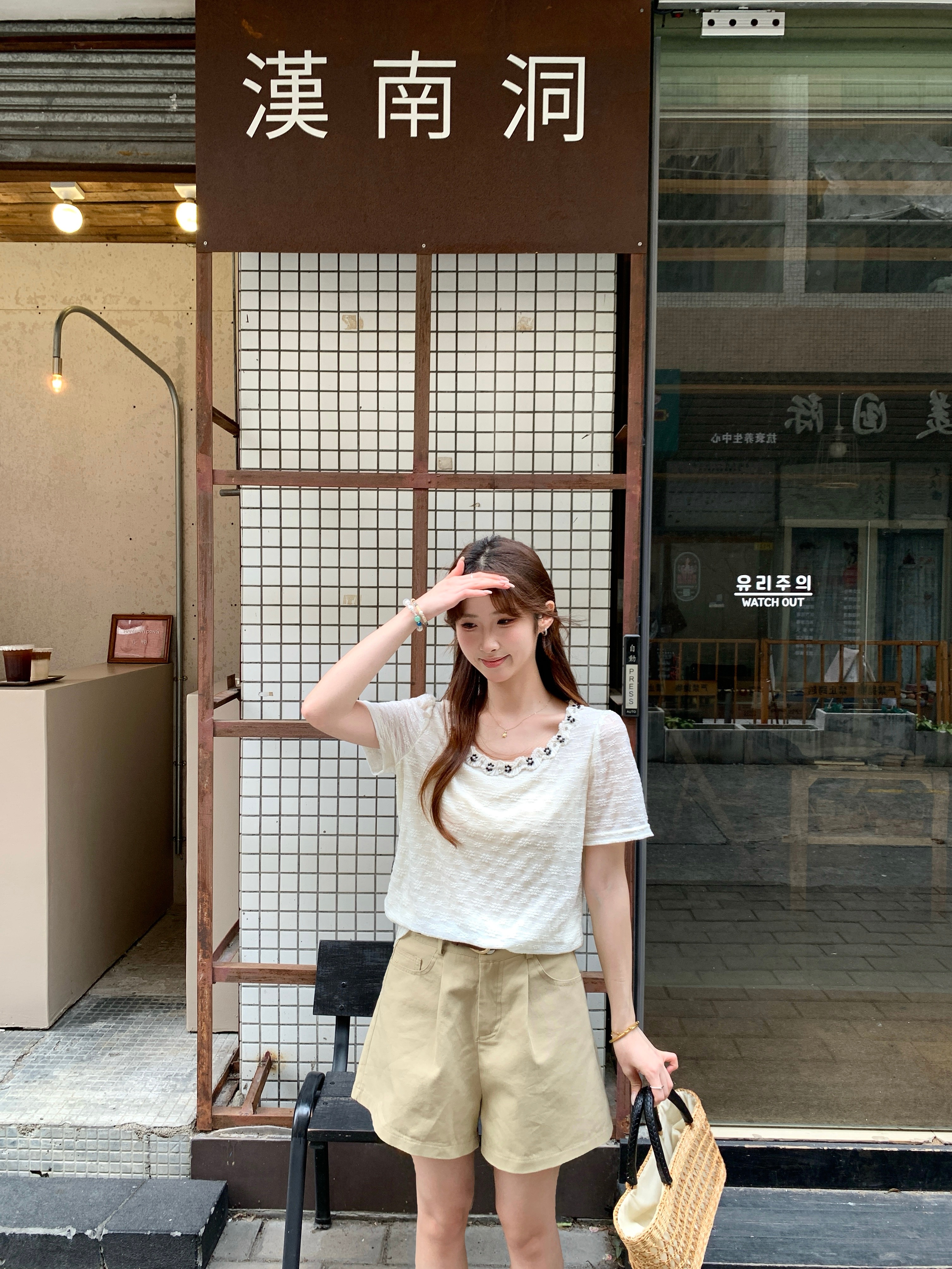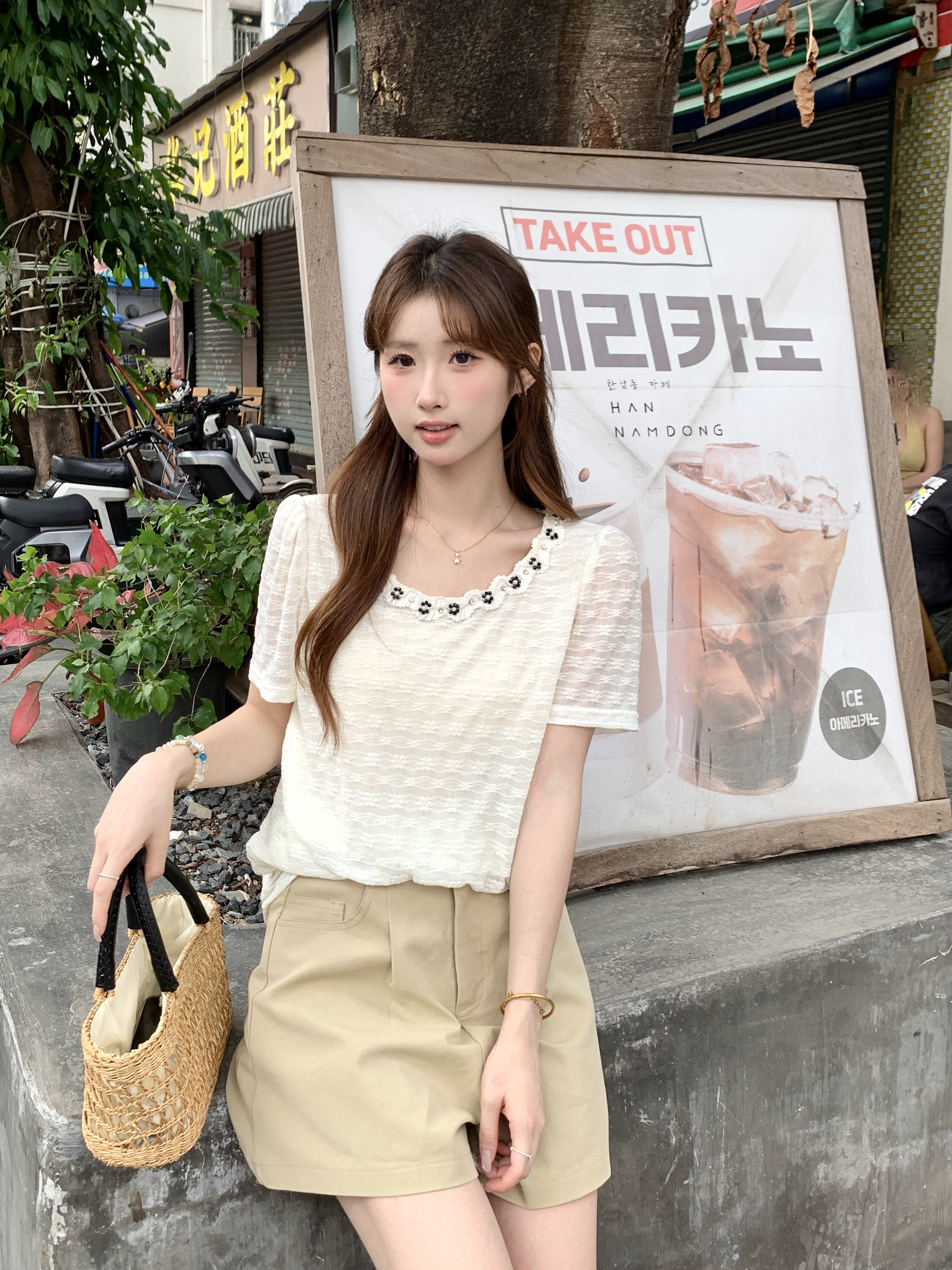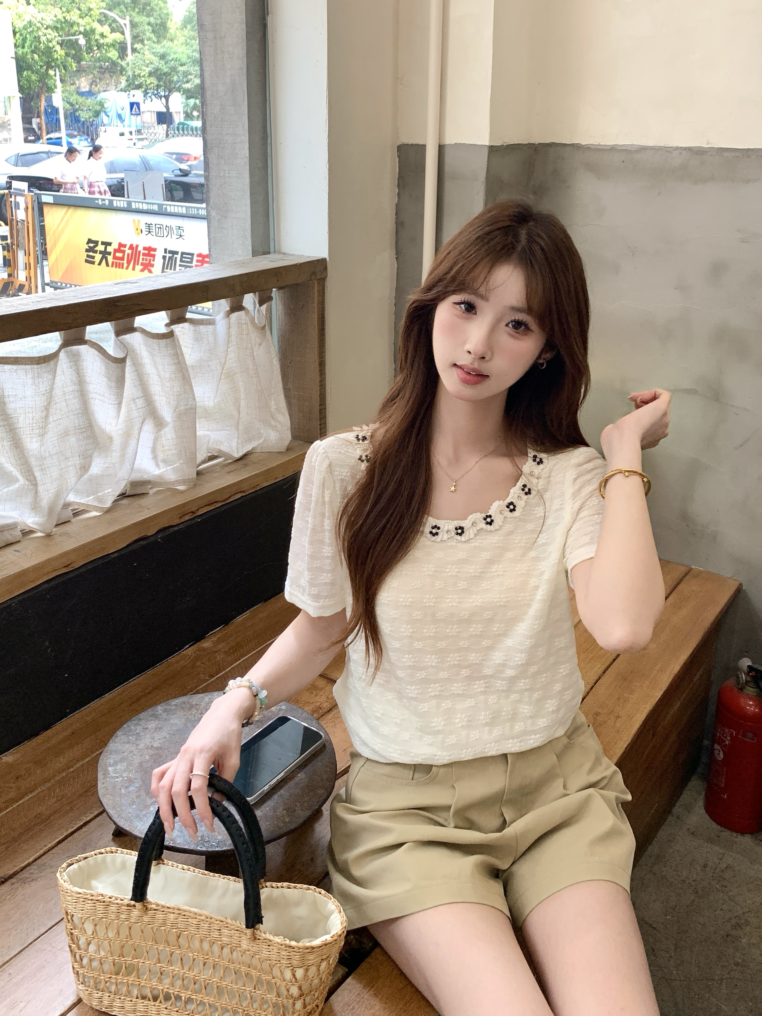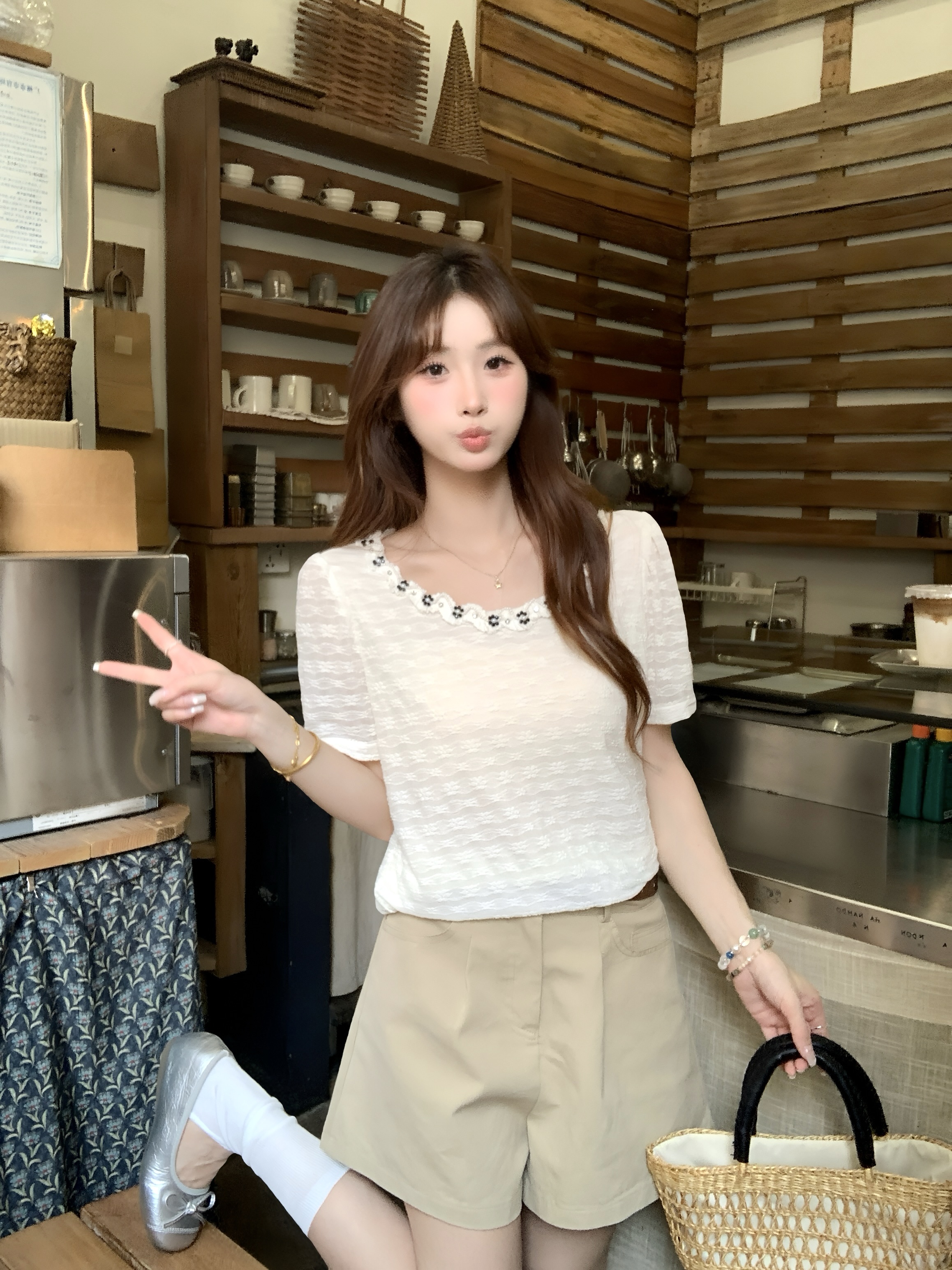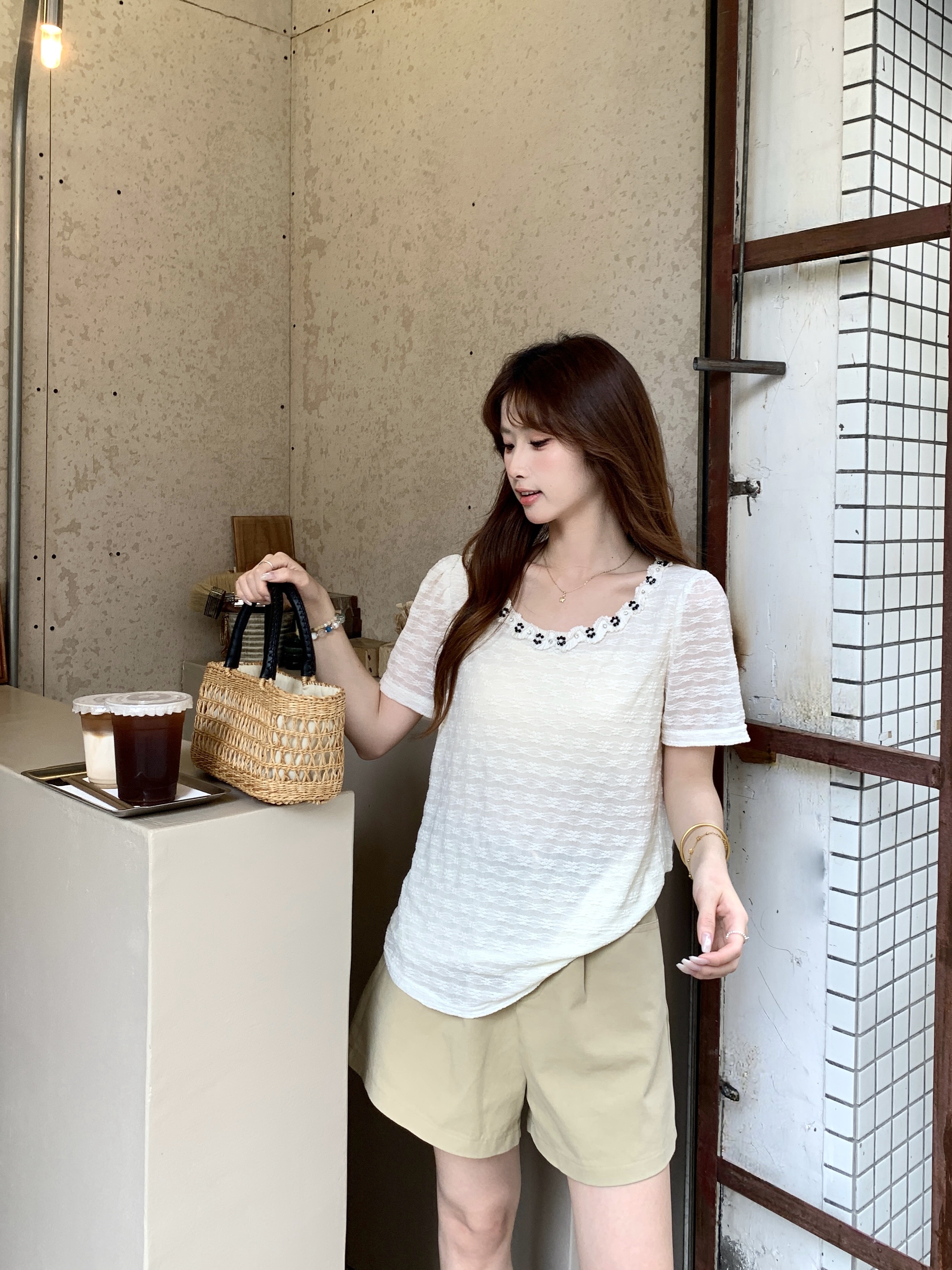 gs.good start 한 부서 부드러운 여름 분위기 센스 캐주얼 프린트 작은 셔츠 레이스 조끼 세트