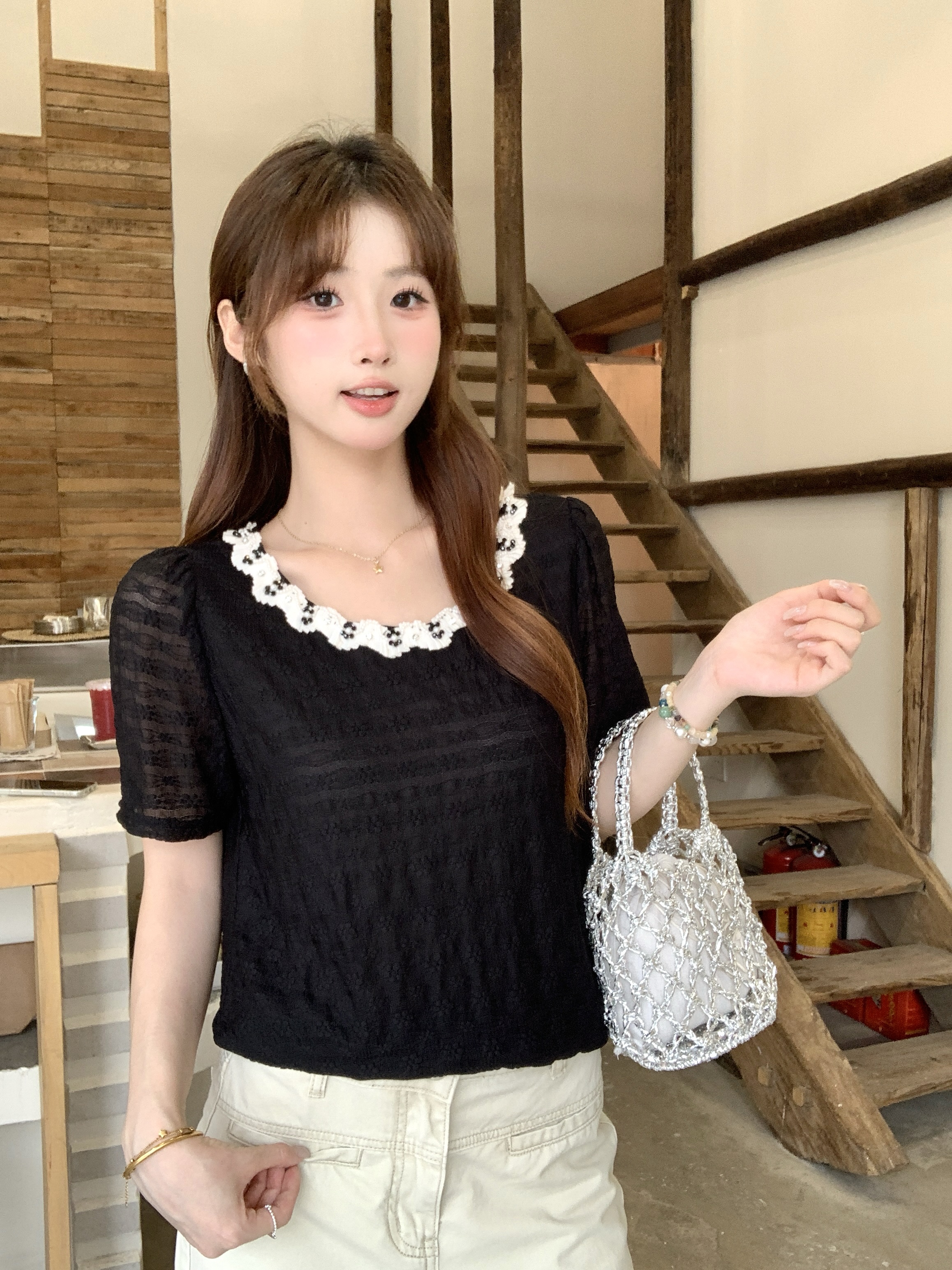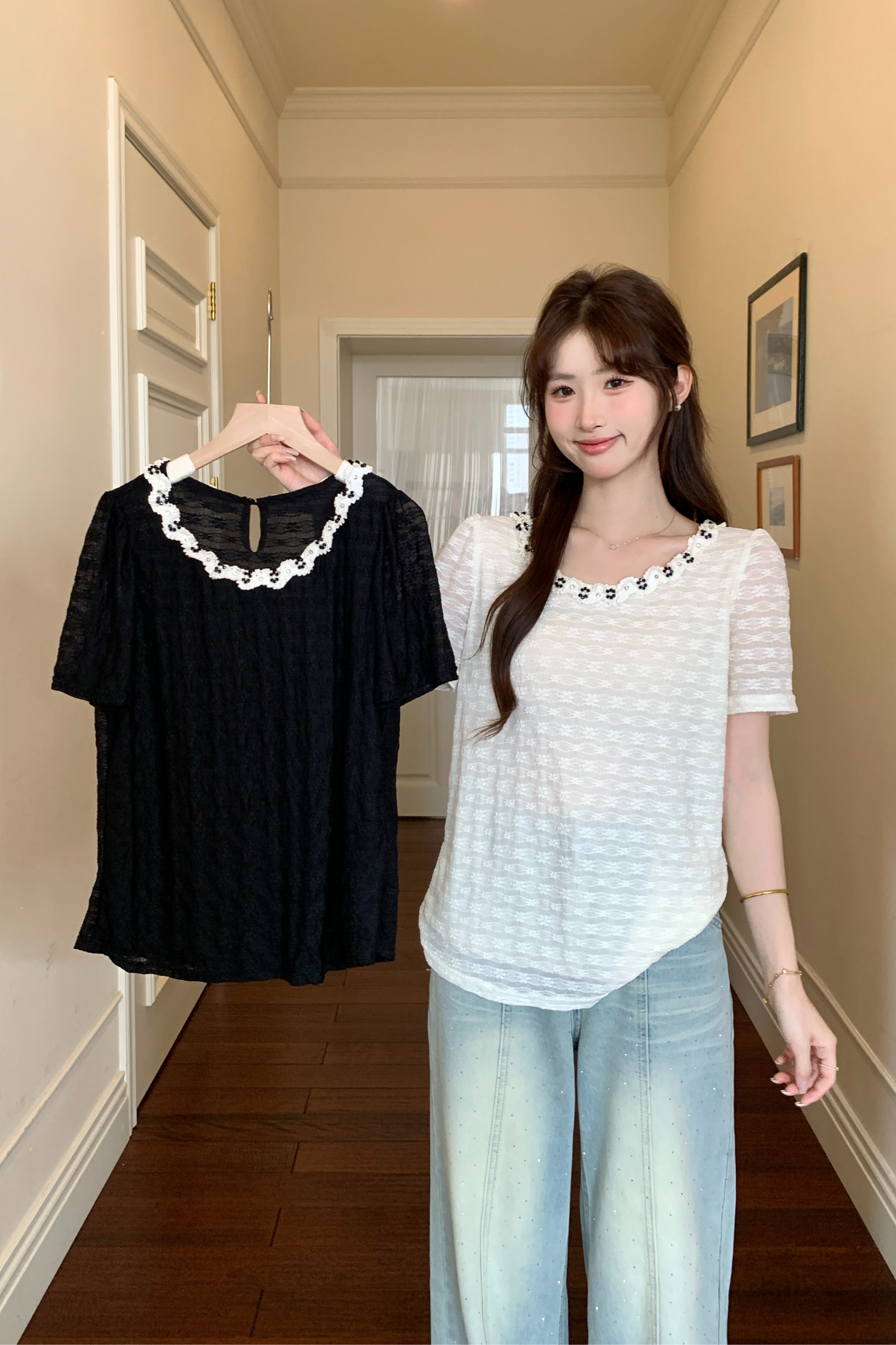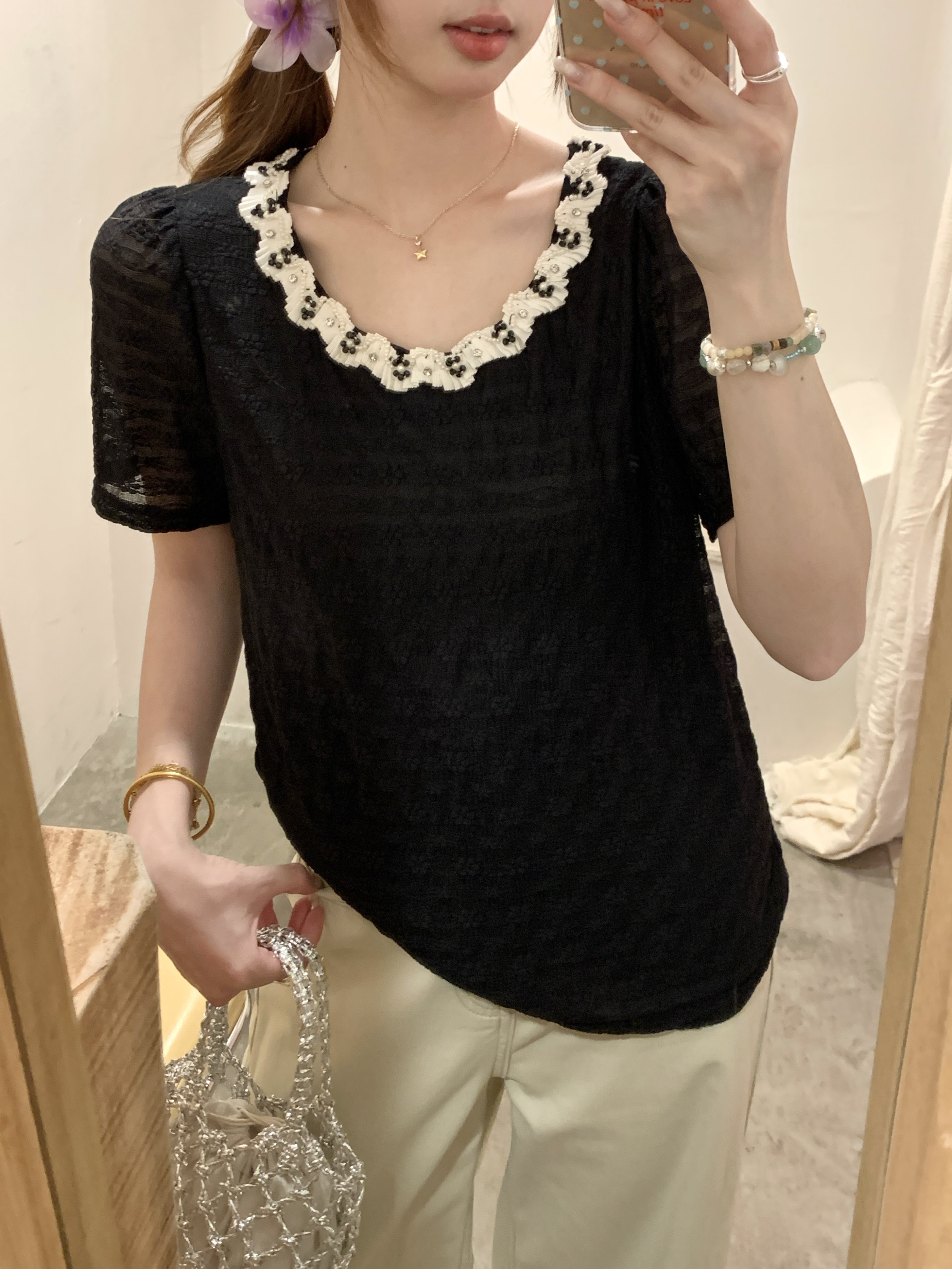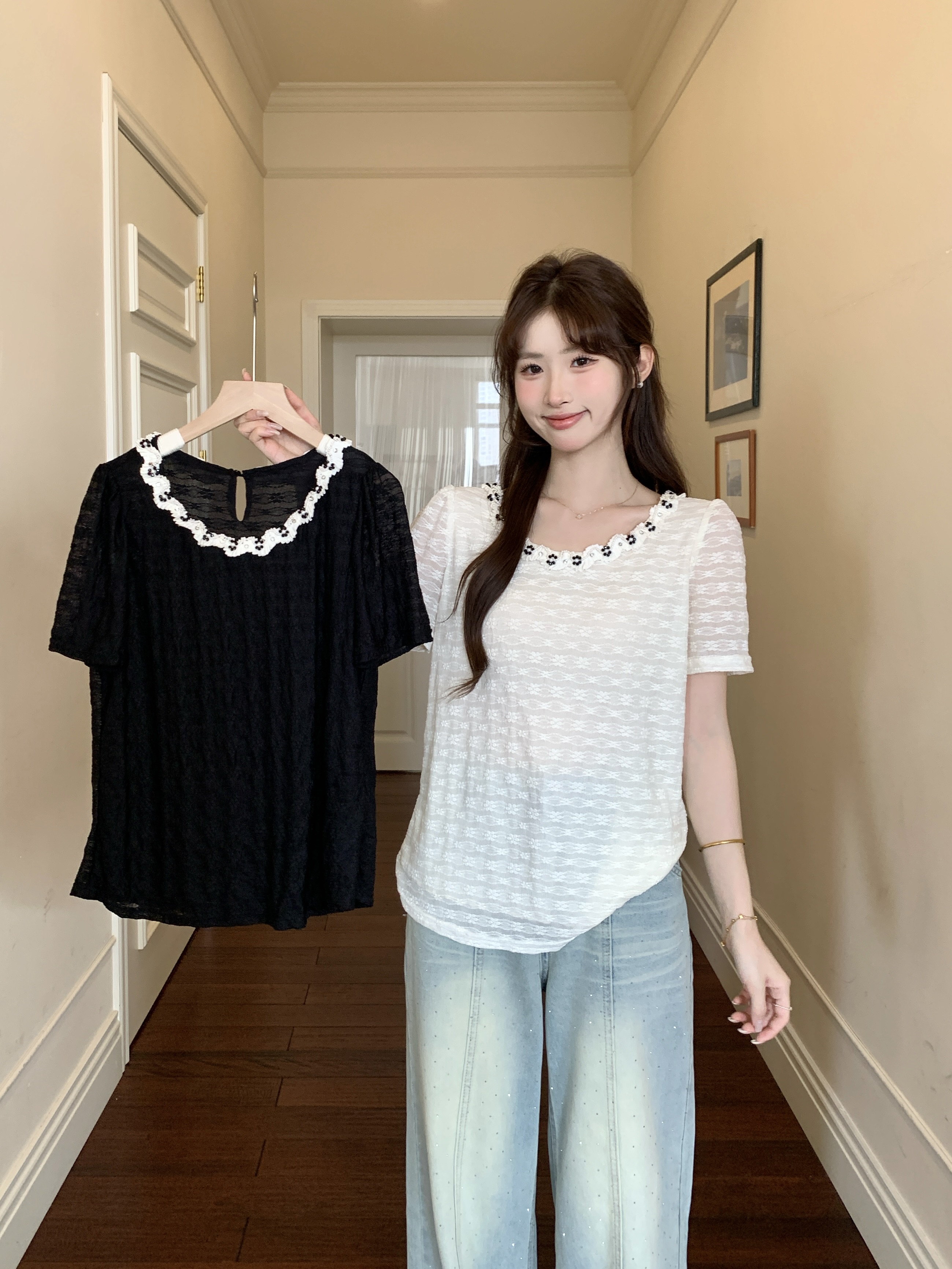 빅 사이즈 프랑스식 빛 럭셔리 검정색 무거운 작업 비즈 박기 레이스 레이스 니트 스웨터 여름 지방 mm 슬림해 보이는 반팔 티셔츠 여성
